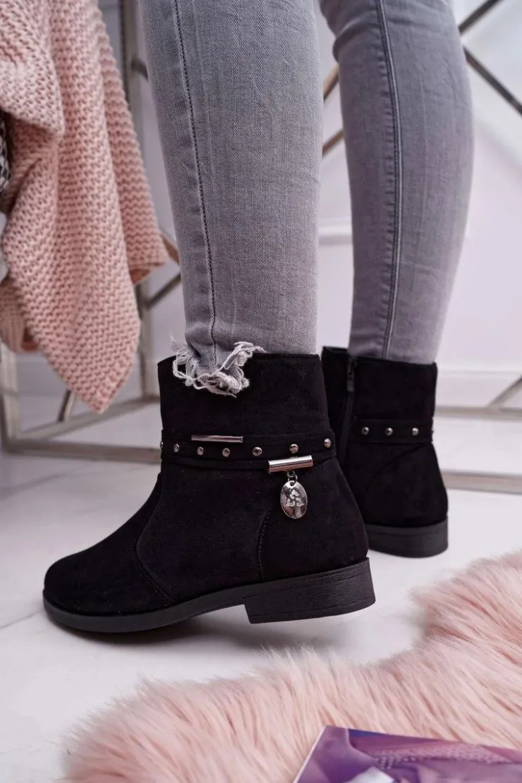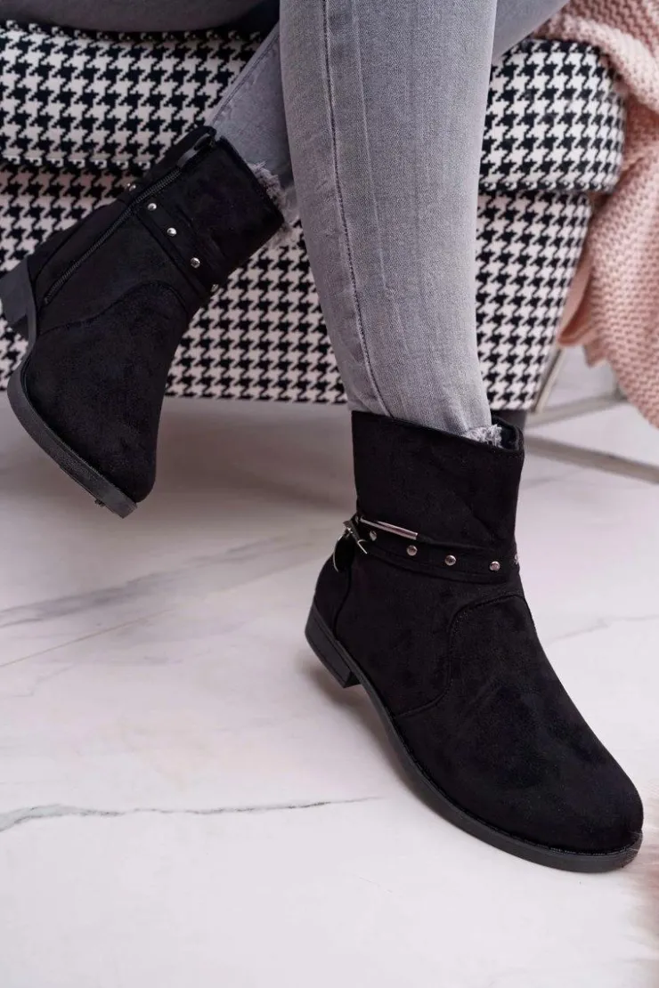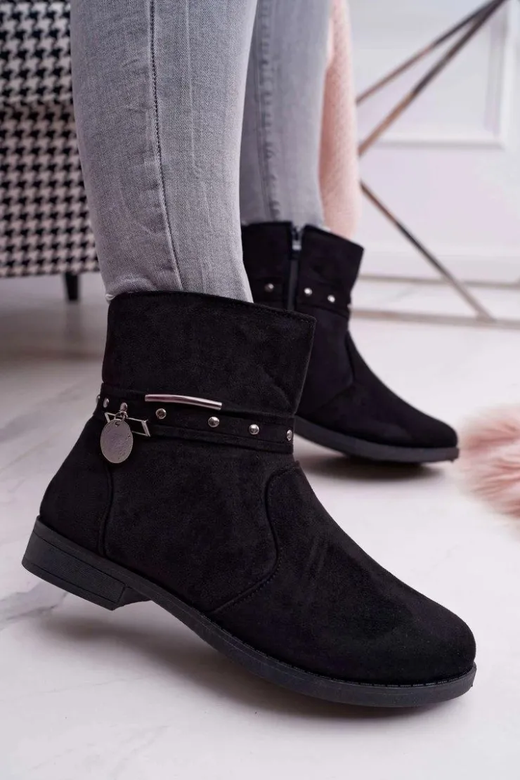 Nie wiesz co na siebie włożyć? To nic prostszego! Wybierz czarne botki, które pasują dosłownie do każdej stylizacji. Eko-zamsz z którego zostały wykonane pięknie wygląda a delikatna klamra wokół kostki nadaje im mocniejszego charakteru. Wnętrze buta pokryte kocem obuwniczym z krótkim włosiem, co zapewni nam komfort i ciepło nawet w chłodniejsze dni. Suwak na boku ułatwi zakładanie. Przy wyborze rozmiaru prosimy sugerować się tabelą rozmiarów.