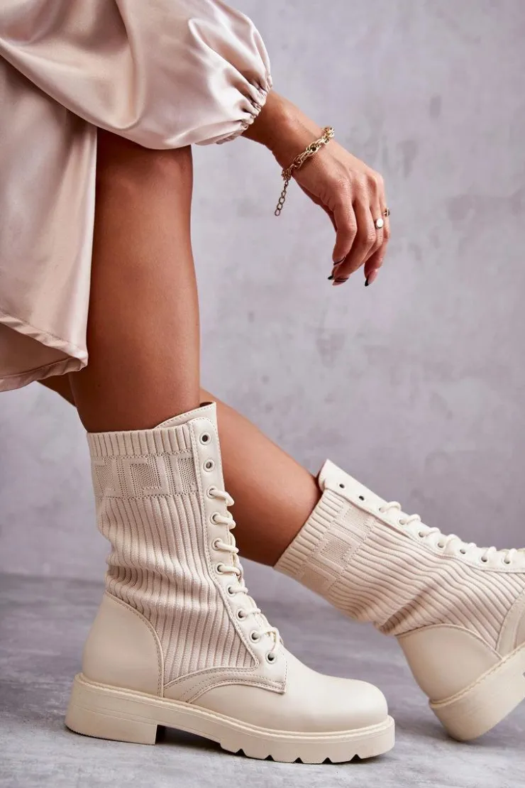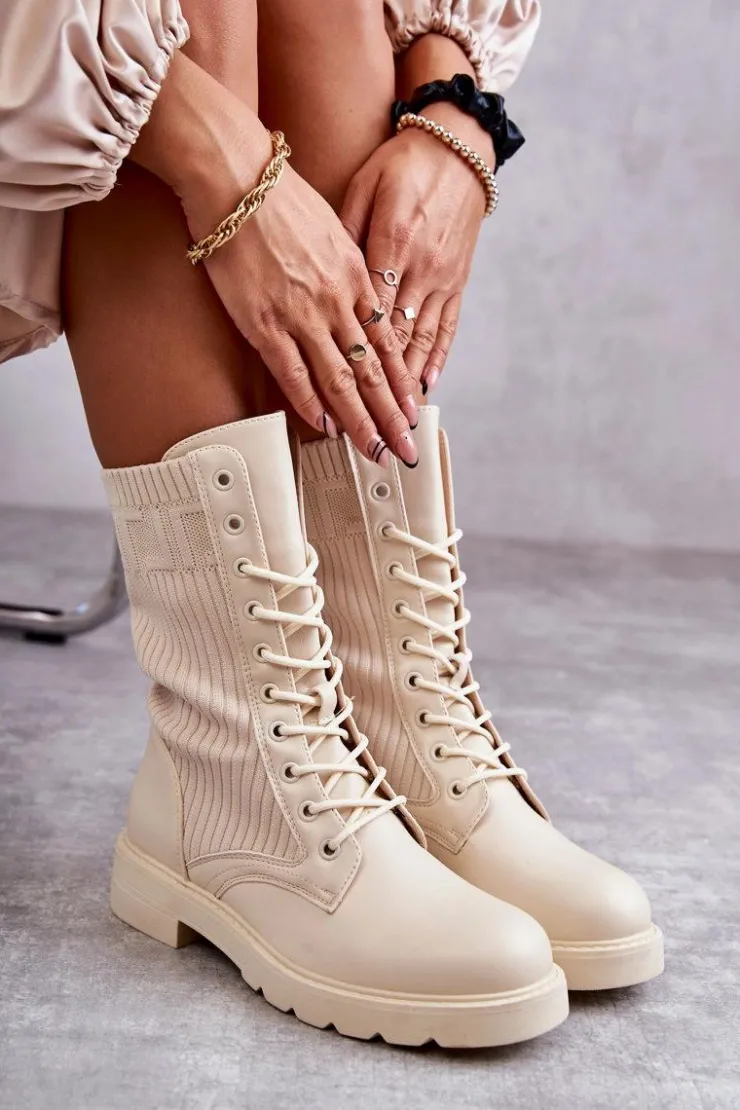 Klasyczne botki z wyższą cholewką wykonaną z połączenia eko skóry oraz elastycznego, prążkowanego materiału. Model klasycznie sznurowany. Botki zostały osadzone na płaskim obcasie i delikatnej platformie. Zapiętek jest usztywniany. Wkładka w tych butach jest ocieplana kocem obuwniczym. Świetny model do wielu stylizacji! Przy wyborze rozmiaru prosimy sugerować się tabelą rozmiarów.