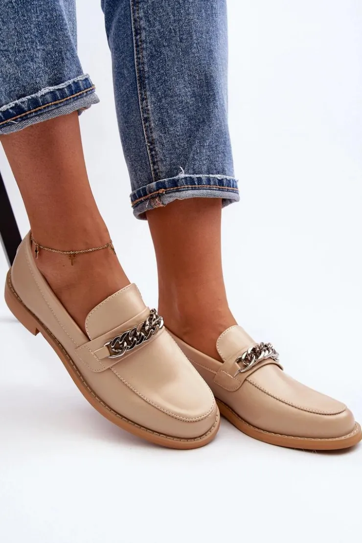 Klasyczne, wsuwane mokasyny damskie z pewnością sprawdzą się w wielu stylizacjach! Wykonane z eko skóry. Osadzone na płaskim obcasie, dzięki któremu są wygodne w użytkowaniu. Model ten posiada ozdobny łańcuch z przodu. Koniecznie powinnaś je mieć w swojej wiosennej garderobie! Przy wyborze rozmiaru prosimy sugerować się tabelą rozmiarów.
