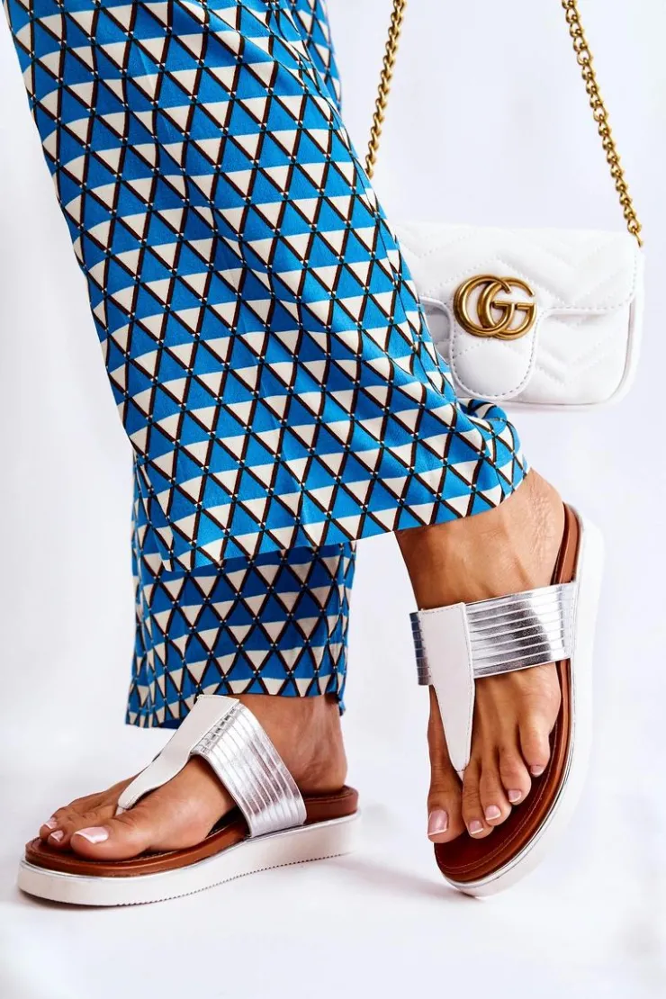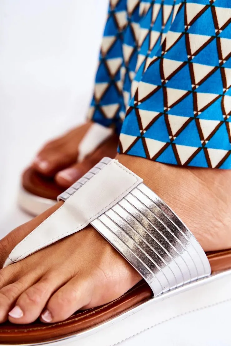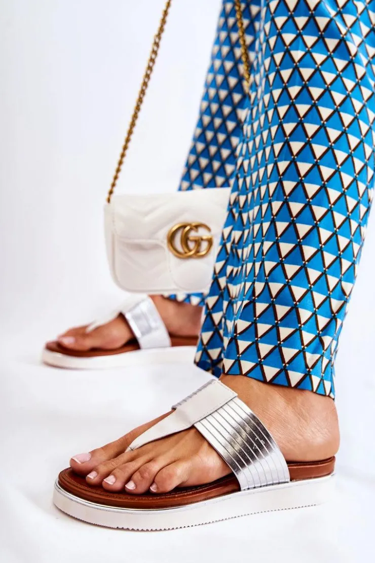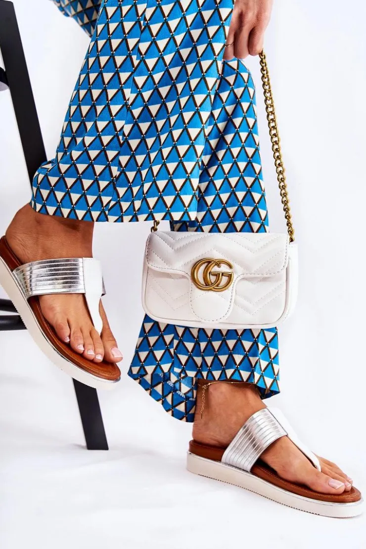 Klasyczne klapki o fasonie japonek. Wykonane z wierzchu z eko skóry. Japonki osadzone na niewysokiej platformie. Podeszwa wykonana z tworzywa sztucznego. Nosek odkryty, zaokrąglony. Miękka wkładka wykonana z eko skóry zapewni komfort oraz wygodę w użytkowaniu. Świetny model na co dzień.