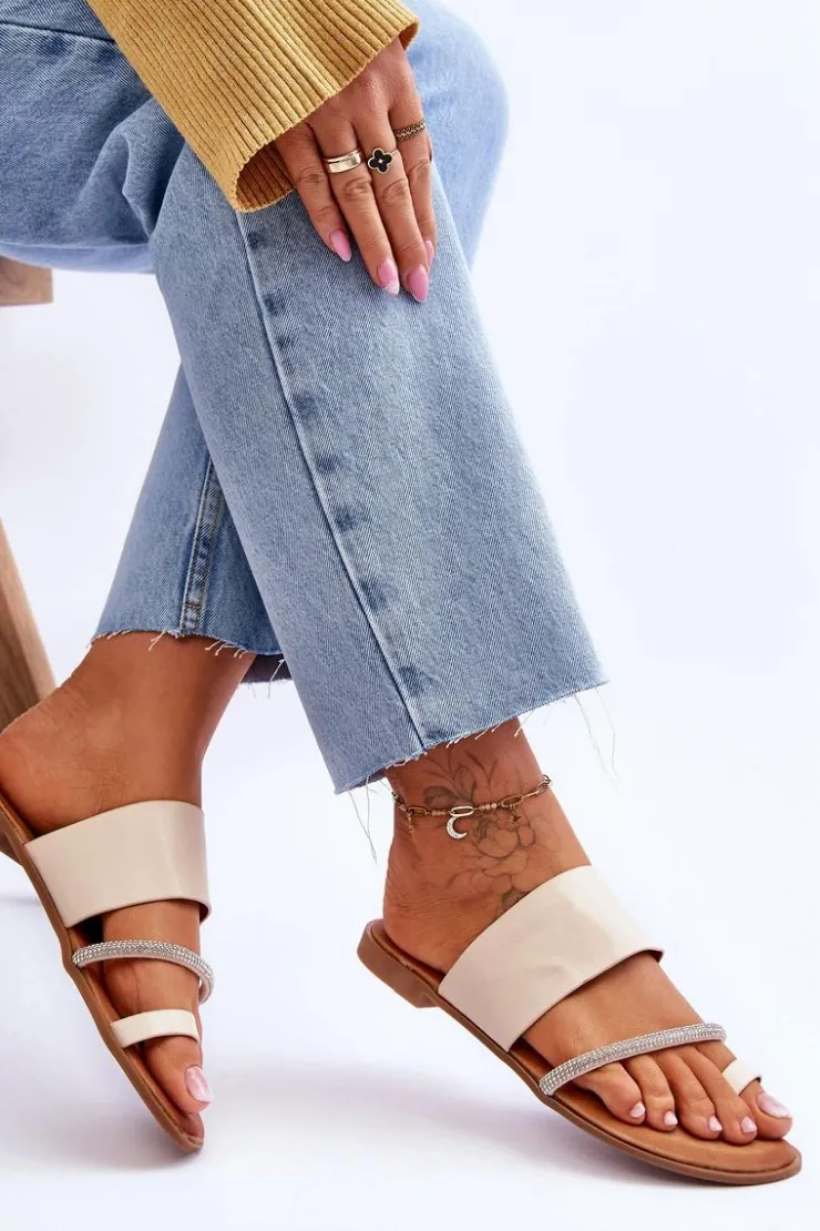 Klasyczne klapki o fasonie japonek zostały wykonane z eko skóry. Posiadają ozdobny paseczek z mieniącymi się dżetami imitującymi cyrkonie. Osadzone na płaskim obcasie z podeszwą z tworzywa sztucznego. Model ten świetnie sprawdzi się do wielu letnich stylizacji. Japonki posiadają miękką, eko skórzaną wkładkę.