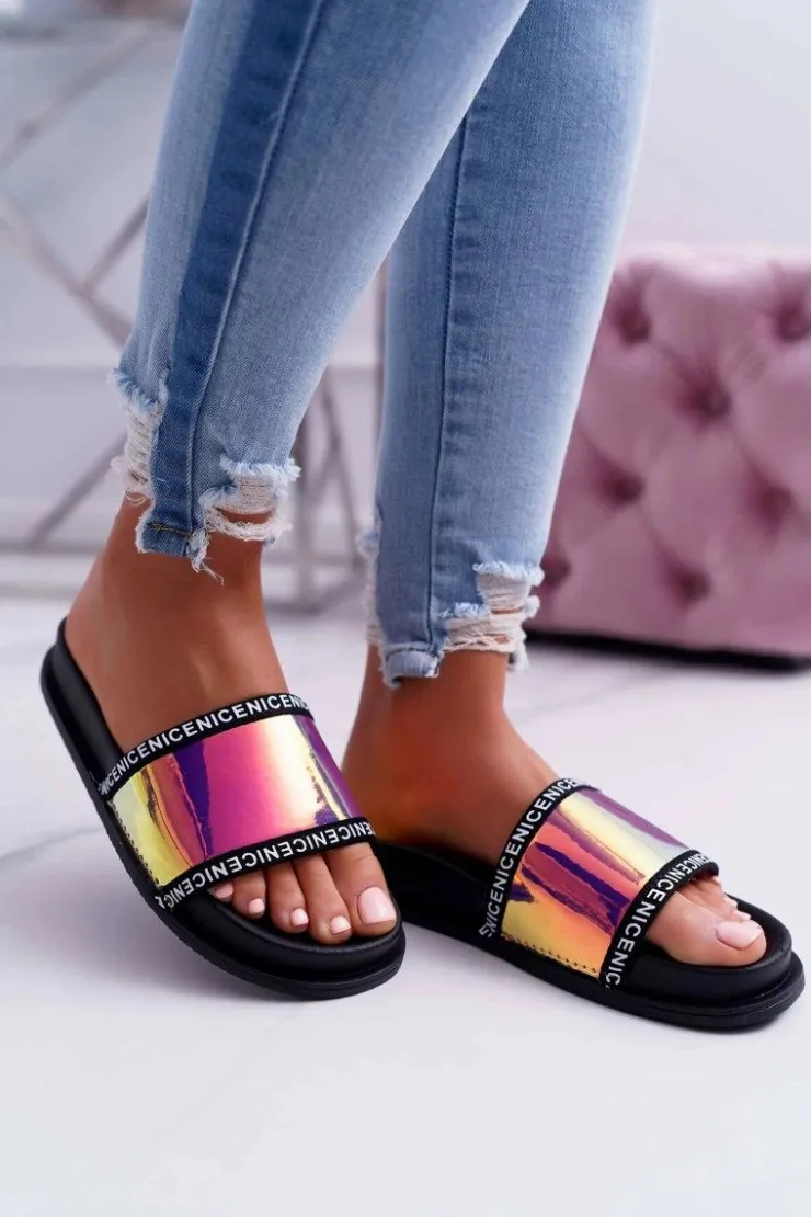 Zapewnij sobie komfort i nienaganny styl! Nasze opalizujące klapki to coś dla Ciebie! Klasyczny czarny kolor oraz wygodna, gumowa wkładka. Nie czekaj dłużej i kup teraz!