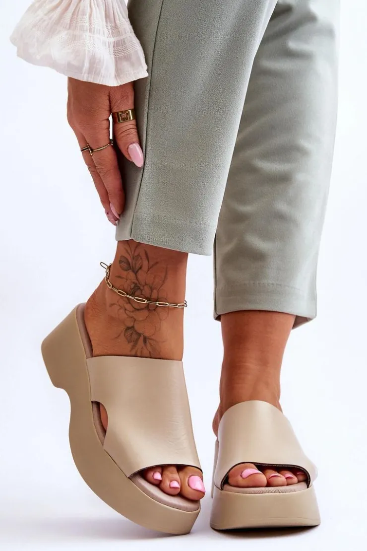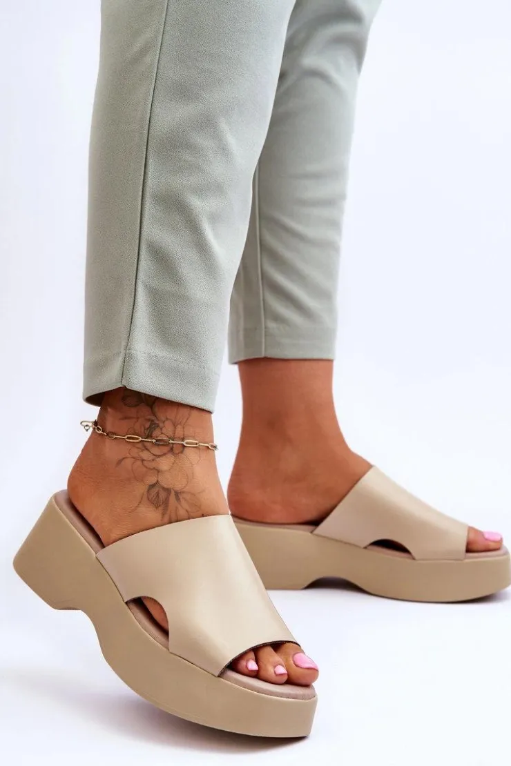 Damskie, klasyczne klapki zostały wykonane z naturalnej skóry z wycięciami. Osadzone na płaskim obcasie z ozdobioną podeszwą. Model ten z pewnością przypadnie do gustu każdej kobiecie ceniącej sobie styl oraz wygodę. Miękka, skórzana wkładka pozwoli na komfortowe użytkowanie obuwia nawet przez cały dzień. Przy wyborze rozmiaru prosimy sugerować się tabelą rozmiarów.