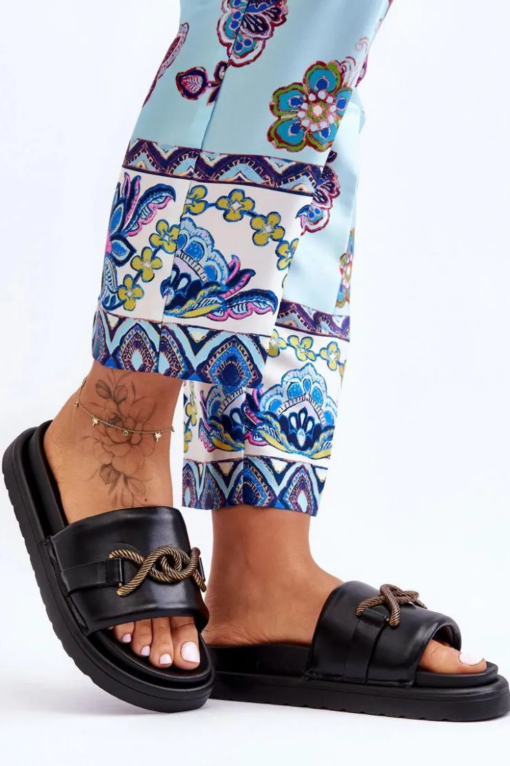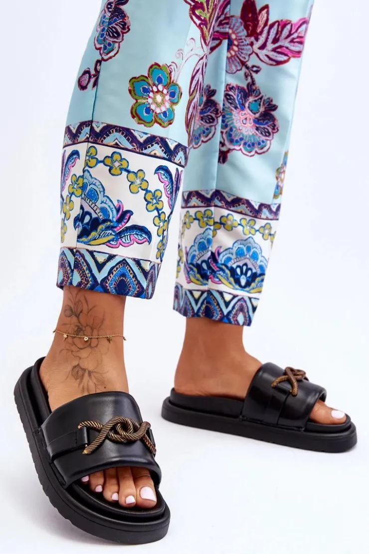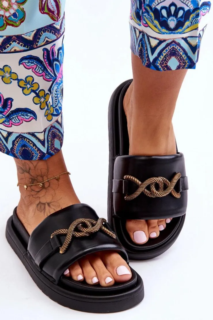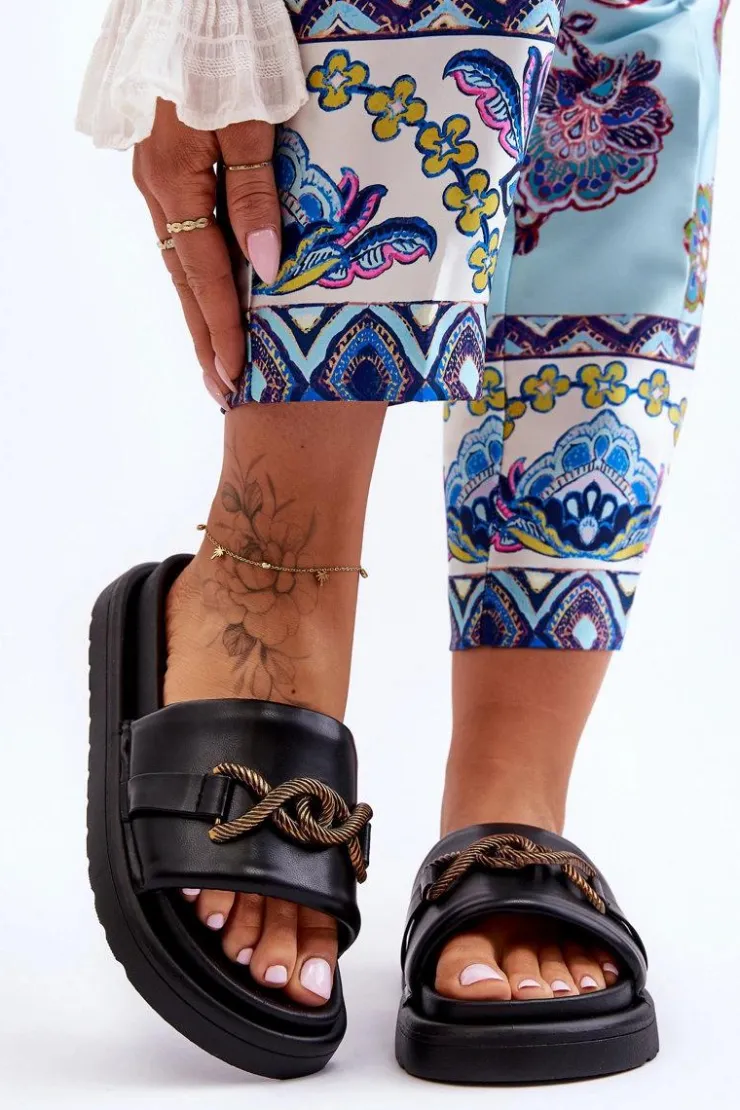 Klasyczne, damskie klapki zostały wykonane z eko skóry. Model ten posiada na przodzie ozdobę w postaci imitacji plecionego sznura. Klapki osadzono na delikatnej platformie. Wkładka jest profilowana i wygodna w użytkowaniu. Nosek w tym obuwiu jest odkryty i lekko zaokrąglony. Ten model powinien znaleźć się właśnie w Twojej garderobie! Przy wyborze rozmiaru prosimy sugerować się tabelą rozmiarów.