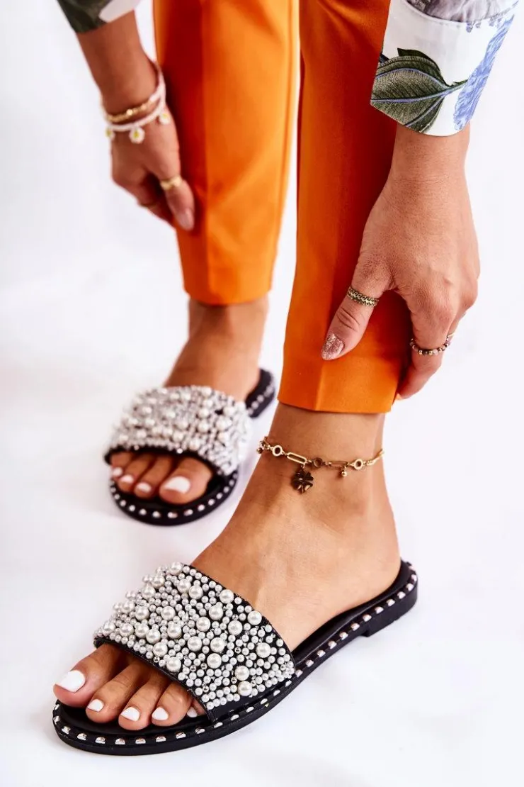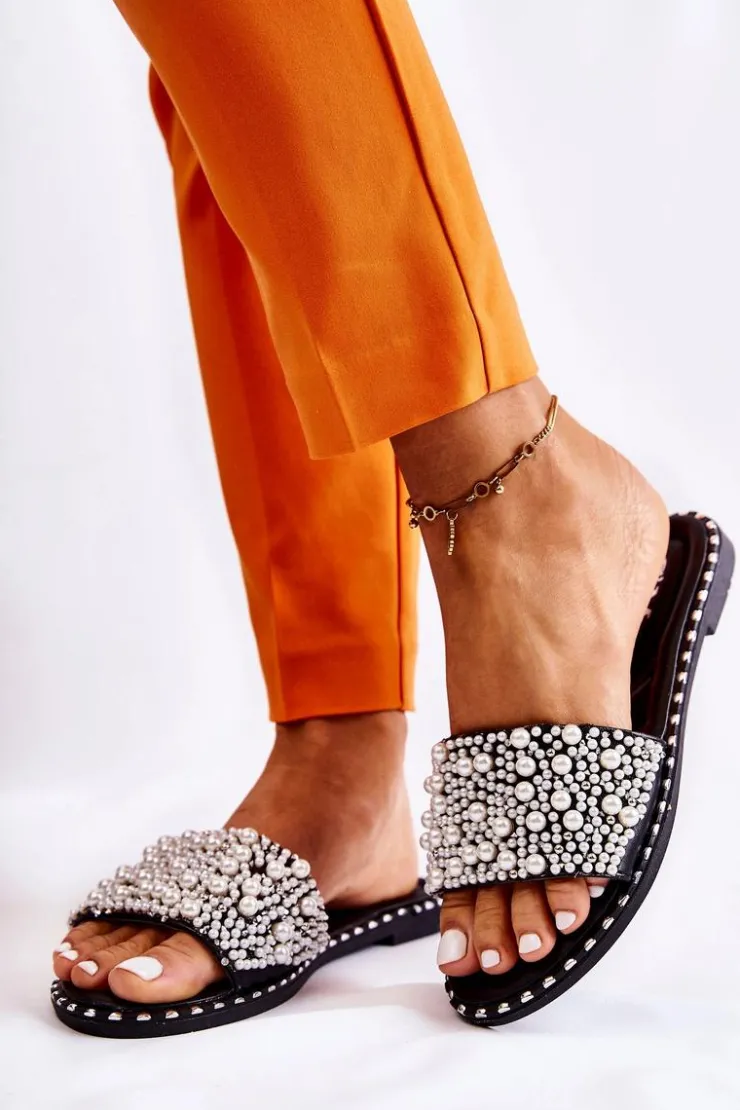 Eleganckie klapki damskie wykonane z eko skóry. Posiadają ozdoby na przednim pasku w postaci imitacji perełek oraz cyrkonii. Klapki posiadają wokół podeszwy dekoracyjne ćwieki. Miękka wkładka wykonana z eko skóry, która jest dodatkowo pikowana. Nosek odkryty, zaokrąglony. Osadzone na płaskim obcasie. Podeszwa wykonana z gumowego tworzywa, która jest dodatkowo antypoślizgowa. Solidny model, idealny na letnie dni! Przy wyborze rozmiaru prosimy sugerować się tabelą rozmiarów.