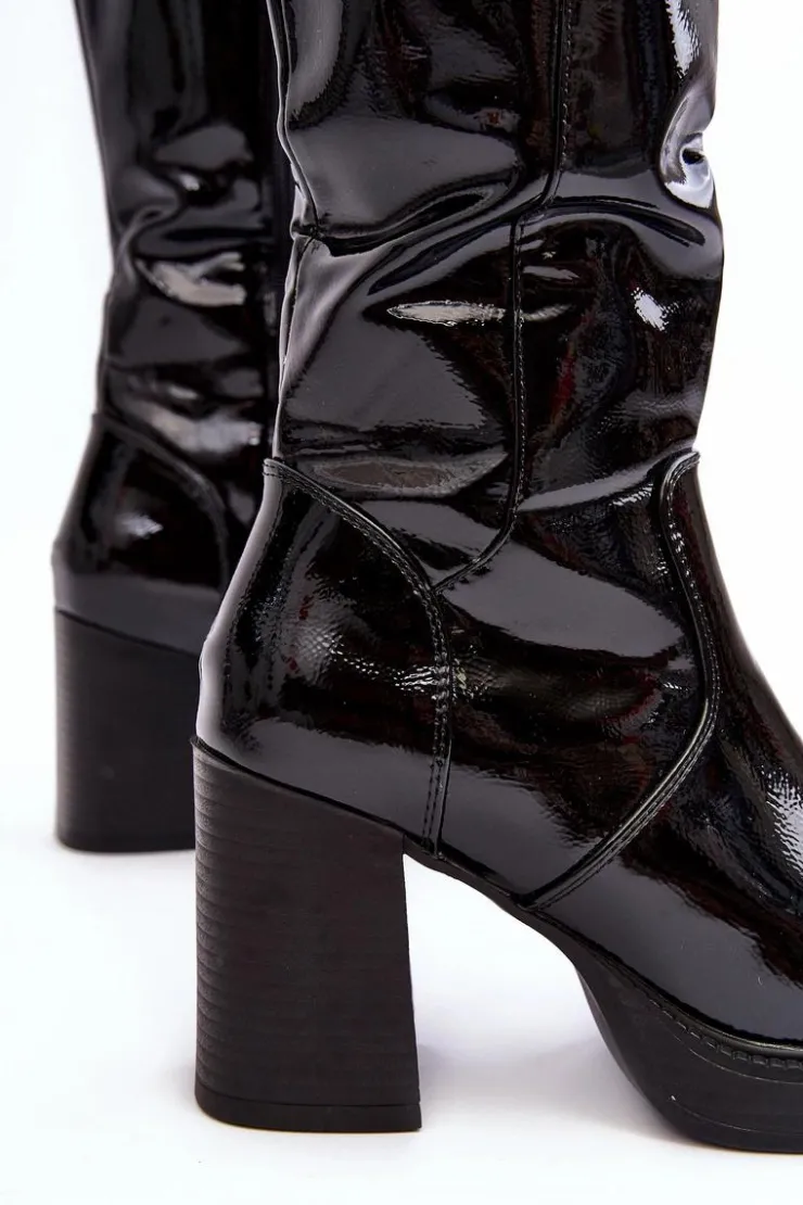 Modne kozaki damskie z cholewką do kolana. Wykonane z eko skóry. Osadzone na obcasie w postaci słupka. Zapinane na suwak z boku. Noski zaokrąglone. Usztywniony zapiętek. Eko skórzana wkładka zapewni komfort użytkowania. Idealny model zarówno do sukienek, jak i spodni! Przy wyborze rozmiaru prosimy sugerować się tabelą rozmiarów.