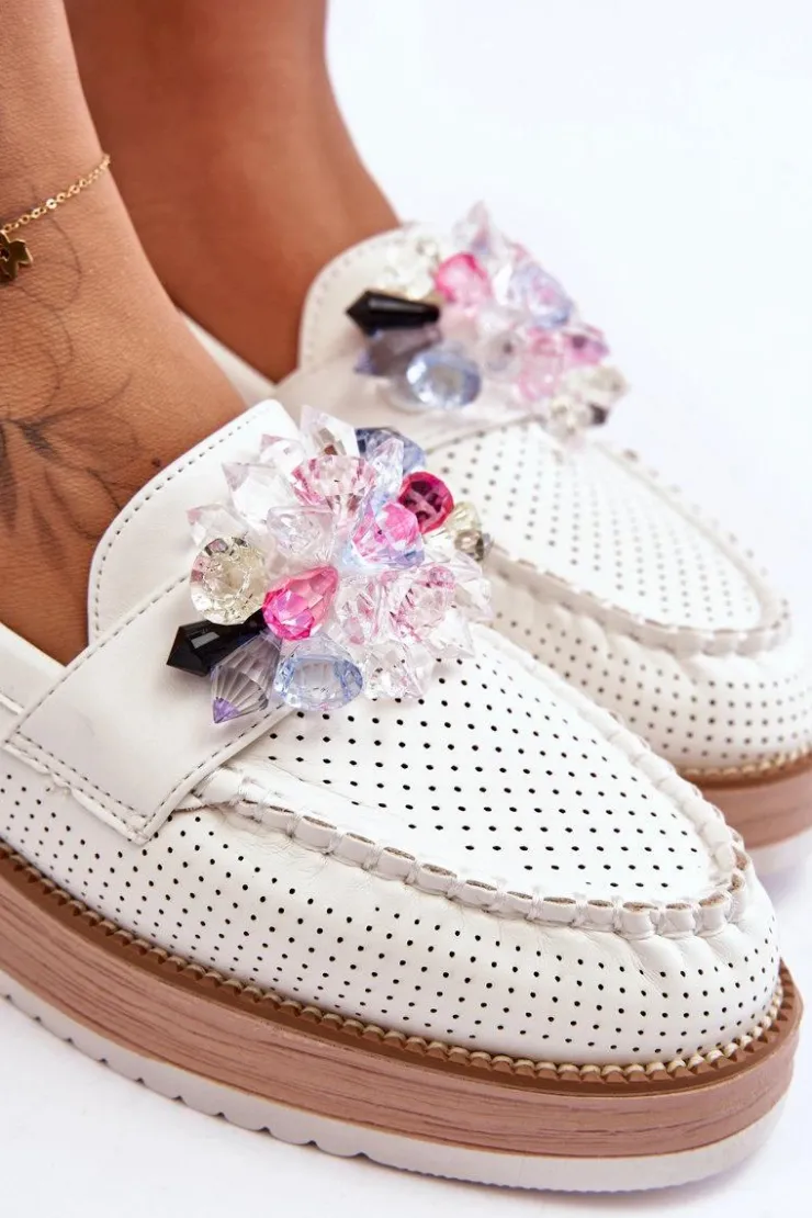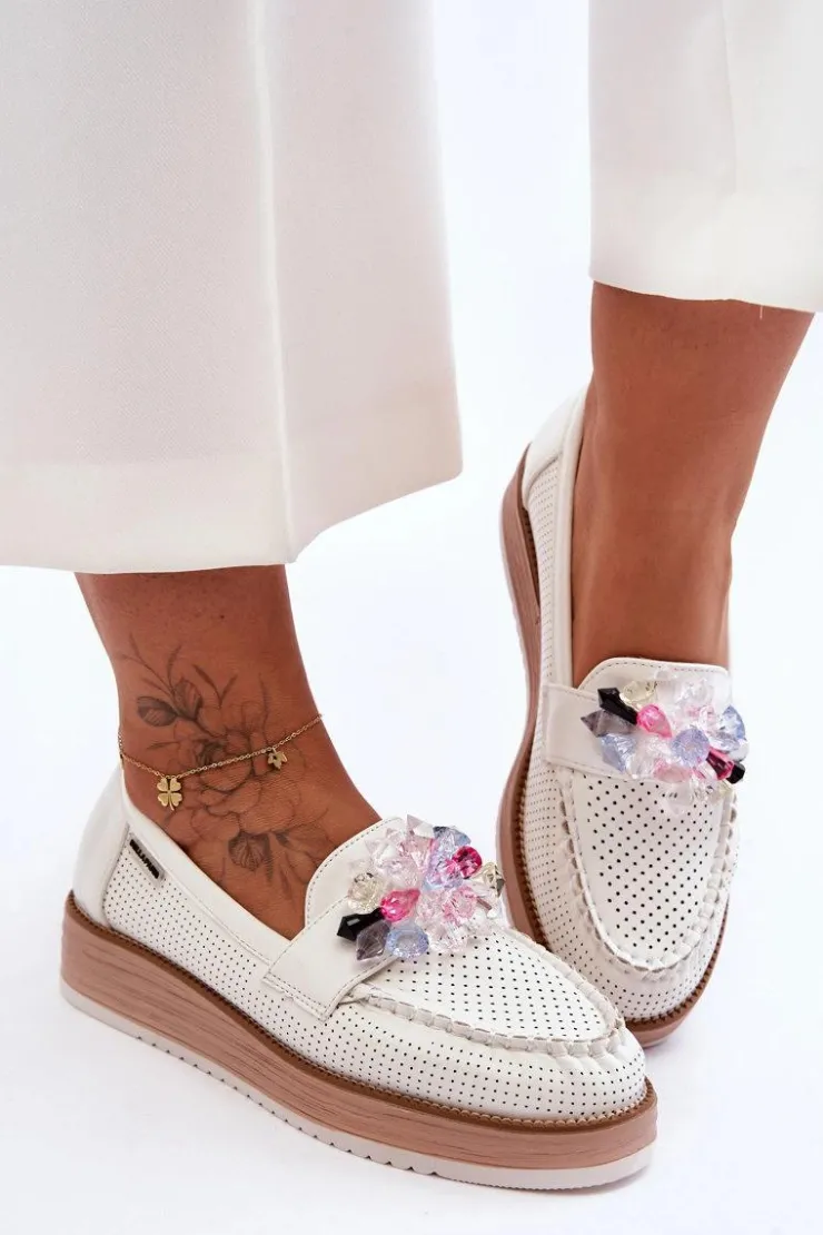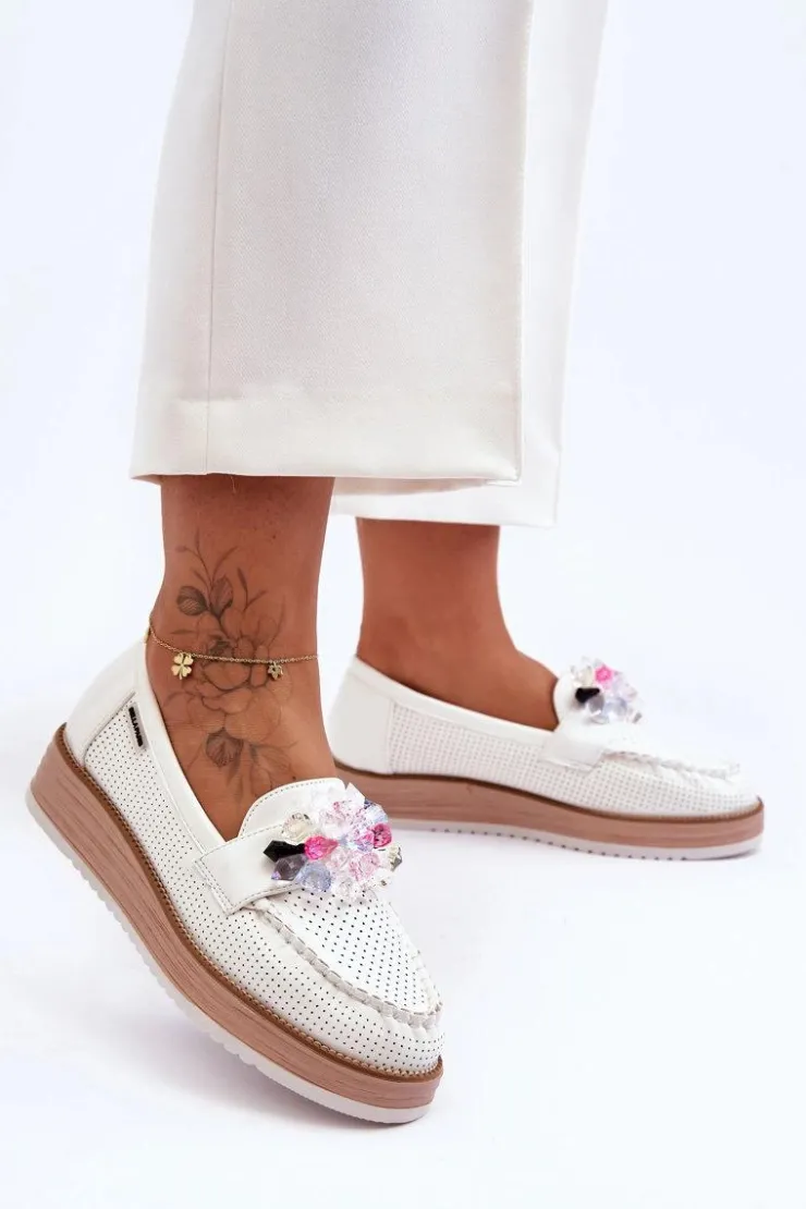Piękne mokasyny damskie zostały osadzone na delikatnym koturnie i platformie. Wykonane z eko skóry z perforacją. Miękka wkładka z naturalnej skóry zapewni wygodę podczas użytkowania. Na przodzie znajdują się ozdobne kamienie o różnych kolorach. Ten model jest świetny do wiosenno-jesiennych stylizacji! Przy wyborze rozmiaru prosimy sugerować się tabelą rozmiarów.