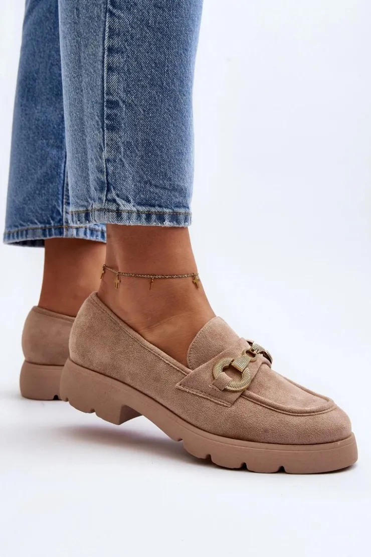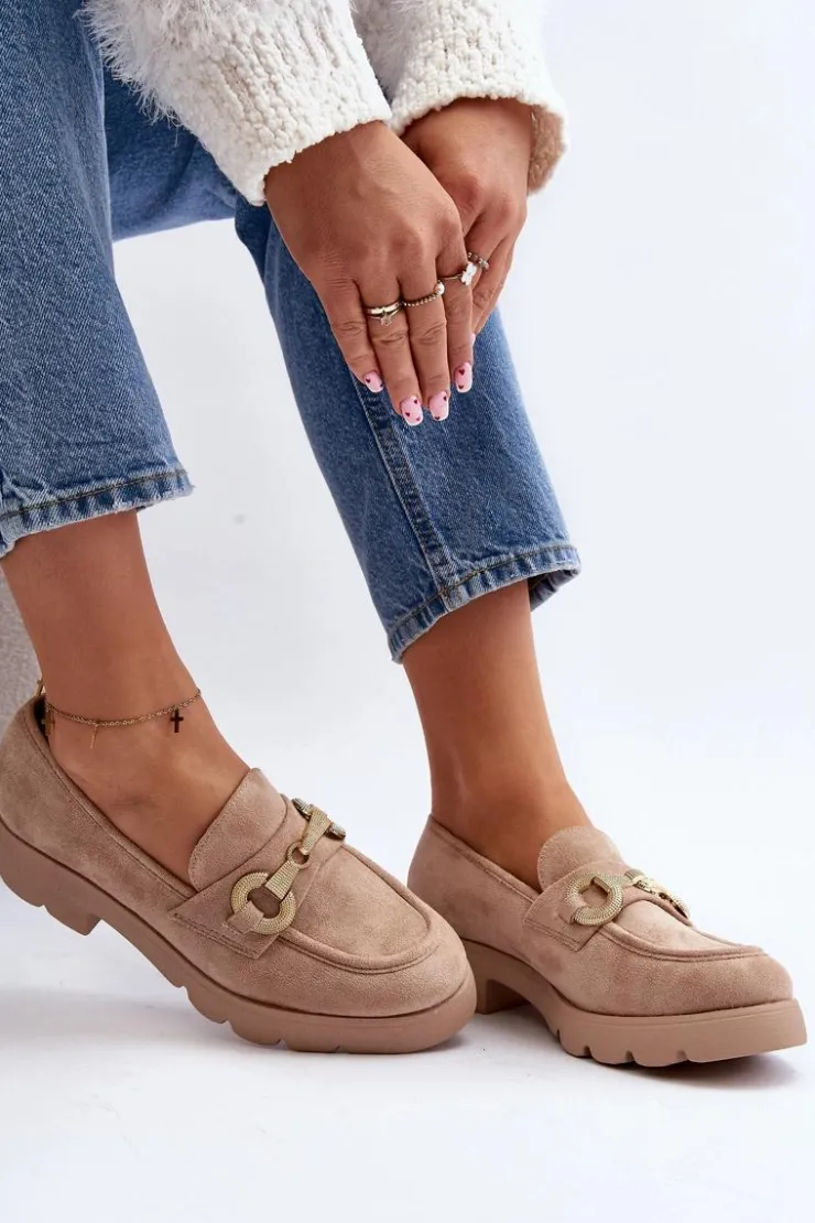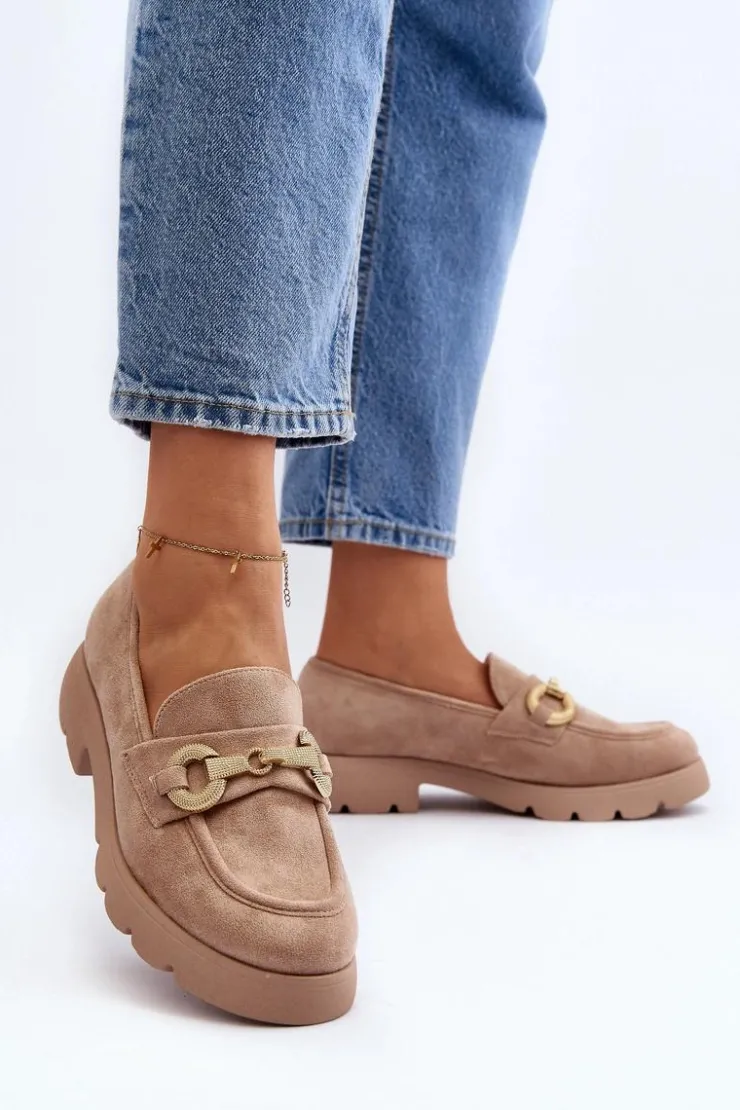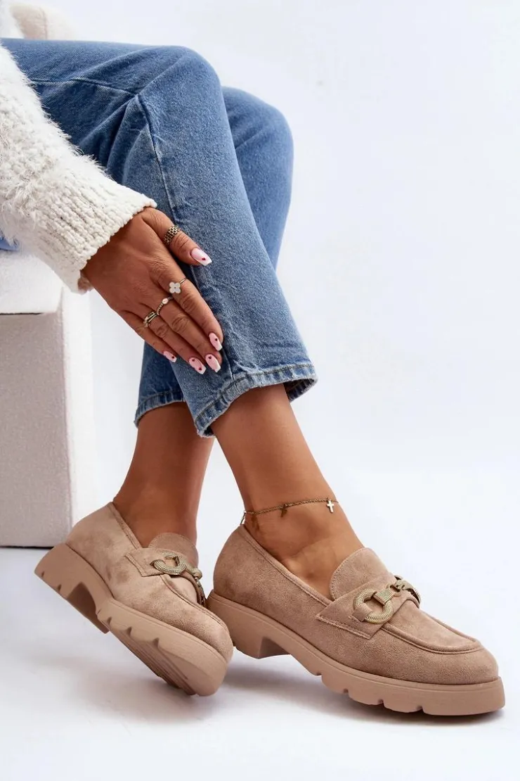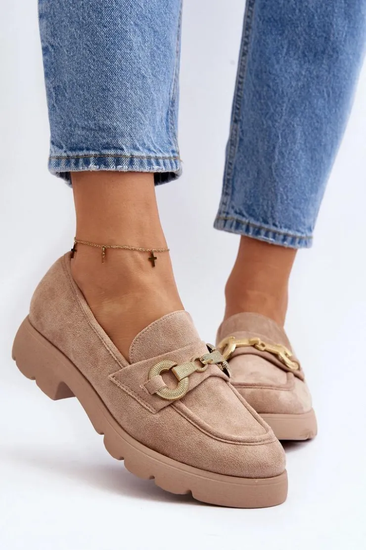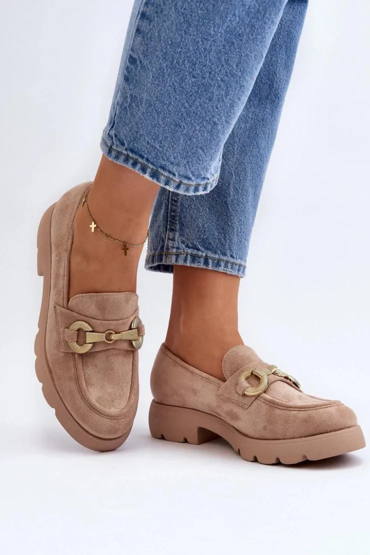 Mokasyny damskie wykonane z miłego w dotyku eko zamszu. Osadzona na płaskim obcasie. Noski zaokrąglone. Z przodu złota ozdoba. Wkładka z eko skóry zapewni wygodę podczas noszenia. Ten modny fason z pewnością wykorzystasz do wielu stylizacji! Przy wyborze rozmiaru prosimy sugerować się tabelą rozmiarów.