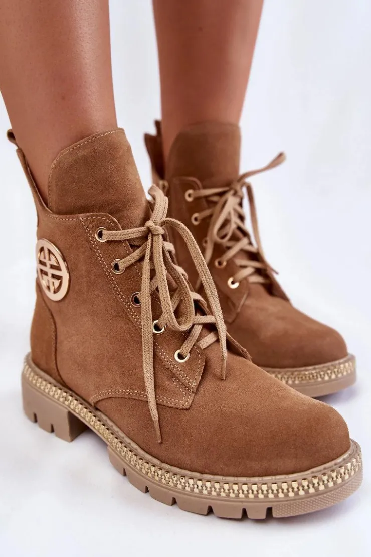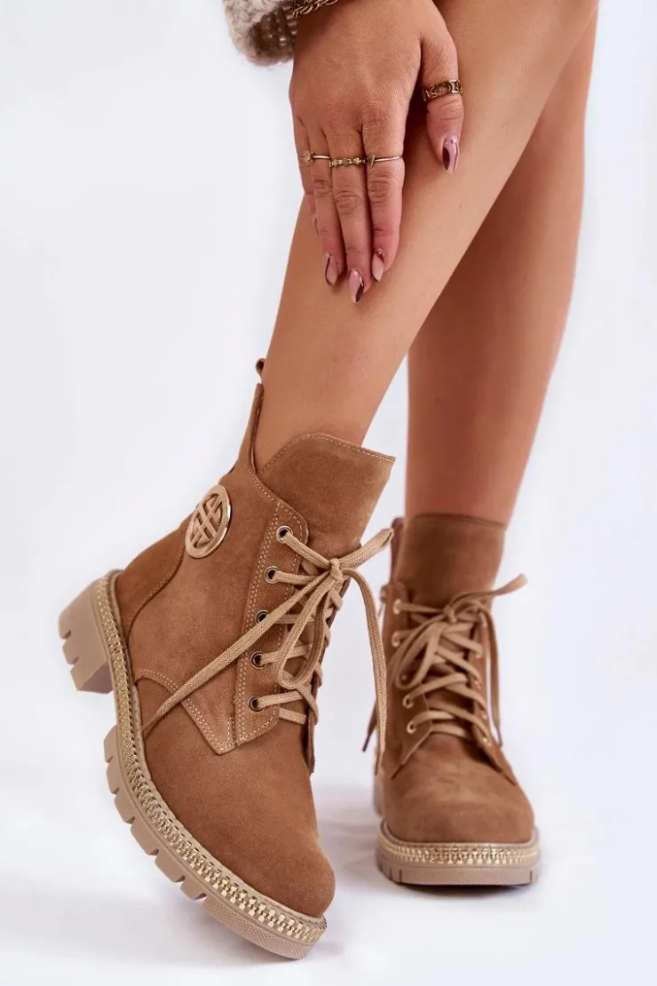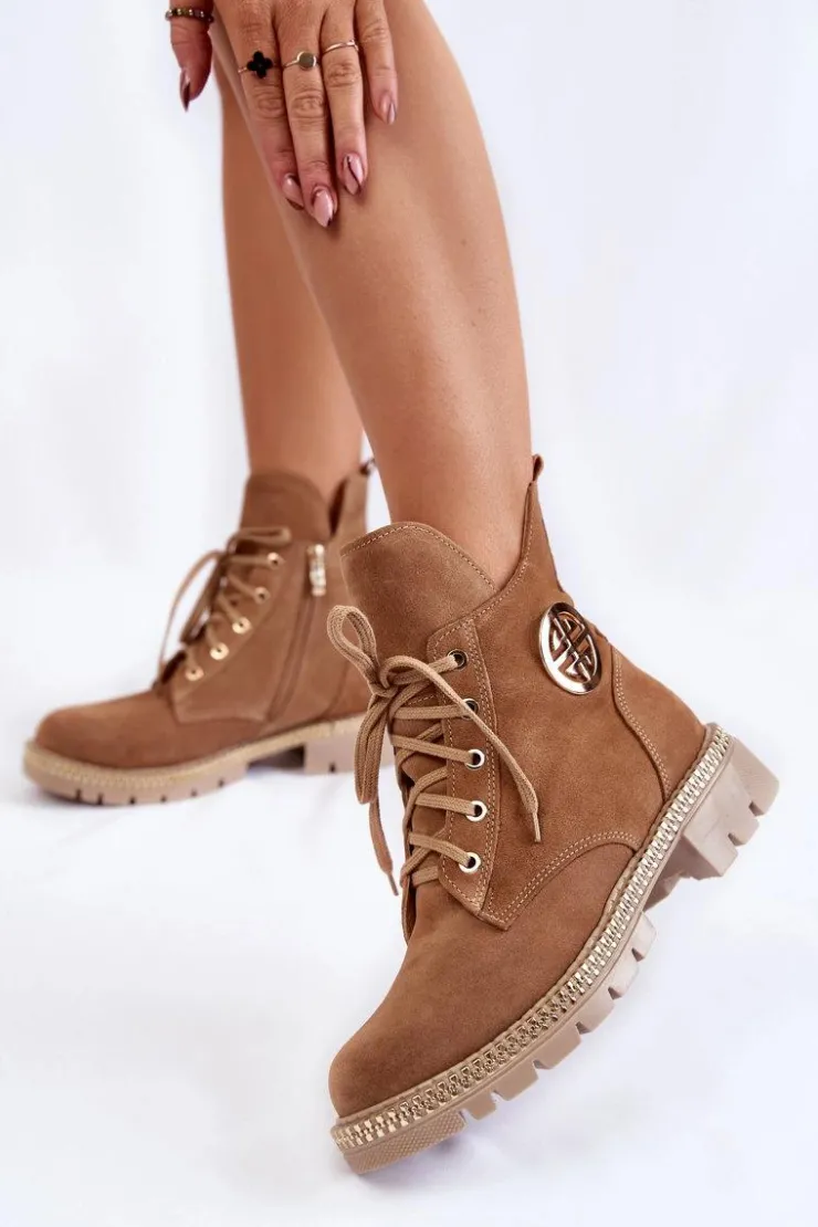 Modne botki damskie zostały wykonane z wysokiej jakości naturalnej skóry. Model ten jest sznurowany, a także zapinany na suwak. Botki posiadają ocieplenie w postaci koca obuwniczego oraz usztywniany zapiętek. Osadzone na płaskim obcasie i platformie ze żłobieniami. Dodatkowo podeszwa została ozdobiona imitacją suwaka i jest antypoślizgowa.Przy wyborze rozmiaru prosimy sugerować się tabelą rozmiarów.