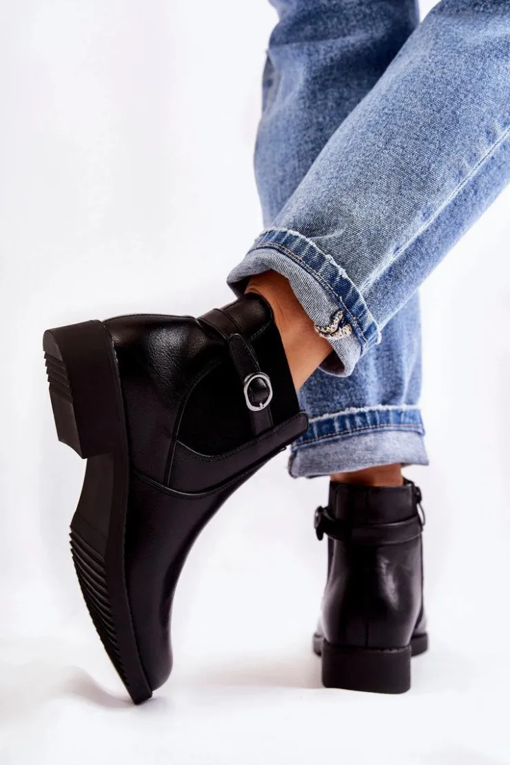 Damskie botki zostały wykonane z eko skóry. Posiadają ozdobną klamrę na cholewce oraz suwak ułatwiający zakładanie obuwia. Dodatkowo zapiętek w tych butach jest usztywniany. Osadzone na płaskim obcasie, co sprawia, że są niezwykle stabilne podczas użytkowania. Wnętrze botków zostało ocieplone miłym w dotyku kocem obuwniczym. Świetny model do wielu stylizacji! Przy wyborze rozmiaru prosimy sugerować się tabelą rozmiarów.
