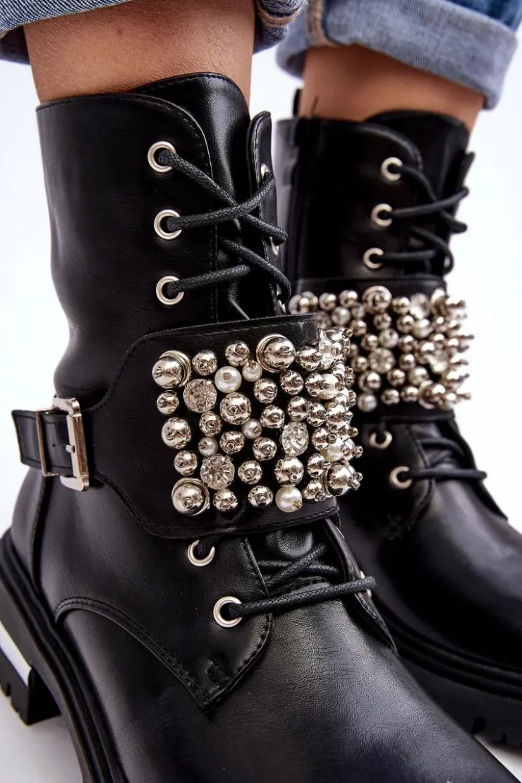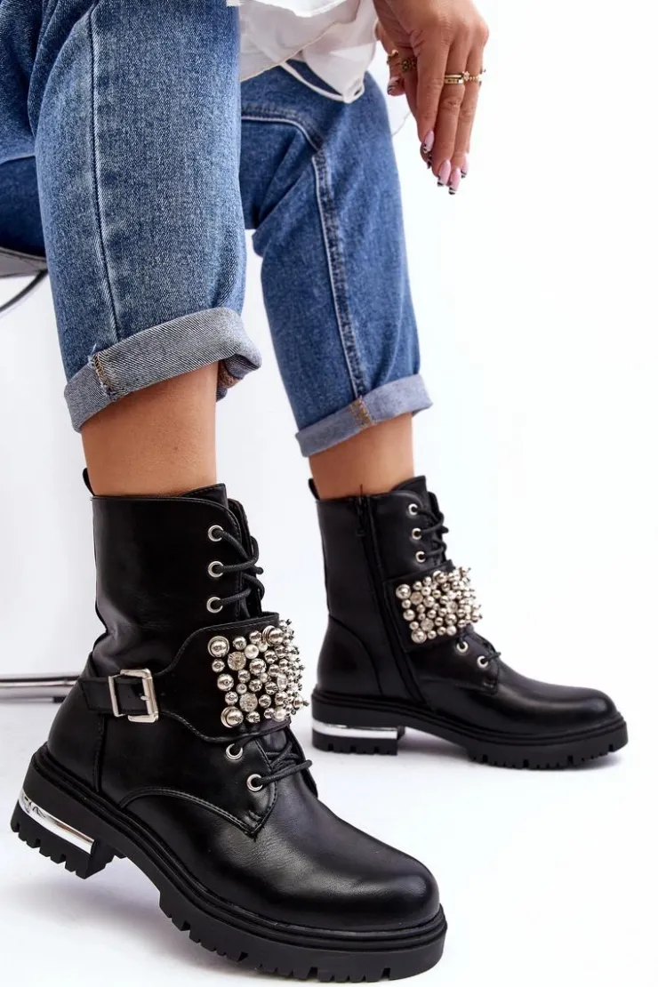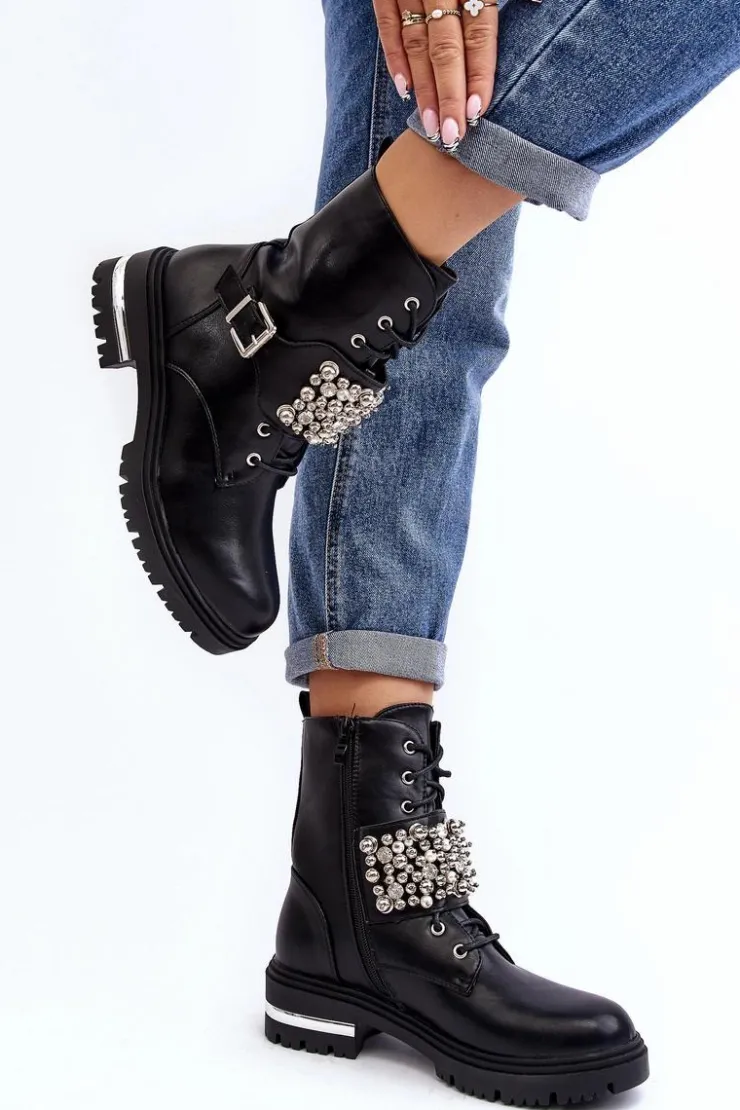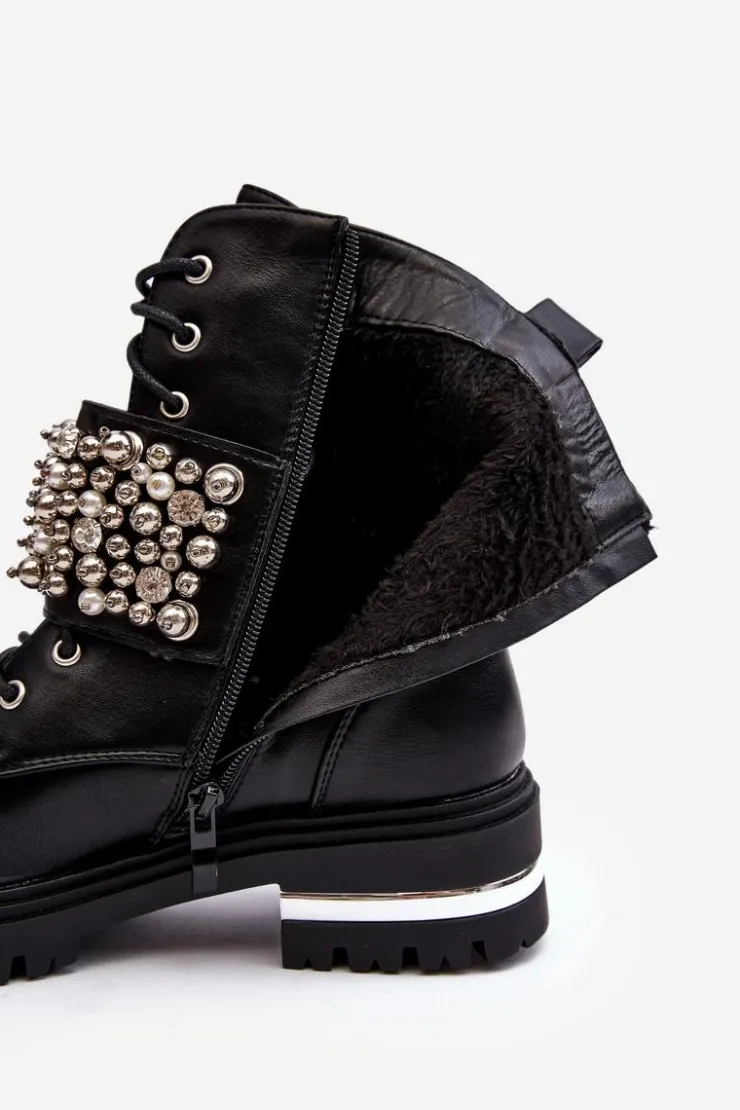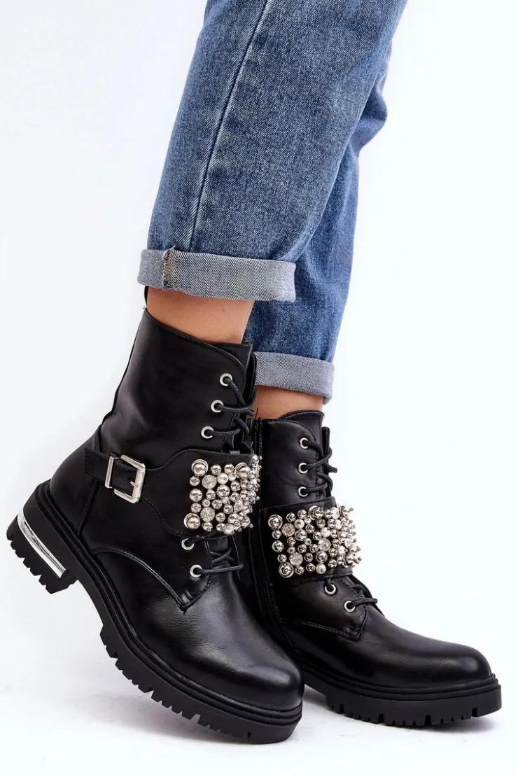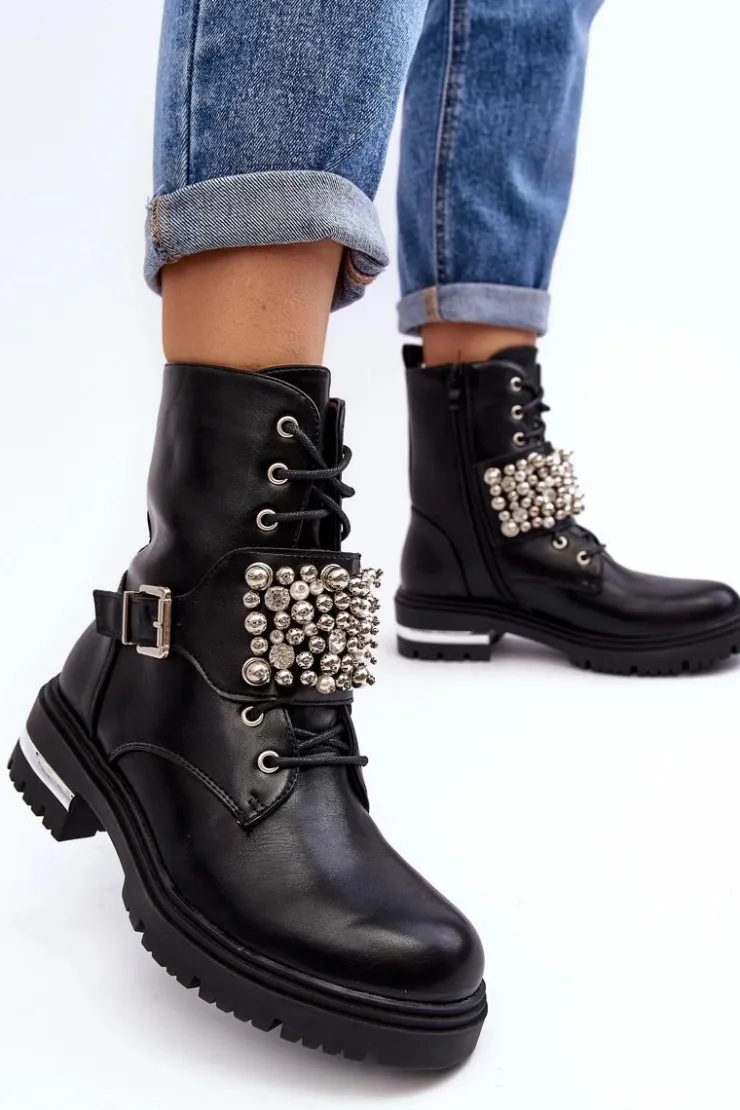 Damskie Boto Damskie Ocieplane Botki Workery Zdobione Czarne Lennen
