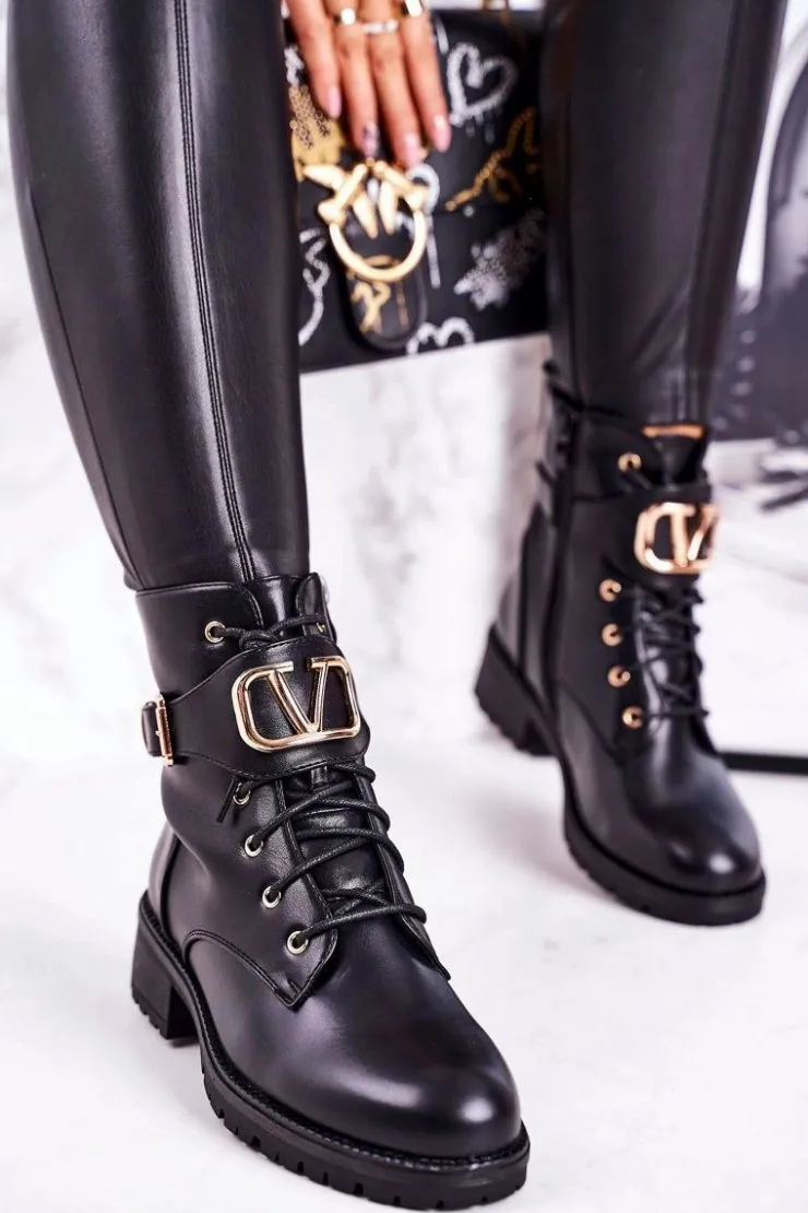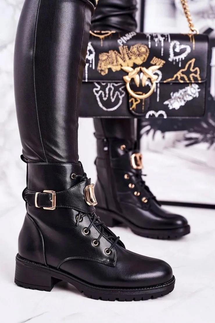 Damskie Boto Damskie Ocieplane Botki Workery Złota Klamra Czarne Vera