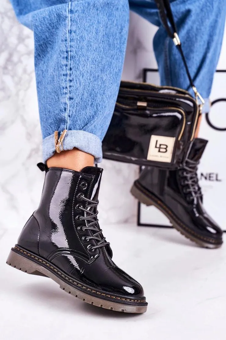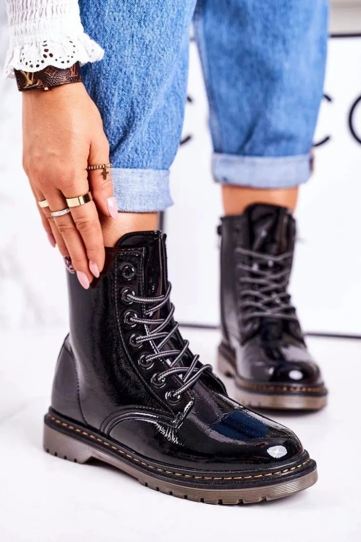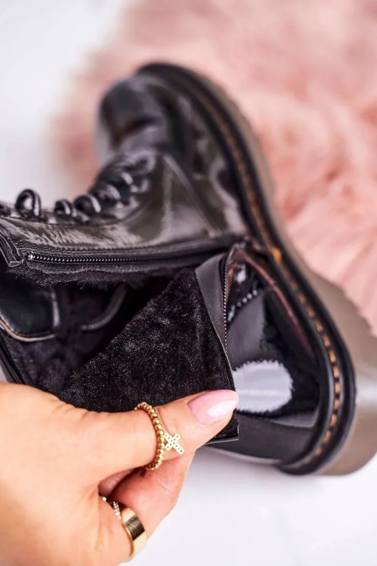 Damskie Boto Damskie Ocieplane Trapery Glany Lakierowane Czarne Thunder