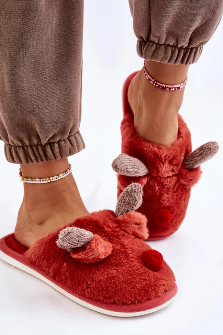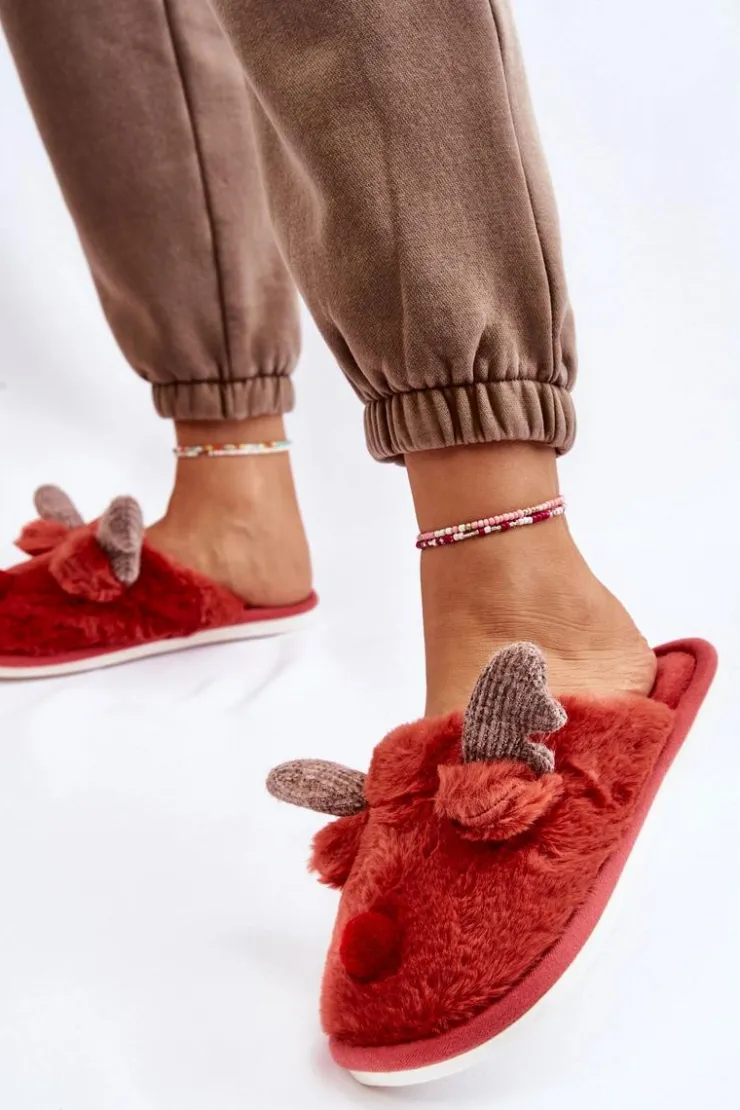 Piękny model papci damskich powinien zagościć w Twoim domu! Wykonane z miękkiego, futrzanego materiału. Ozdobione z przodu porożem, uszkami oraz noskiem z materiału. Klasyczny, wsuwany model został wewnątrz ocieplony futerkiem. Papcie osadzono na gumowej platformie. Świetny model na mroźne dni! Przy wyborze rozmiaru prosimy sugerować się tabelą rozmiarów.