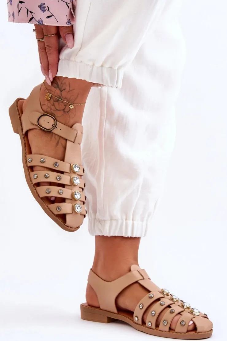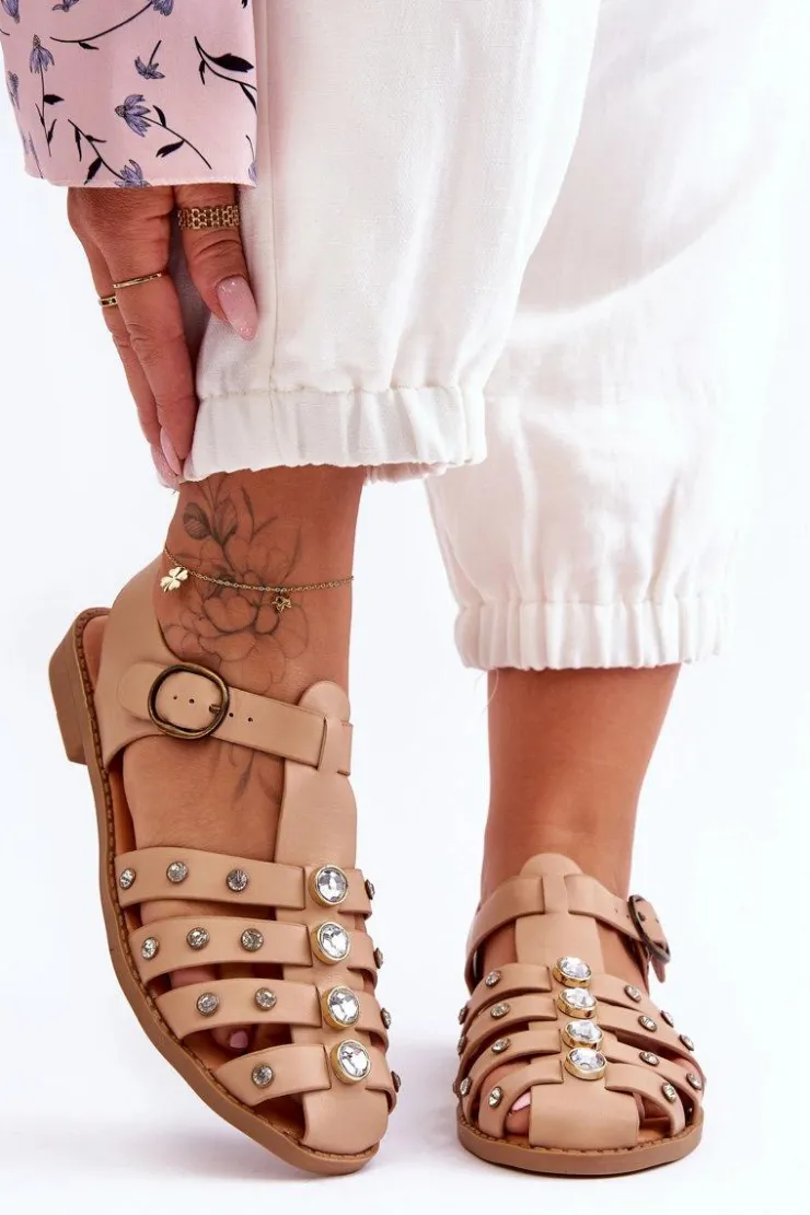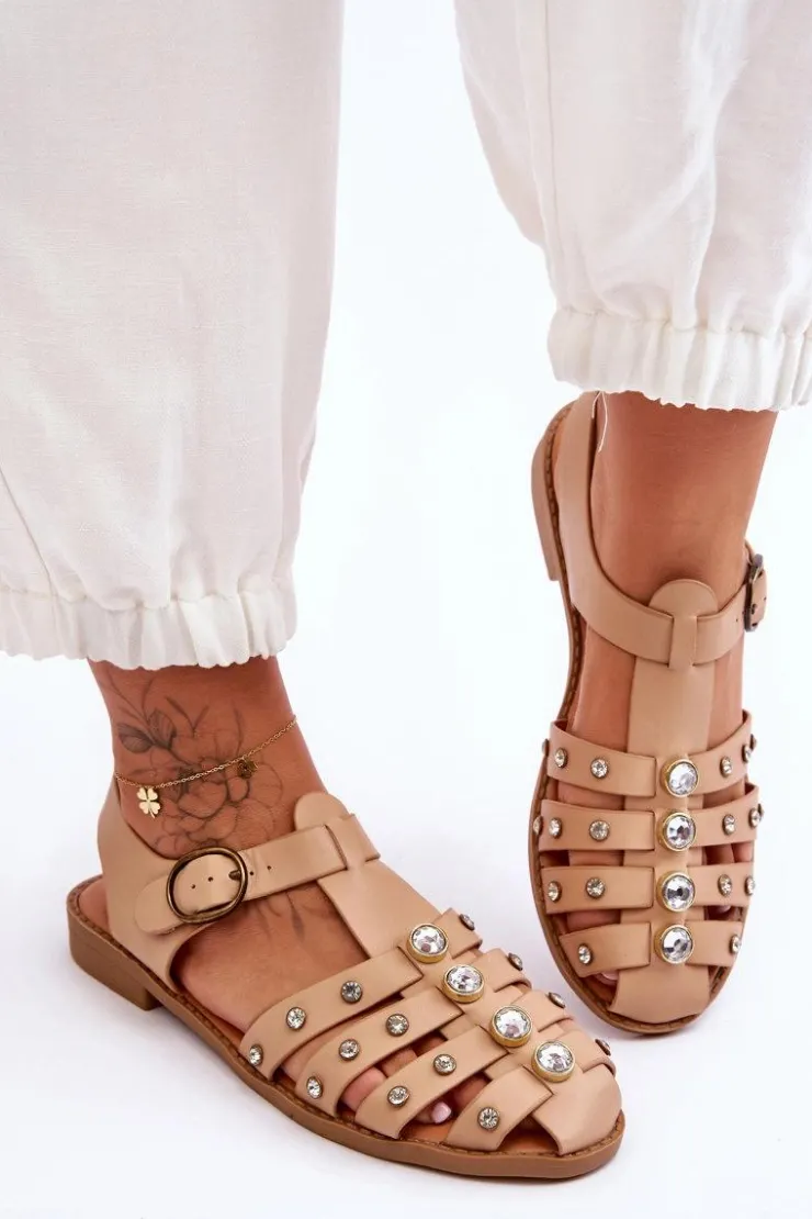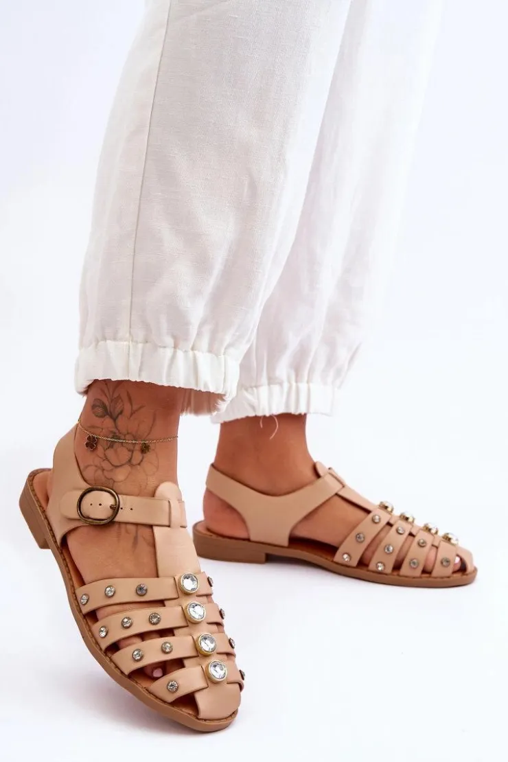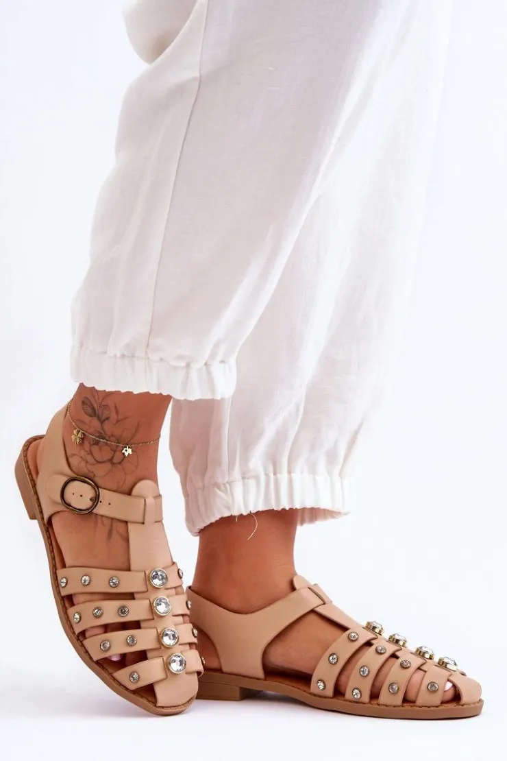 Sandały damskie zostały wykonane z eko skóry. Model ten posiada ozdobne dżety na całości cholewki imitujące cyrkonie. Klasycznie zapinane na regulowany pasek ze sprzączką. Wkładka jest miękka i wygodna podczas użytkowania. Ten niezwykle przewiewny model idealnie sprawdzi się na letnie, upalne dni! Sandałki osadzono na płaskim obcasie z antypoślizgową podeszwą. Przy wyborze rozmiaru prosimy sugerować się tabelą rozmiarów.