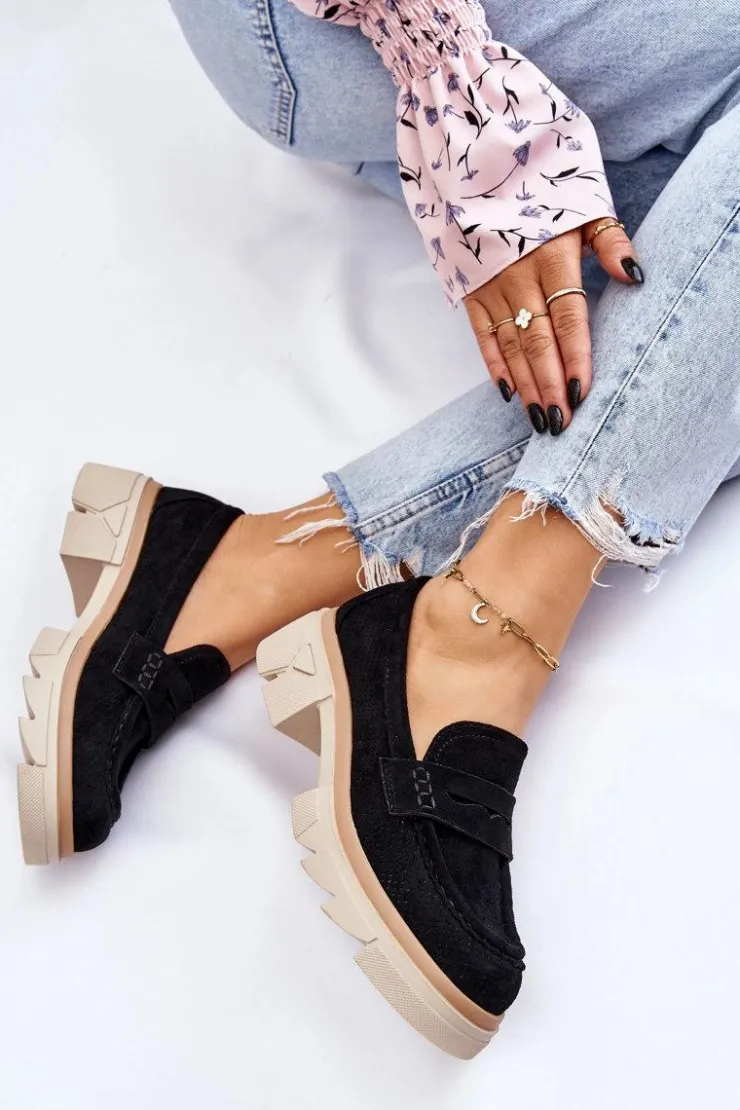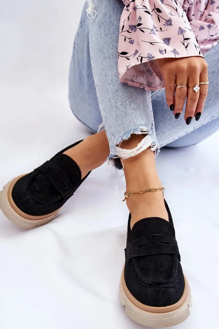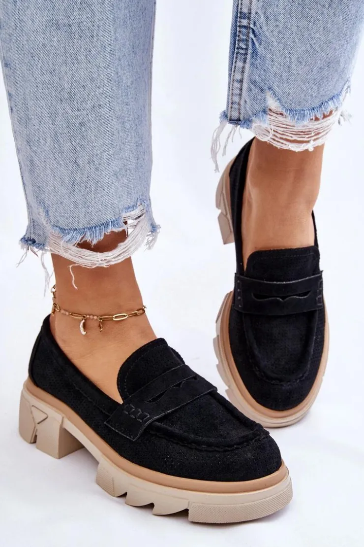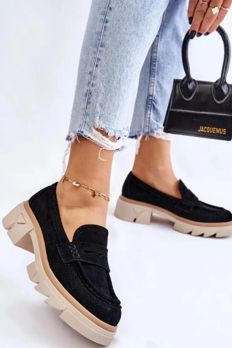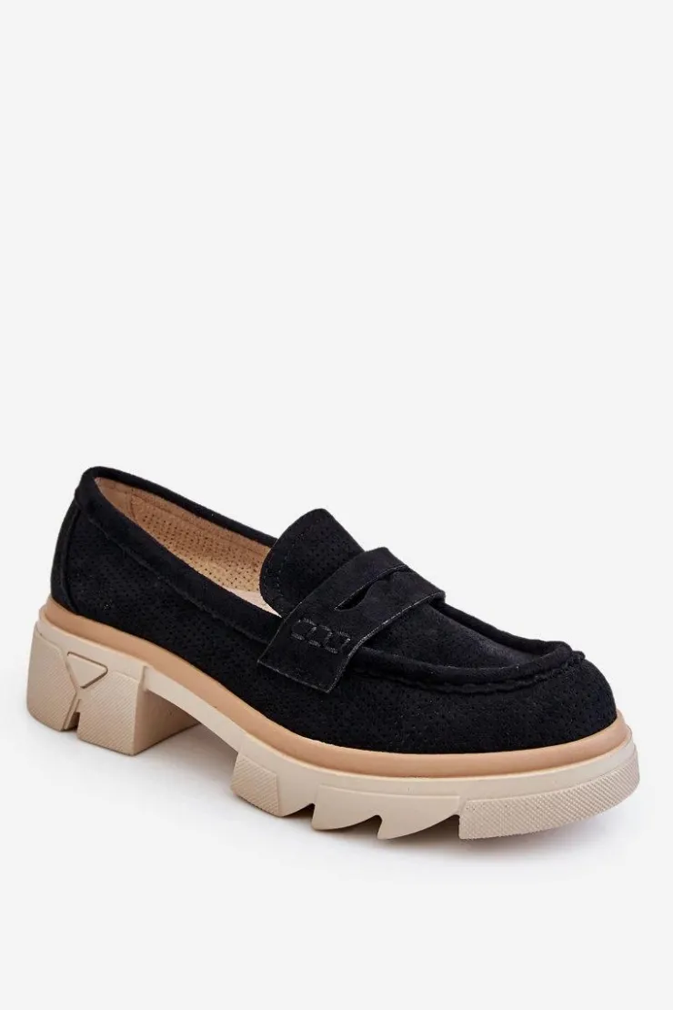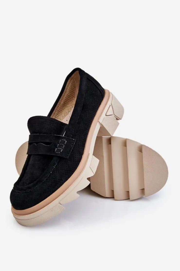 Damskie półbuty w stylu mokasynów zostały osadzone na masywnym, płaskim obcasie i platformie. Wykonane z materiału przypominającego eko zamsz. Miękka wkładka z naturalnej skóry zapewni wygodę podczas użytkowania. Cholewka w ażurowy wzór. Zapiętek został usztywniony. Świetny model do wielu stylizacji! Przy wyborze rozmiaru prosimy sugerować się tabelą rozmiarów.