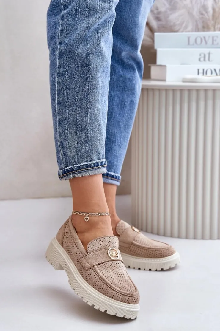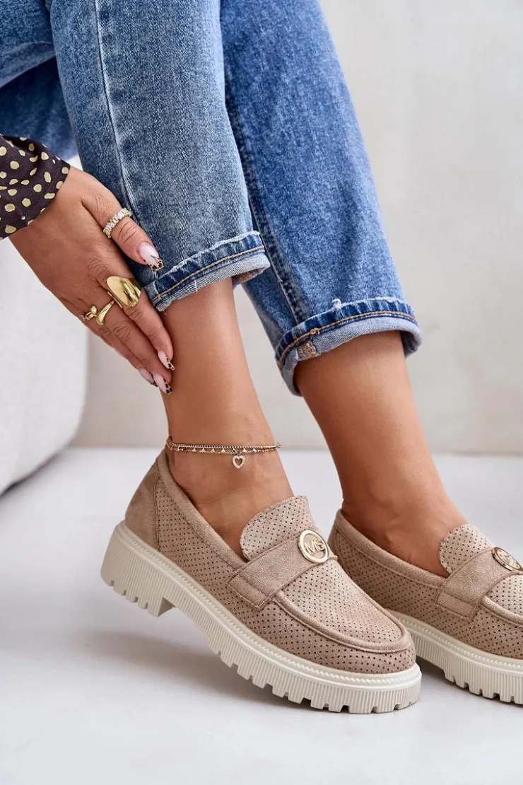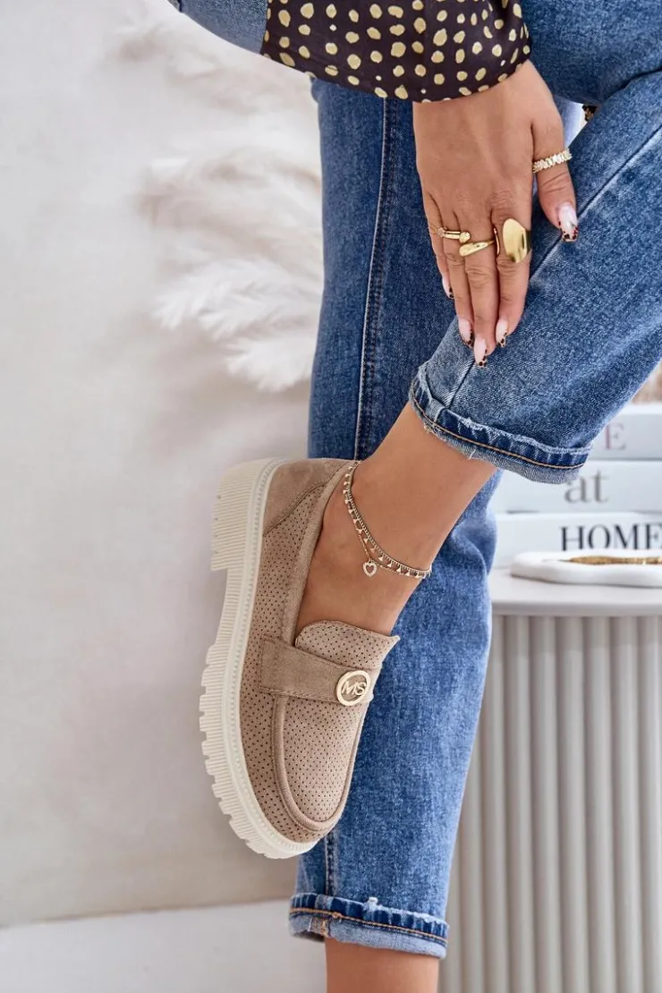 Damskie mokasyny wykonane z eko zamszu. Osadzone na platformie i płaskim obcasie. Noski zaokrąglone. Model ten wyróżnia się złotym, małym detalem, który nadaje elegancji. Modny fason, który idealnie uzupełni stylizacje ze spodniami i sukienkami! Przy wyborze rozmiaru prosimy sugerować się tabelą rozmiarów.