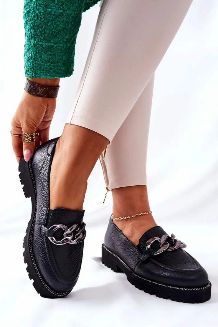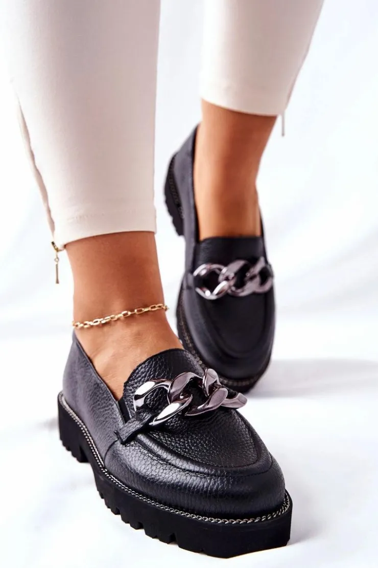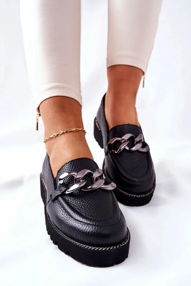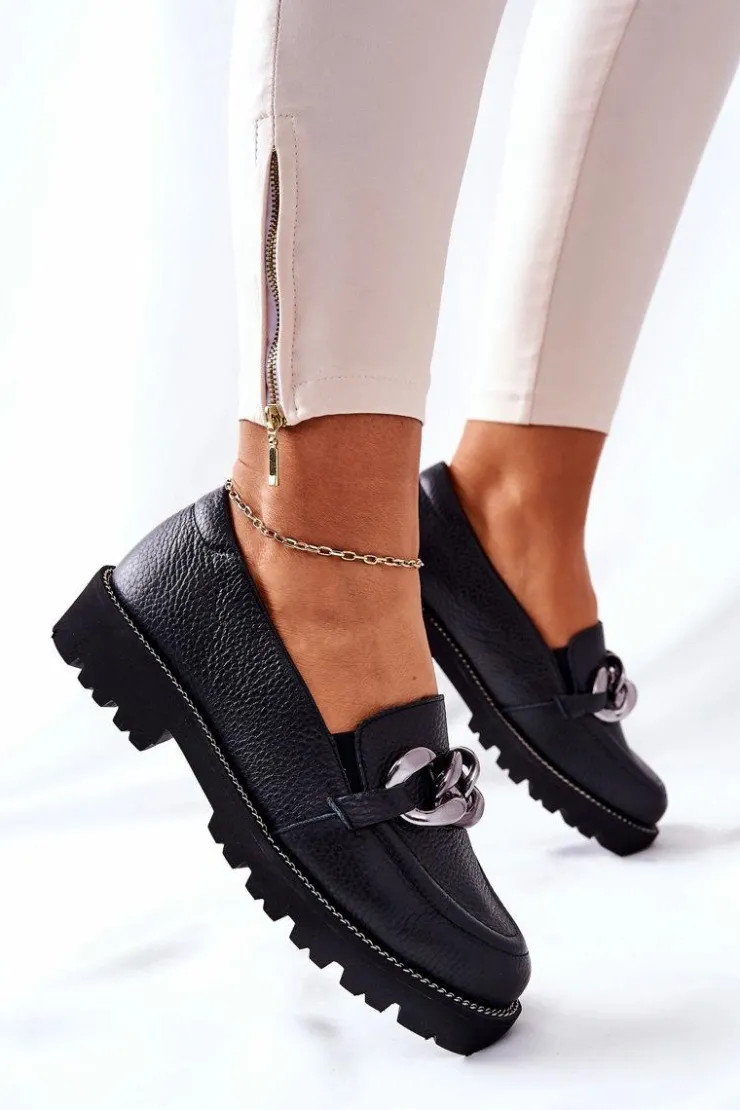 Klasyczne półbuty w stylu przepięknych loaferów! Buty zostały wykonane z wysokiej jakości skóry naturalnej. Charakterystyczne zdobienie w postaci łańcucha sprawi, że stworzymy z nimi wiele wspaniałych stylizacji. Wysoka podeszwa oraz obcas, który uniesie naszą sylwetkę. Przy wyborze rozmiaru prosimy sugerować się tabelą rozmiarów.