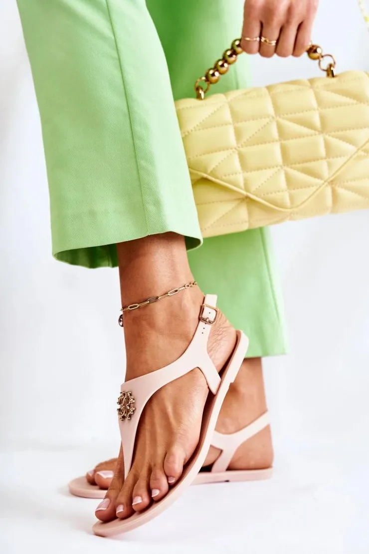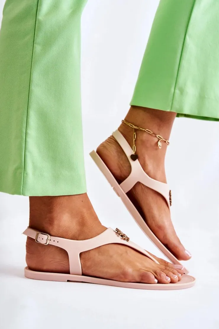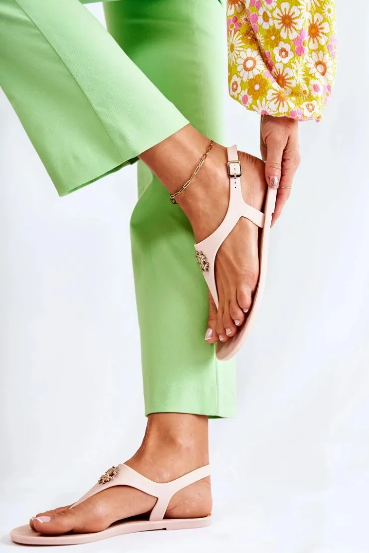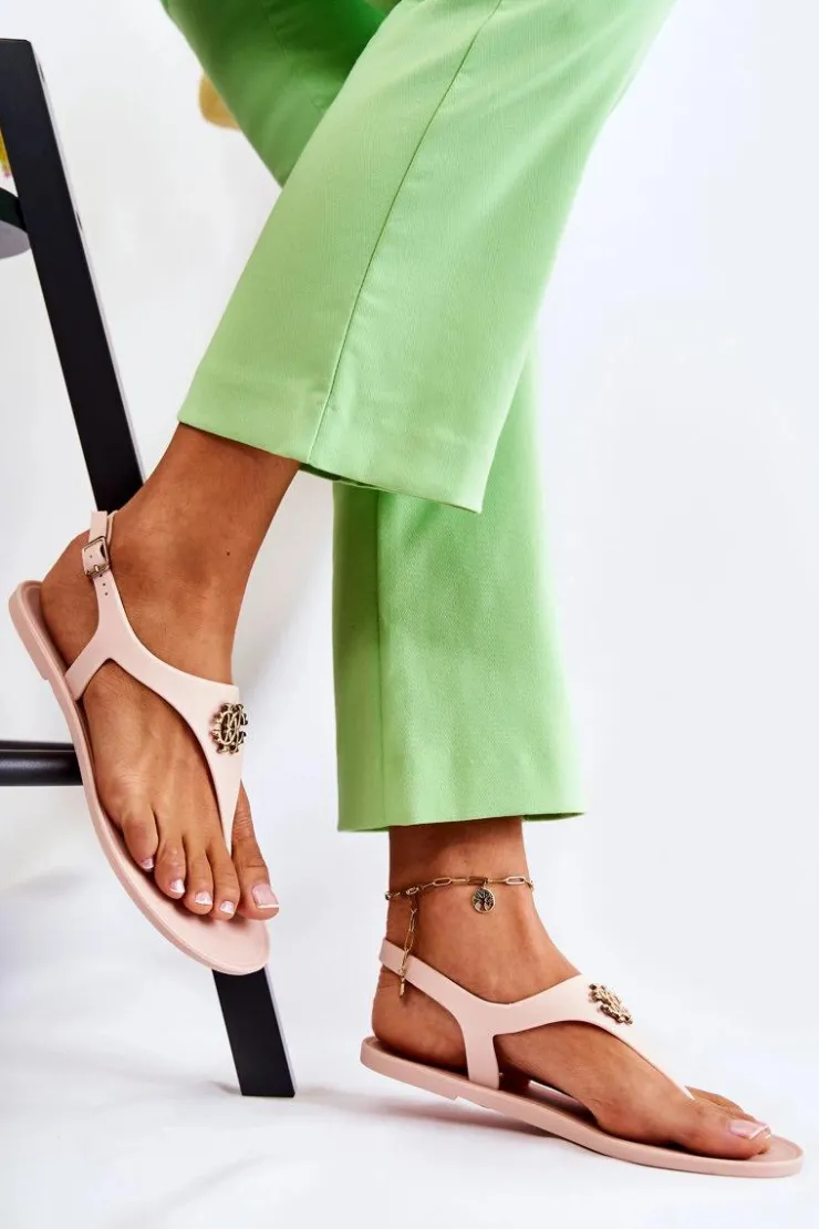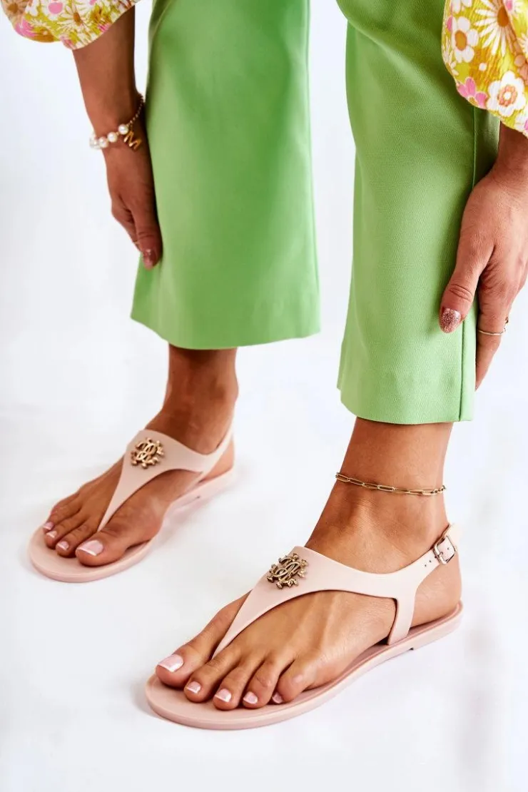 Gumowe sandałki są idealnym obuwiem na letnie dni! Niezwykle przewiewny model. Sandałki w formie japonek z odkrytym, zaokrąglonym noskiem. Zapinane wokół kostki na regulowany pasek ze sprzączką. Osadzone na niskim, płaskim obcasie. Na środkowym pasku znajduje się ozdobny emblemat. Model, który powinnaś mieć w swojej szafie! Przy wyborze rozmiaru, prosimy sugerować się tabelą rozmiarów.