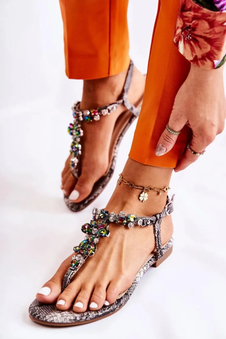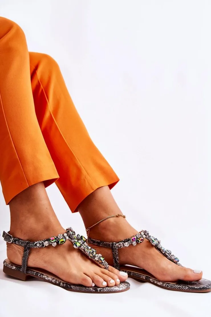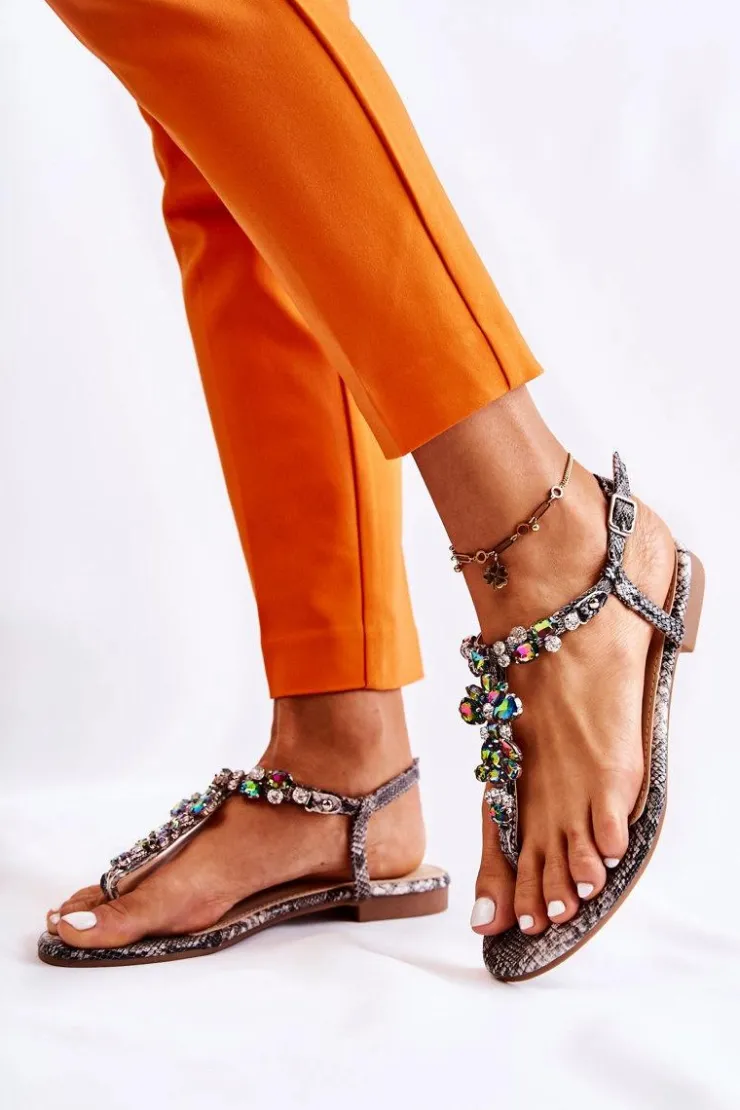 Sandały typu japonki na płaskim obcasie. Posiadają otwarty, zaokrąglony nosek. Cienkie paski zostały wykonane z eko skóry. Model zapinany na sprzączkę z regulowanym paskiem, dzięki któremu możesz je odpowiednio dopasować do tęgości nogi. Ozdobione dżetami na paskach imitującymi cyrkonie i kryształy. Miękka wkładka wykonana także z eko skóry. Sandały świetnie będą prezentować się z wieloma stylizacjami! Przy wyborze rozmiaru prosimy kierować się tabelą rozmiarów.