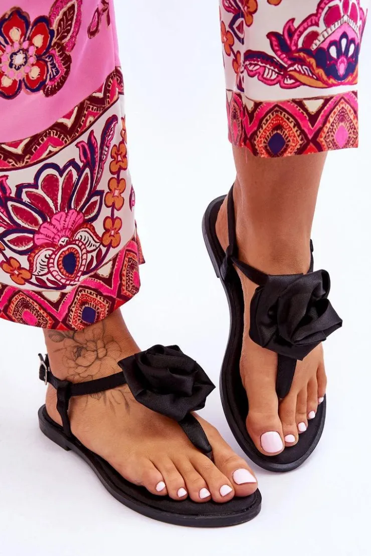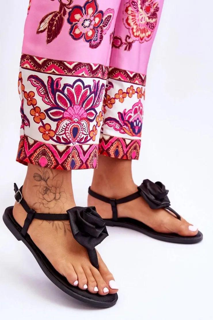 Damskie sandałki zostały wykonane z materiału tekstylnego imitującego satynę. Ozdobione na środku dużą, materiałową różą. Sandałki w stylu japonek osadzono na płaskim obcasie. Zapinane są na regulowany pasek ze sprzączką. Miękka wkładka została wykonana z materiału. Przy wyborze rozmiaru prosimy kierować się tabelą rozmiarów.