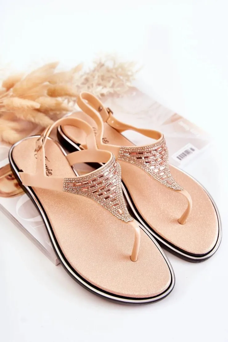 Damskie sandały są idealnym obuwiem na upalne dni! Model w stylu japonek. Buty te zostały wykonane w całości z gumowego tworzywa. Na paseczkach znajdują się piękne dżety imitujące cyrkonie. Zapinane na sprzączkę z regulowanym paskiem. Sandały te są osadzone na płaskim obcasie z antypoślizgową podeszwą. Ten niezwykły model powinien znaleźć się właśnie w Twojej szafie! Przy wyborze rozmiaru prosimy kierować się tabelą rozmiarów.