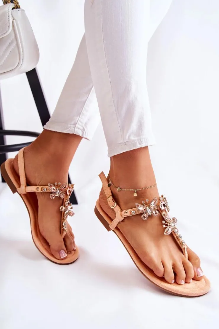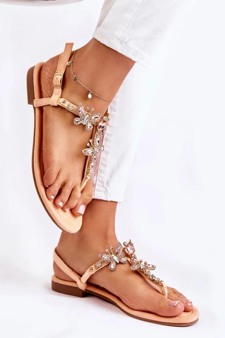 Damskie sandały o fasonie japonek. Posiadają zdobienia w postaci motyli z ozdobnymi dżetami w formie cyrkonii i kryształów. Zapinane na sprzączkę z regulowanym paskiem wokół kostki. Paseczki, jak i wkładka są wykonane z eko zamszu, co zapewni komfort i wygodę podczas użytkowania. Buty osadzone na płaskim obcasie z antypoślizgową podeszwą. Przy wyborze rozmiarów, prosimy sugerować się tabelą rozmiarów.