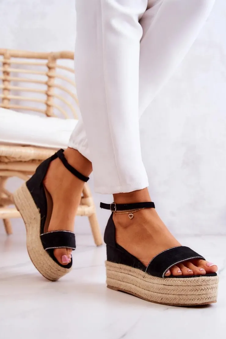 Sandały na koturnie zostały wykonane z eko zamszu. Posiadają paseczek z ozdobą imitującą cyrkonie. Stabilny koturn oraz platforma zdobiona jutowym warkoczem. Zapinane wokół kostki na sprzączkę z regulowanym paskiem. Eko skórzana wkładka zapewni komfort przez cały dzień. Podeszwa wykonana z gumowego tworzywa, która jest antypoślizgowa. Uzupełnij swoje stylizacje o te wspaniałe sandały. Przy wyborze rozmiaru prosimy sugerować się tabelą rozmiarów.