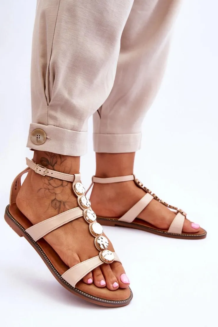 Sandały damskie zostały wykonane z eko skóry. Posiadają zdobienie w postaci kół na środkowym pasku. Zapinane wokół kostki na regulowany pasek ze sprzączką. Nosek odkryty, zaokrąglony. Wokół podeszwy znajdują się ozdobne ćwieki. Sandałki osadzono na płaskim obcasie, z podeszwą z gumowego tworzywa, która jest dodatkowo antypoślizgowa. Wygodna wkładka została wykonana z eko skóry. Przy wyborze rozmiaru prosimy kierować się tabelą rozmiarów.