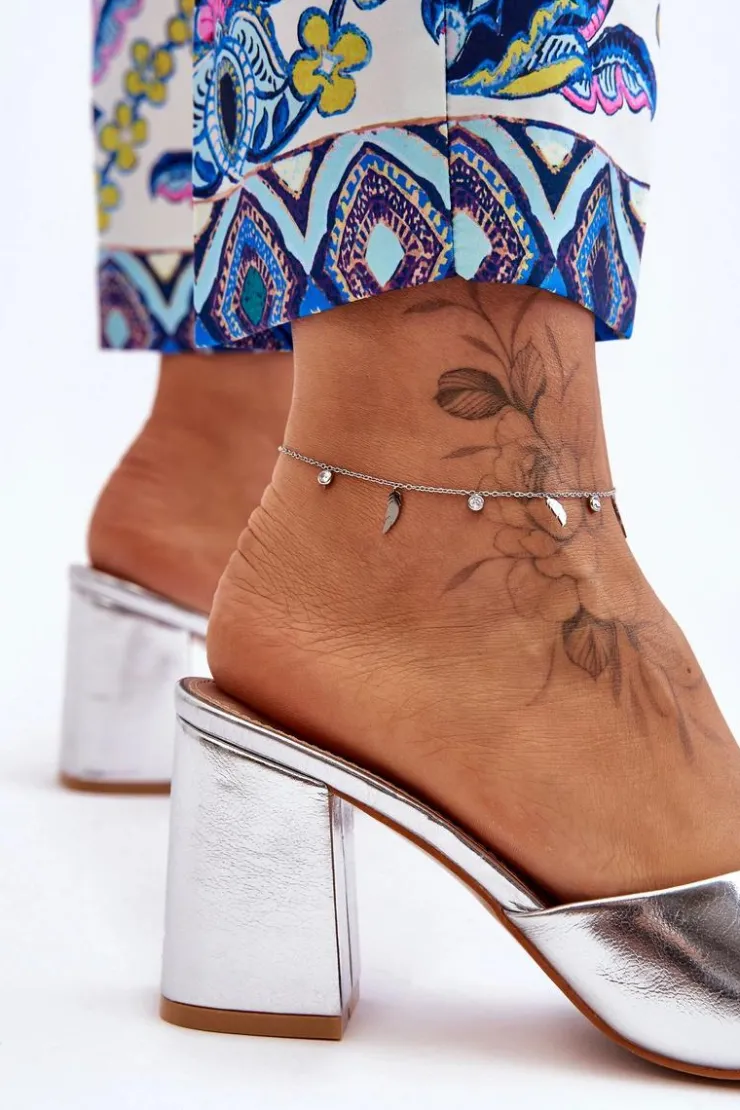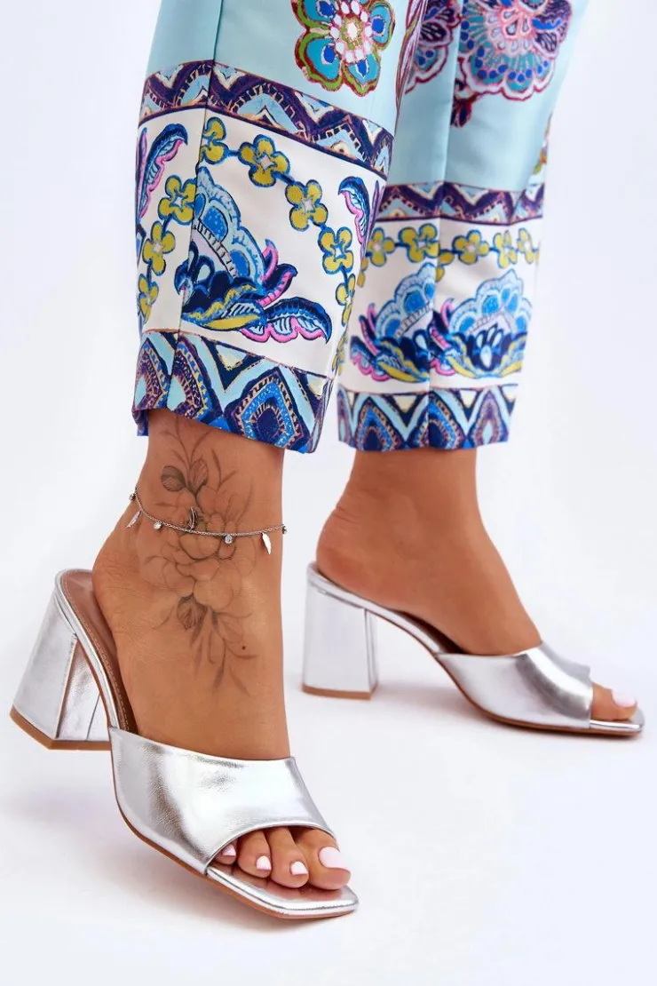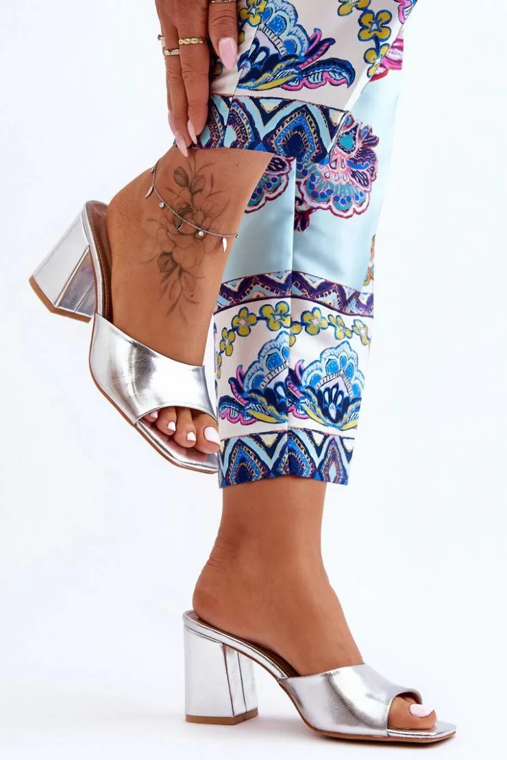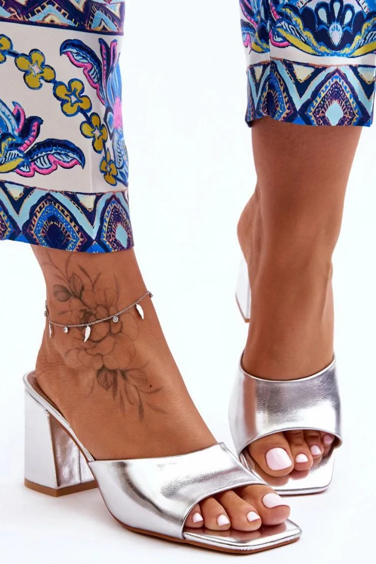 Damskie klapki o klasycznym fasonie. Model ten został wykonany z eko skóry. Klapki posiadają otwarty, kwadratowy nosek. Wkładka jest wygodna i wykonana z eko skóry. Klapki osadzono na obcasie w postaci słupka. Idealne do wielu stylizacji w upalne dni! Przy wyborze rozmiaru prosimy sugerować się tabelą rozmiarów.