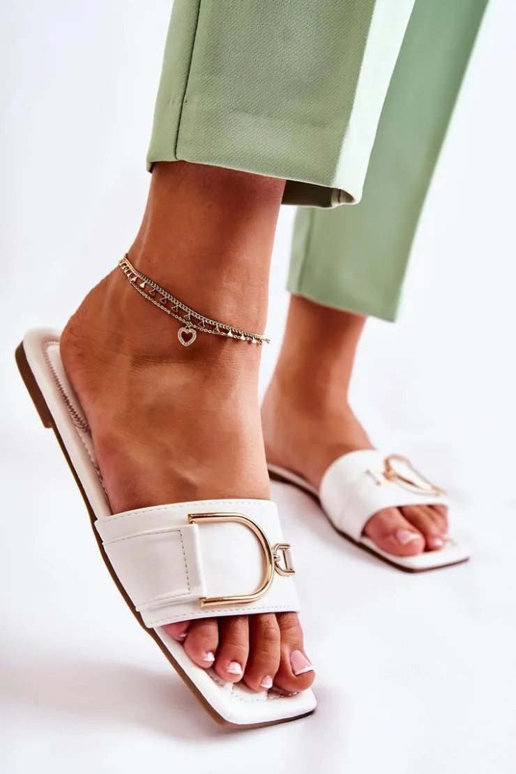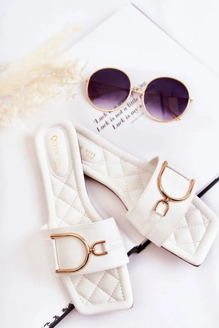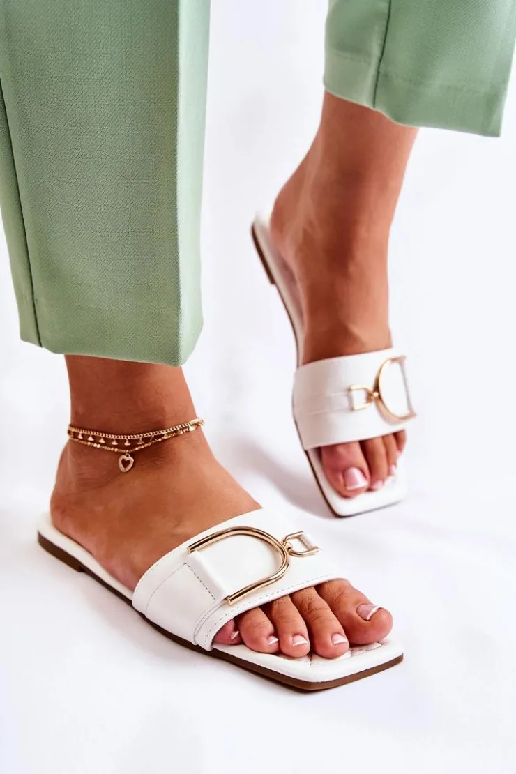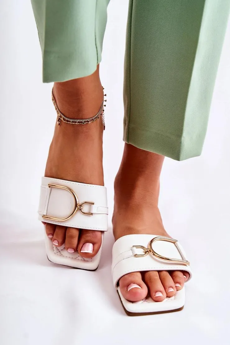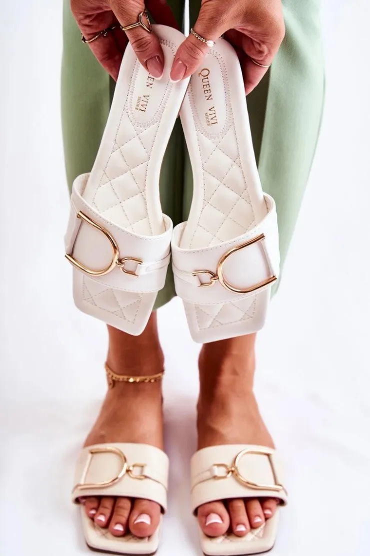 Klasyczne klapki damskie zostały wykonane z eko skóry. Posiadają zdobienie na przednim pasku. Miękka, pikowana wkładka wykonana z eko skóry zapewni komfort podczas użytkowania. Buty zostały osadzone na płaskim obcasie i antypoślizgowej podeszwie. Świetny model, który sprawdzi się podczas upalnych dni! Posiadają odkryty, kwadratowy nosek. Przy wyborze rozmiaru prosimy sugerować się tabelą rozmiarów.