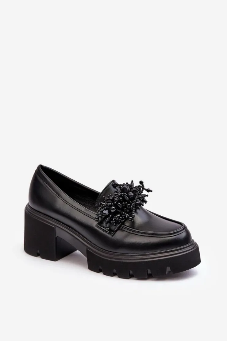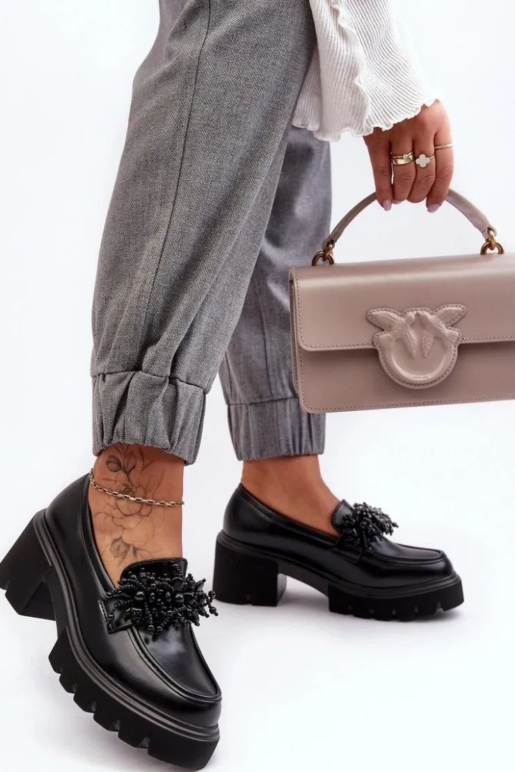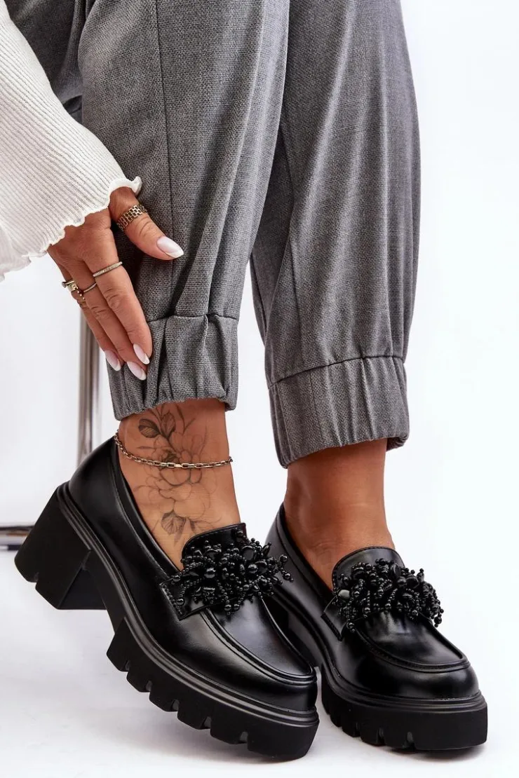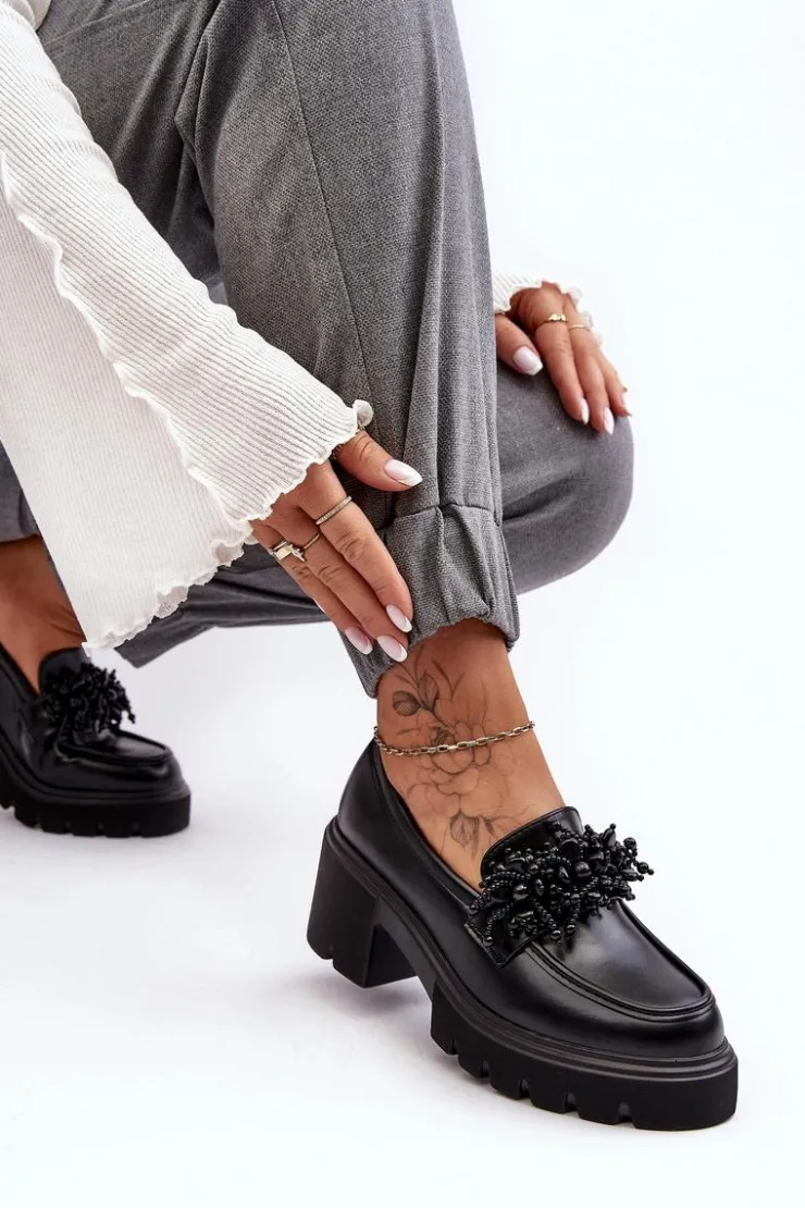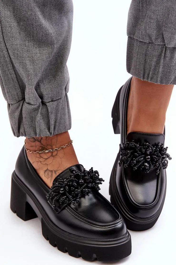 Stylowe półbuty damskie z ozdobą na pasku. Osadzone grubej podeszwie i masywnym, niskim obcasie. Noski zaokrąglone. Usztywniony zapiętek. Eko skórzana wkładka zapewni komfort podczas użytkowania. Model ten będzie idealny do wielu jesiennych stylizacji! Przy wyborze rozmiaru prosimy sugerować się tabelą rozmiarów.
