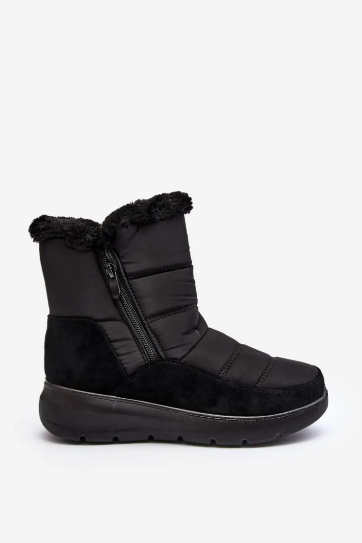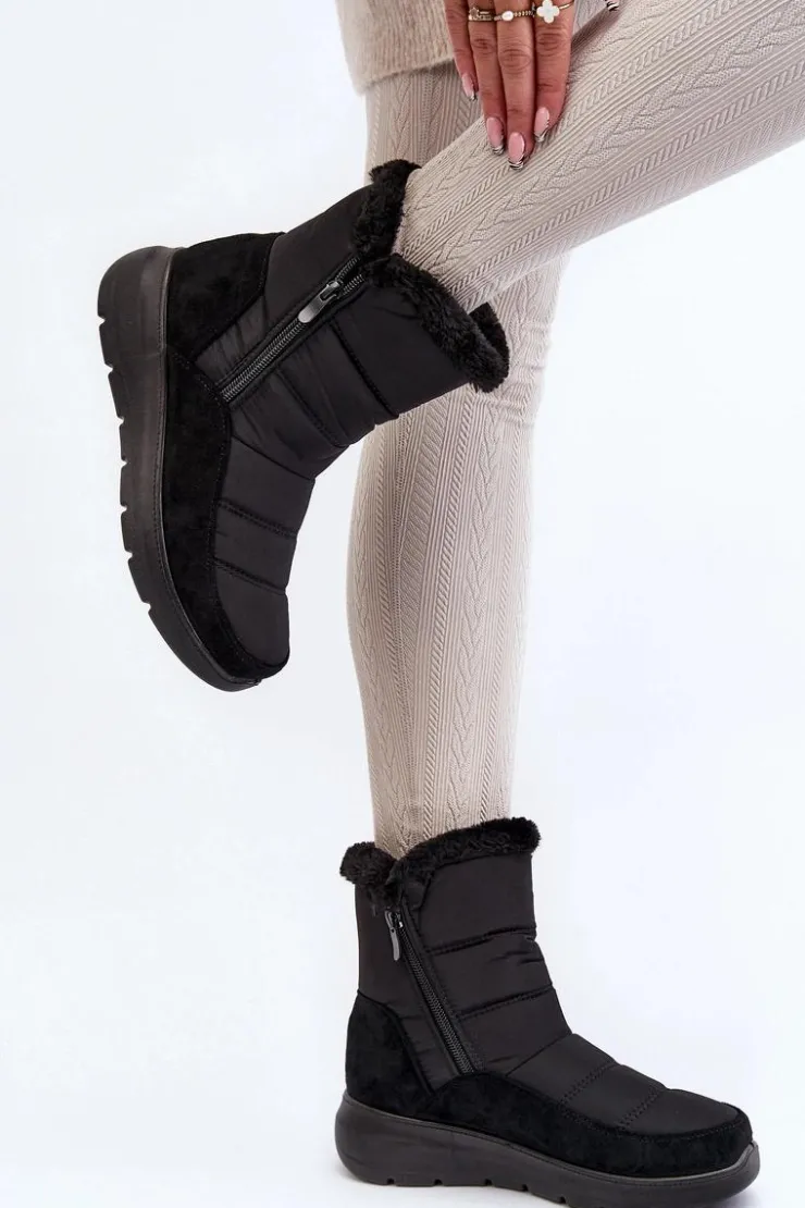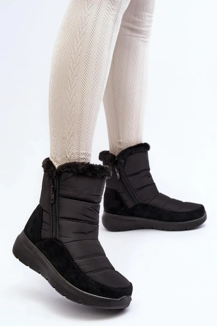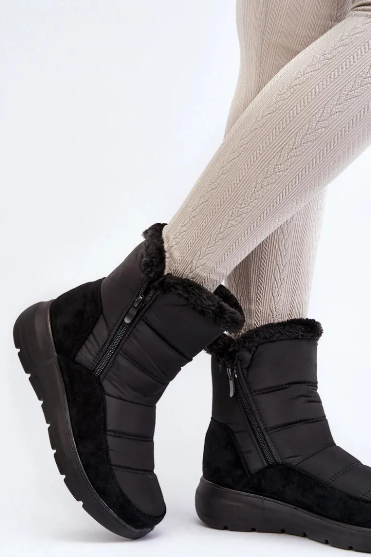 Śniegowce damskie wykonane z połączenia materiału tekstylnego i eko zamszu. Osadzone na platformie. Zapinane na suwak, co ułatwi zakładanie i ściąganie obuwia. Środek ocieplony grubym futerkiem. Noski zaokrąglone. Cholewka za kostkę. Model ten to idealny wybór na mroźne dni! Koniecznie musisz je mieć w swojej szafie. Przy wyborze rozmiaru, prosimy sugerować się tabelą rozmiarów.