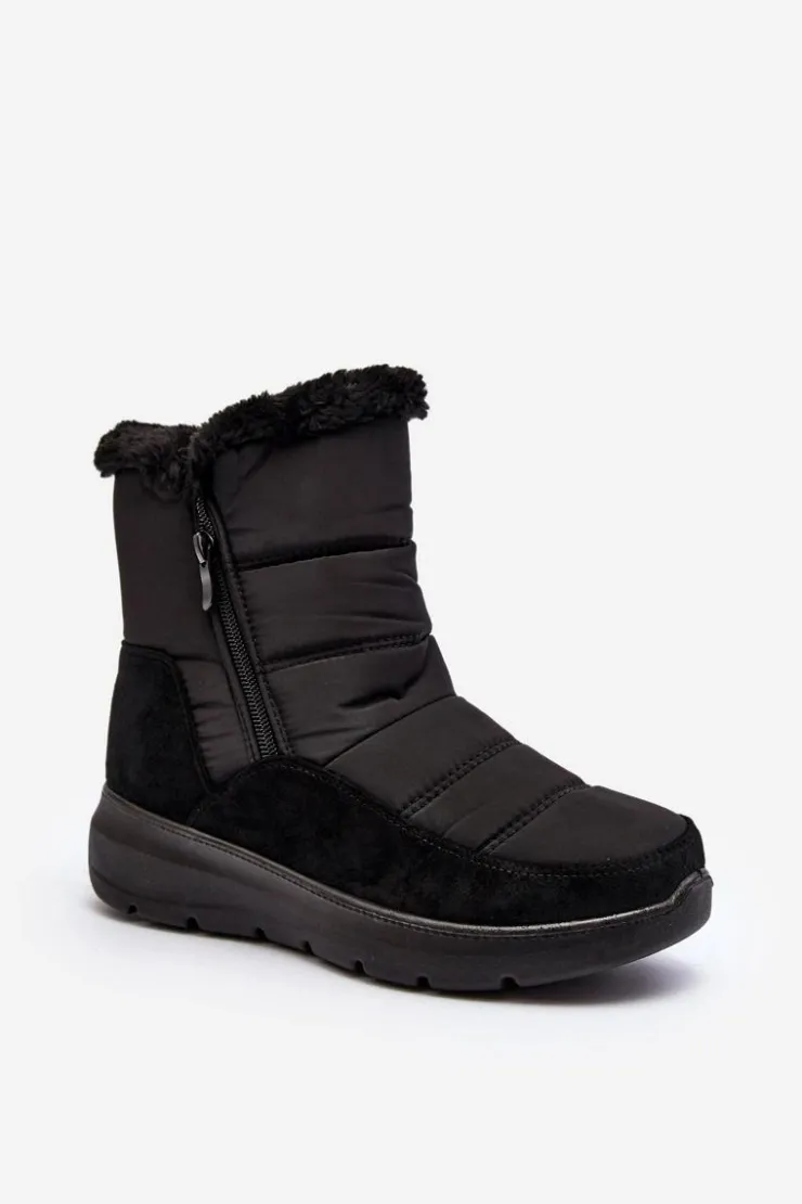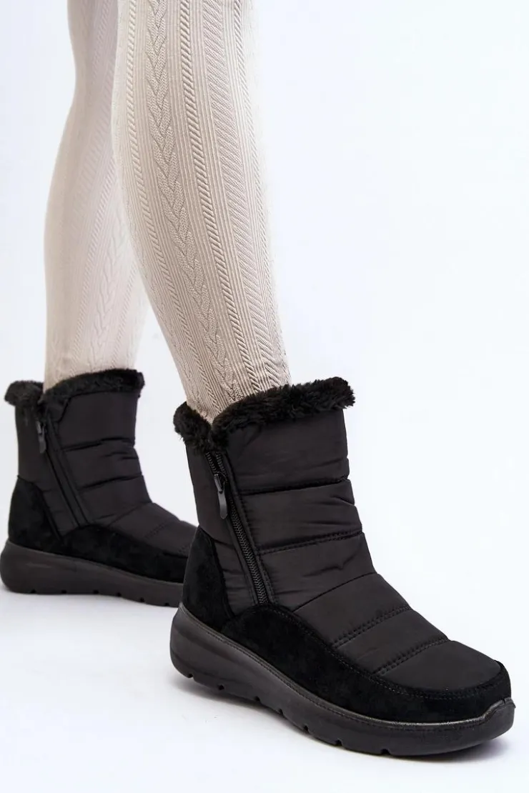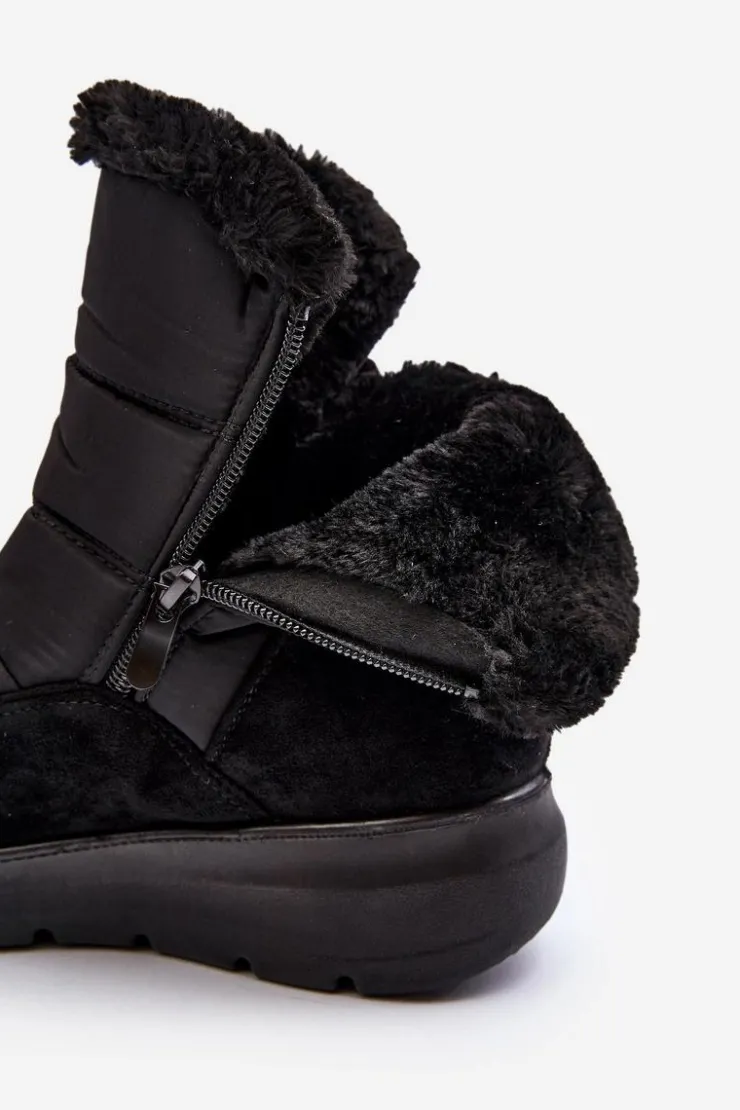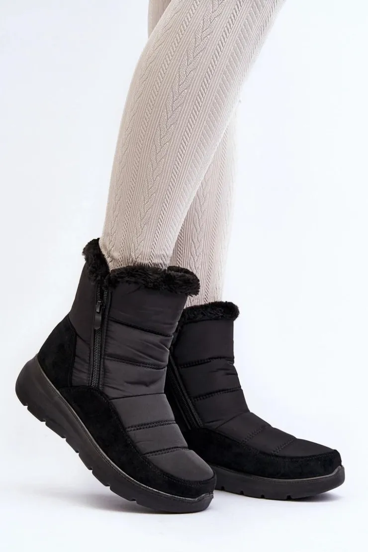 Śniegowce damskie wykonane z połączenia materiału tekstylnego i eko zamszu. Osadzone na platformie. Zapinane na suwak, co ułatwi zakładanie i ściąganie obuwia. Środek ocieplony grubym futerkiem. Noski zaokrąglone. Cholewka za kostkę. Model ten to idealny wybór na mroźne dni! Koniecznie musisz je mieć w swojej szafie. Przy wyborze rozmiaru, prosimy sugerować się tabelą rozmiarów.