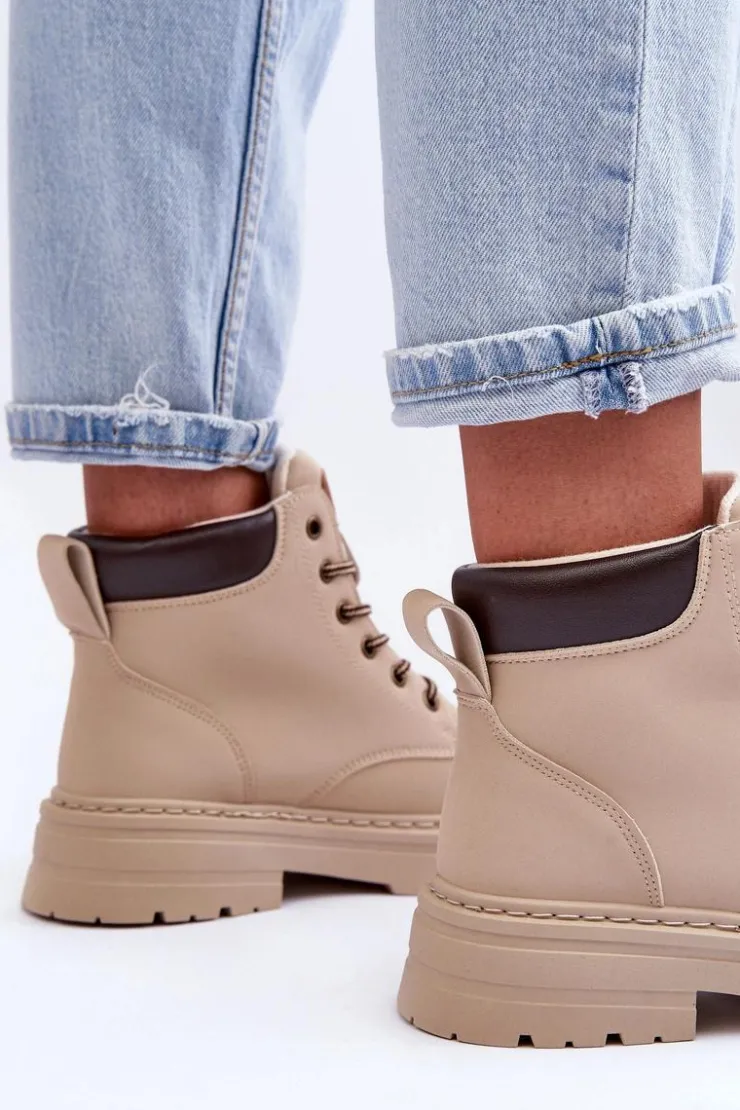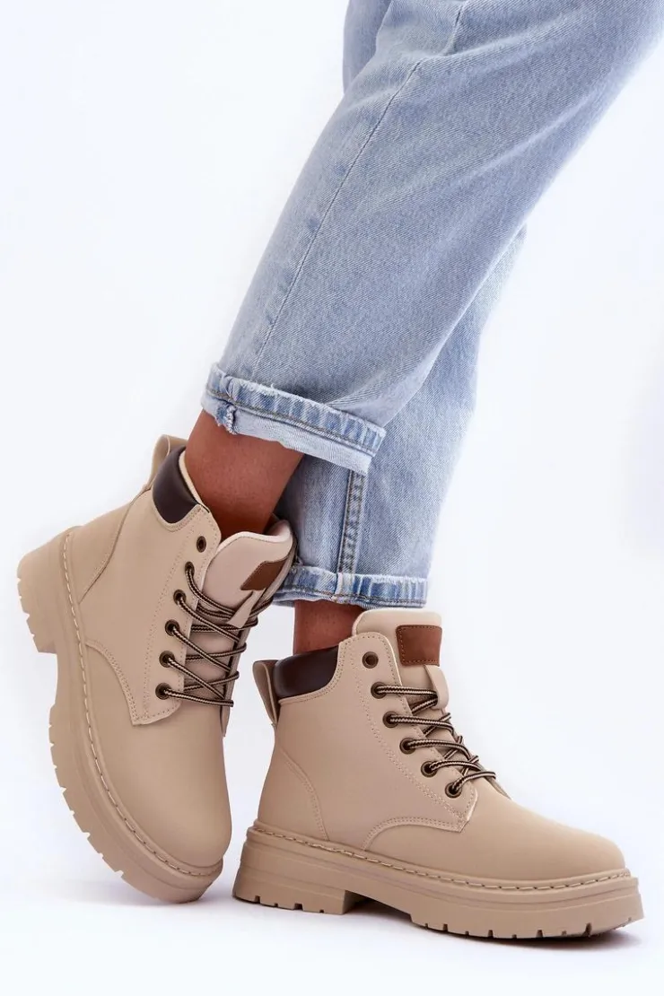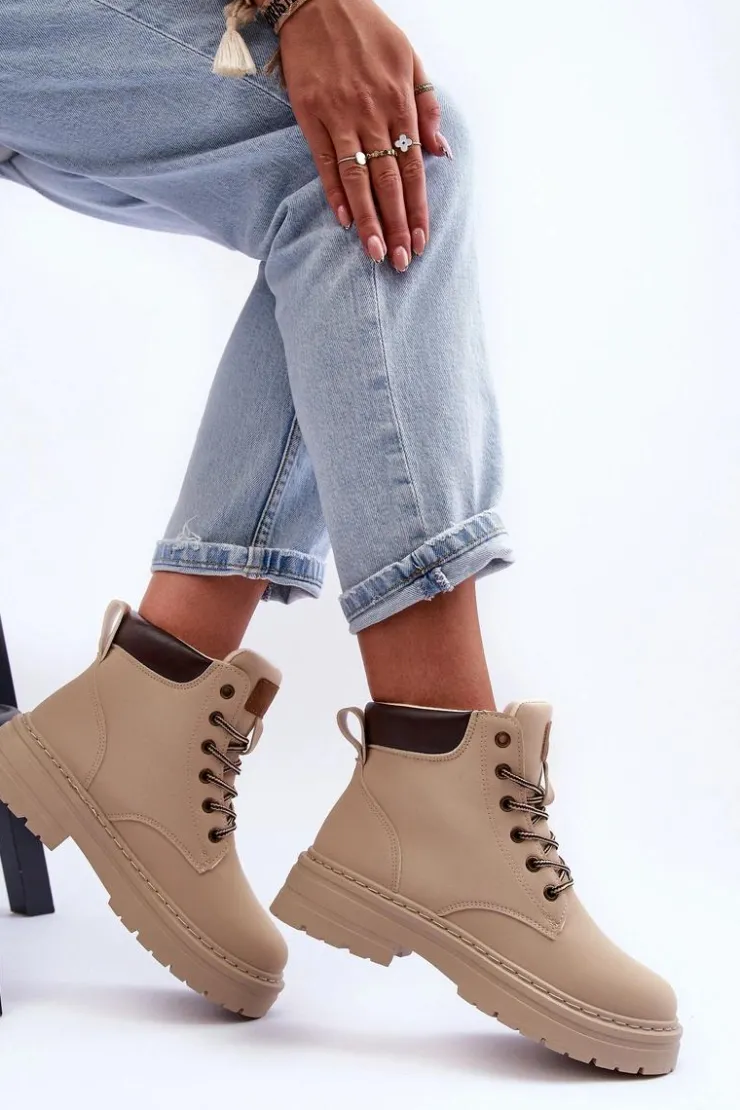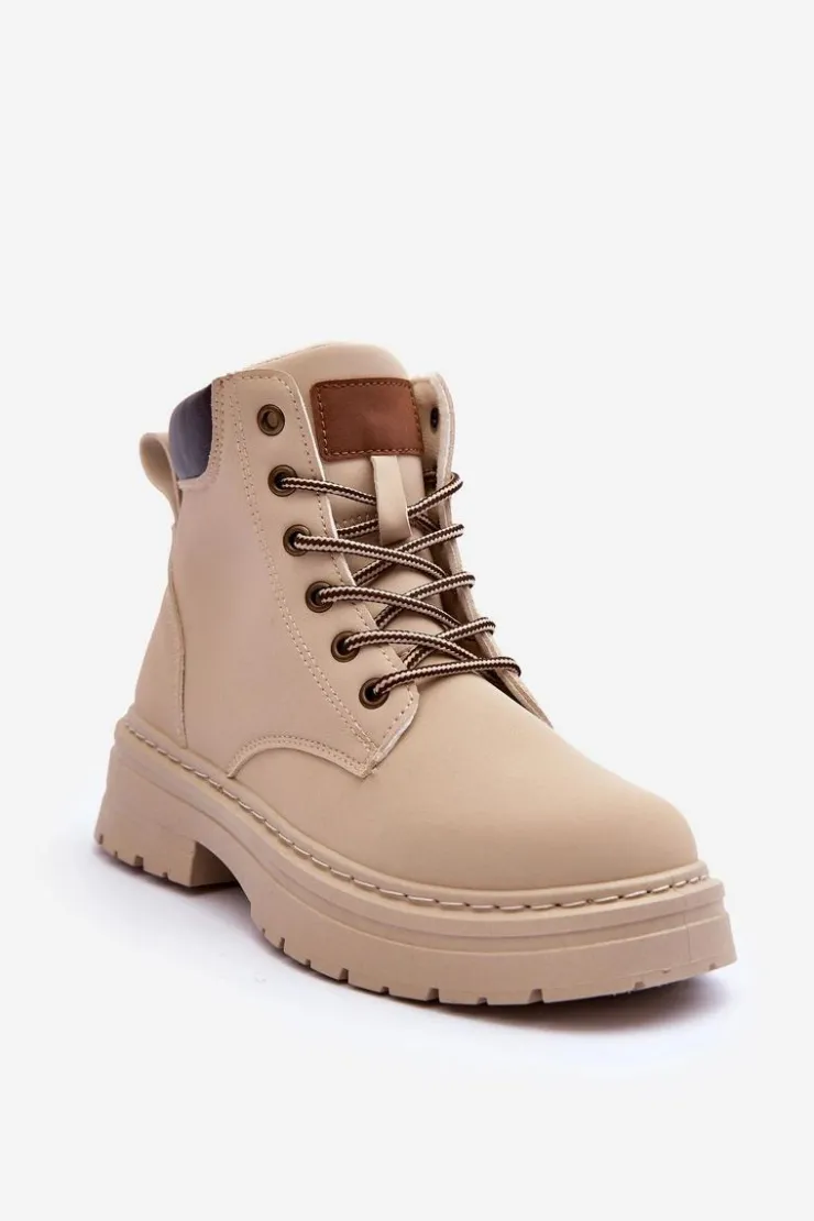 Buty zostały wykonane z miękkiej eko skóry. Osadzone na platformie i płaskim obcasie. Środek został ocieplony kocem obuwniczym. Trapery posiadają przeszycia na cholewce. Wiązanie sprawia, że można je dopasować do własnych potrzeb. Ten model traperów zachwyci każdego! Przy wyborze rozmiaru prosimy sugerować się tabelą rozmiarów.