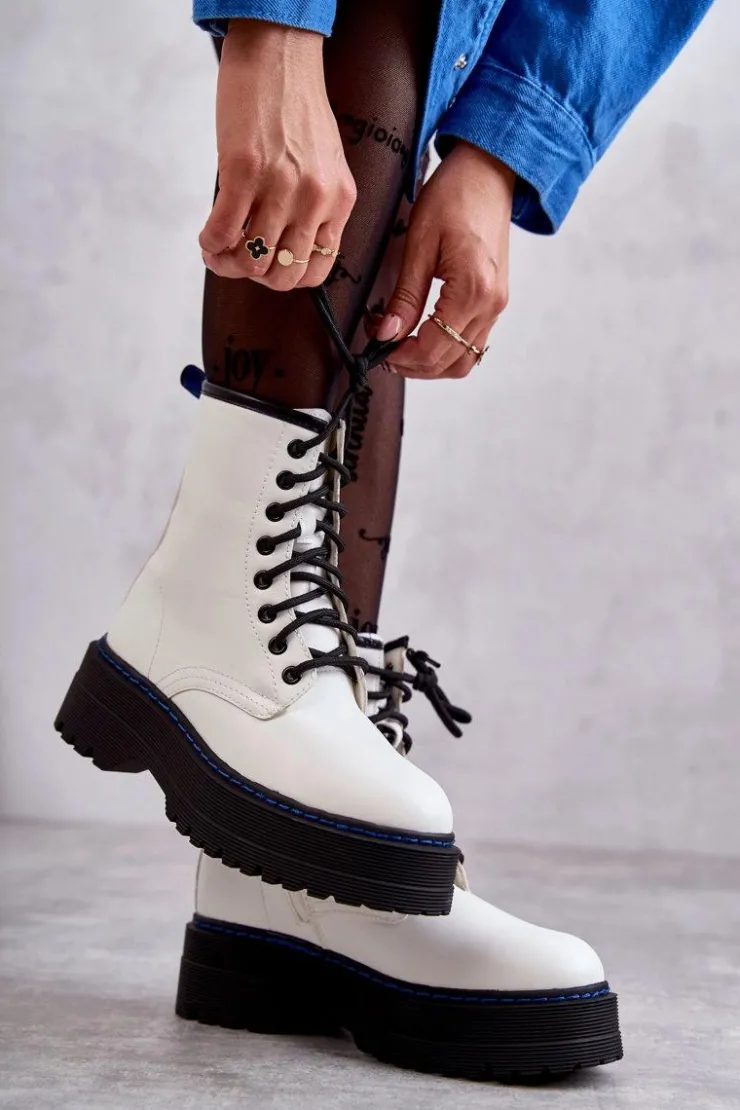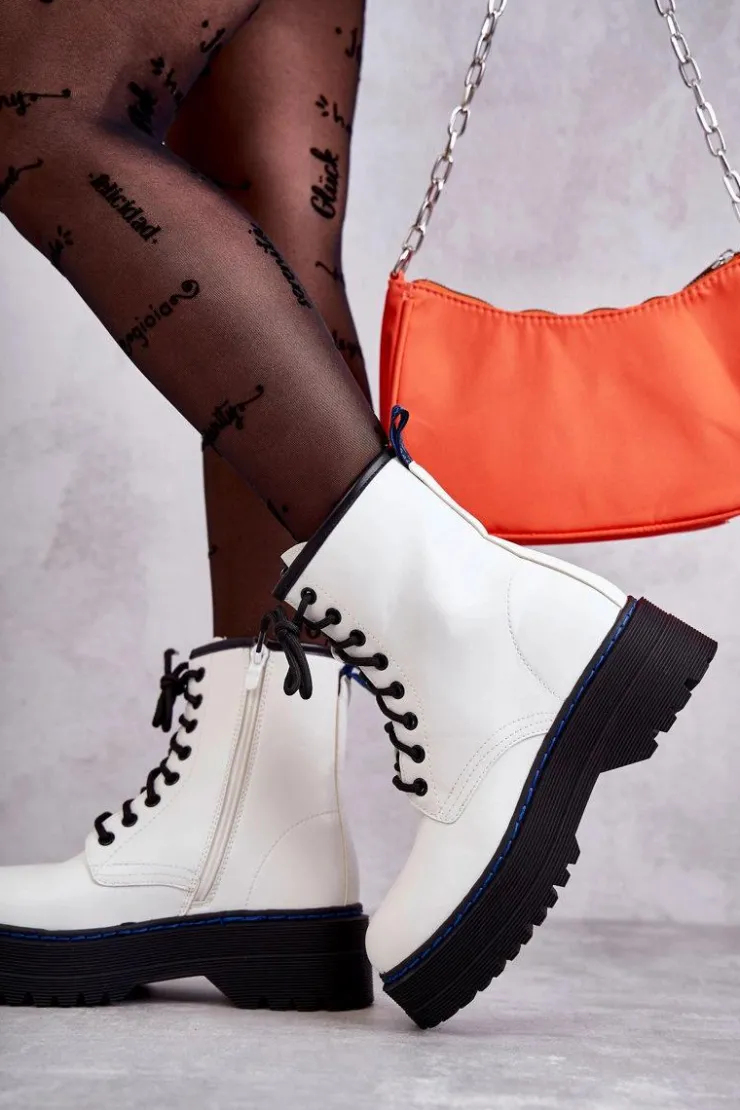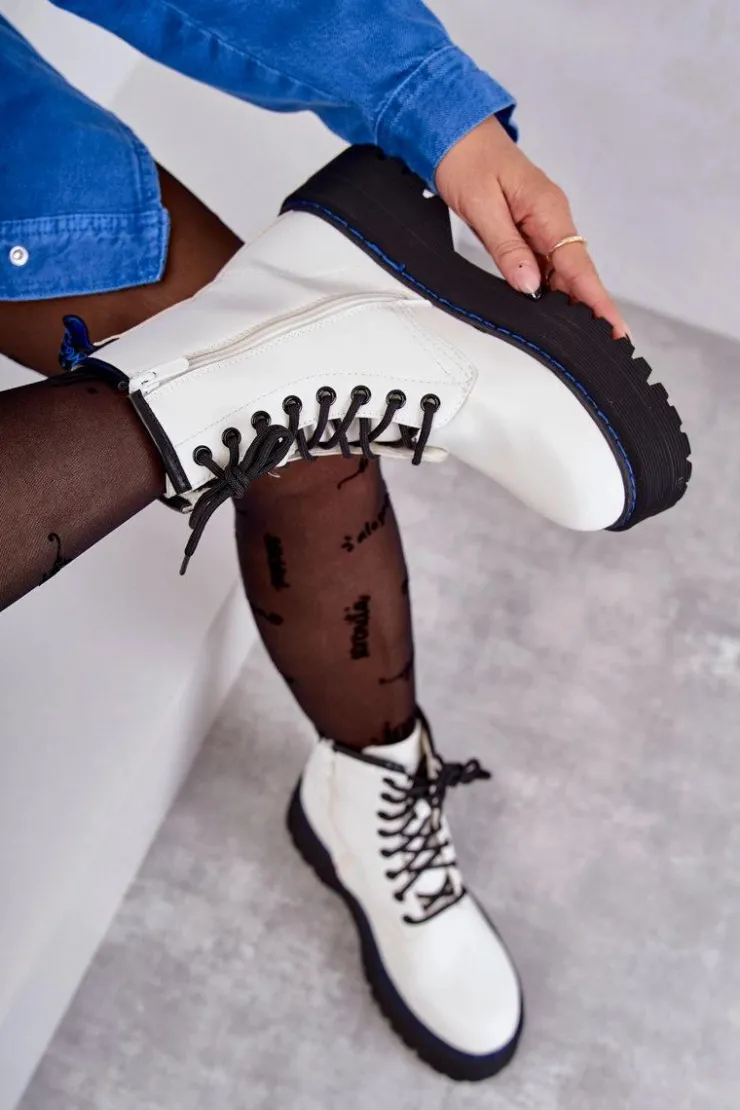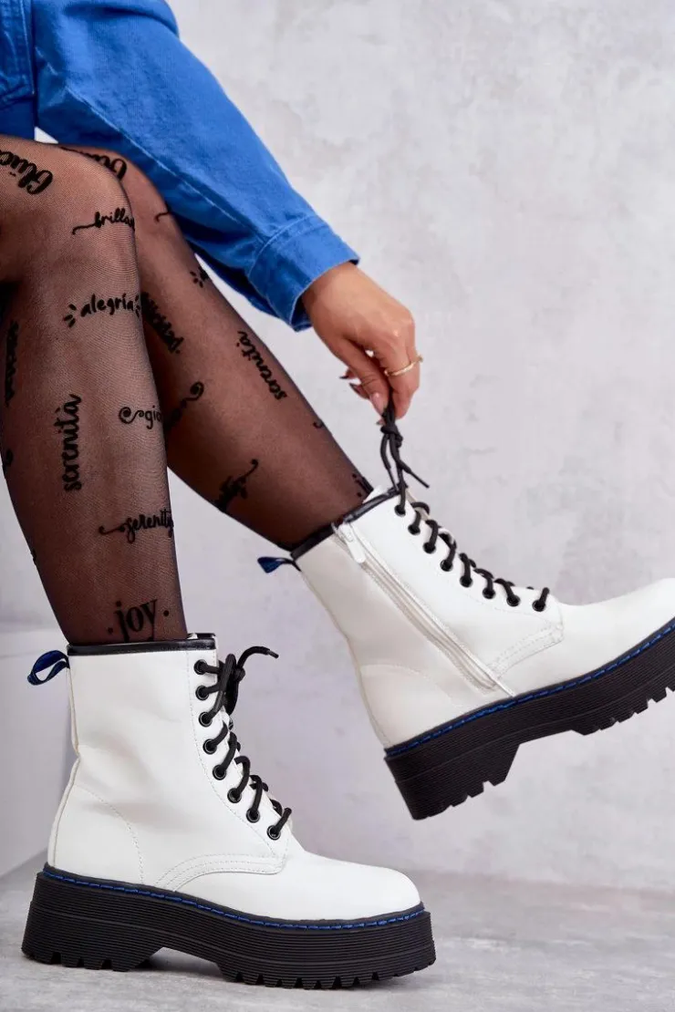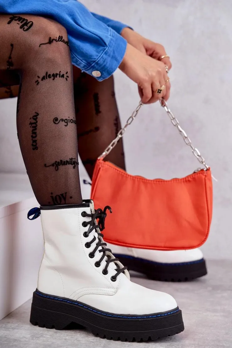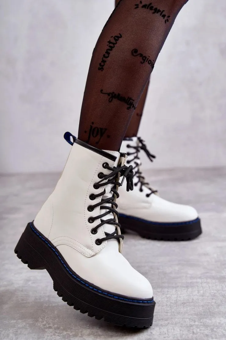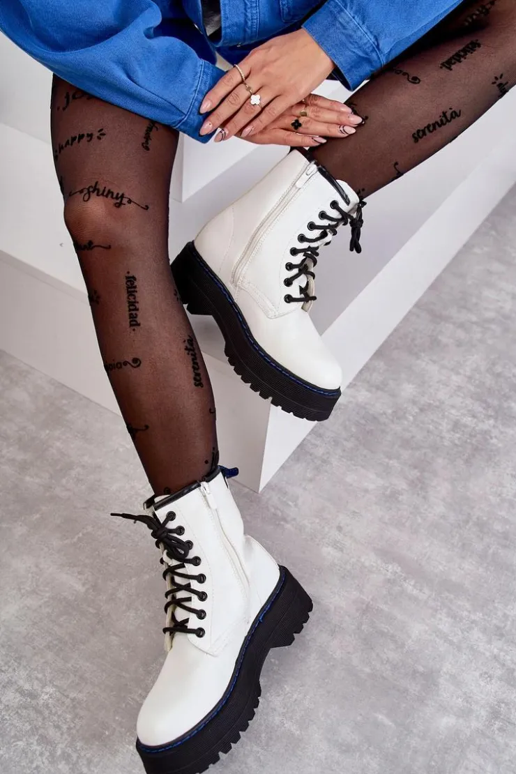 Wyjątkowe botki damskie posiadają klasyczne wiązanie na okrągłe sznurowadła oraz suwak ułatwiający zakładanie obuwia. Posiadają delikatne przeszycia na cholewce. Wykonane z eko skóry. Usztywniany zapiętek zapewni stabilizację stopy. Botki osadzono na płaskim, masywnym obcasie oraz platformie, która jest dodatkowo obszyta nicią. Przy wyborze rozmiaru prosimy sugerować się tabelą rozmiarów.