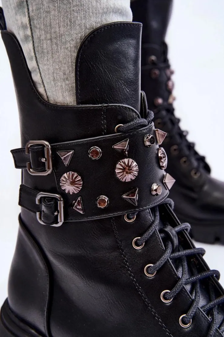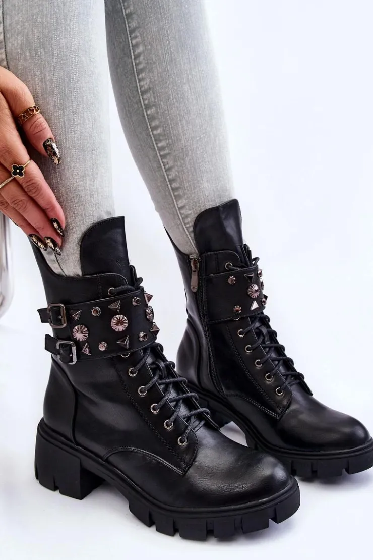 Damskie botki zostały wykonane z eko skóry. Buty zapinane na suwak oraz sznurowane. Klasyczny model został osadzony na płaskim obcasie i platformie. Botki te nie posiadają ocieplenia. Dodatkowo zostały ozdobione ćwiekami na pasku z klamrami. Zapiętek jest usztywniany. Koniecznie powinnaś je mieć w swojej szafie! Przy wyborze rozmiaru prosimy sugerować się tabelą rozmiarów.