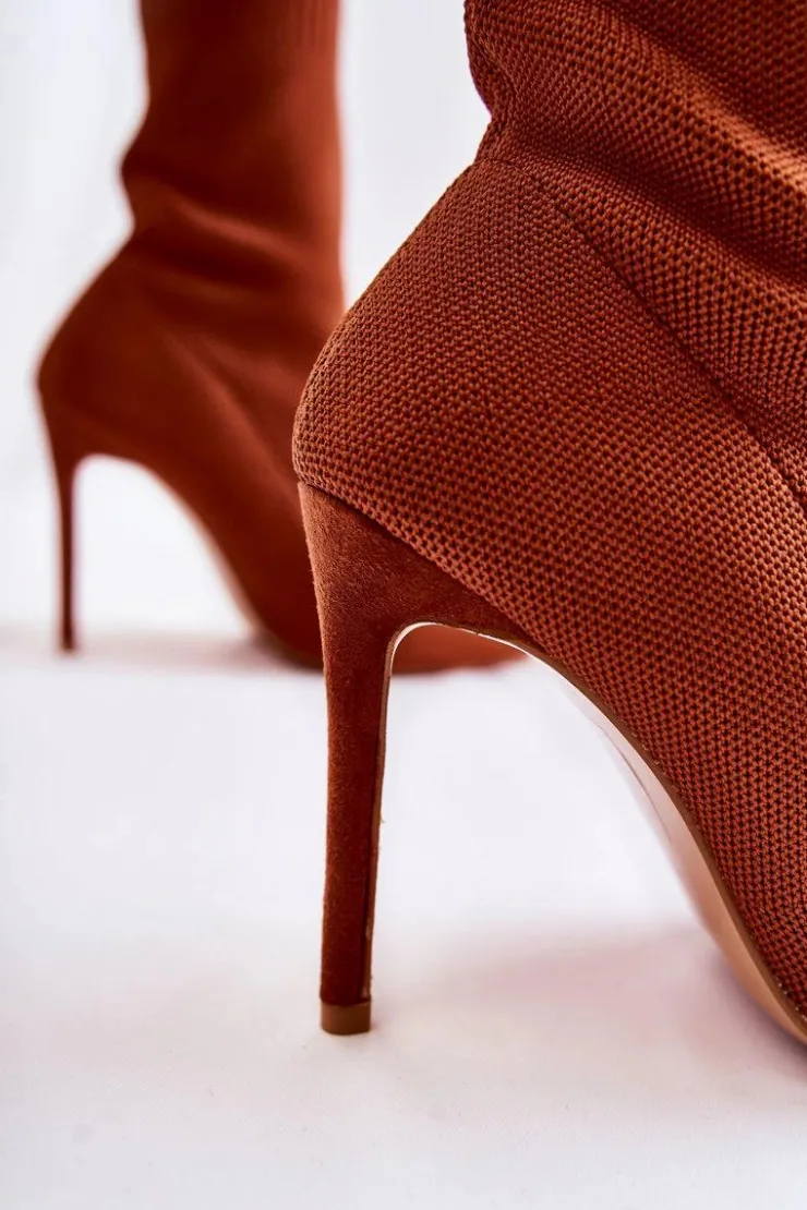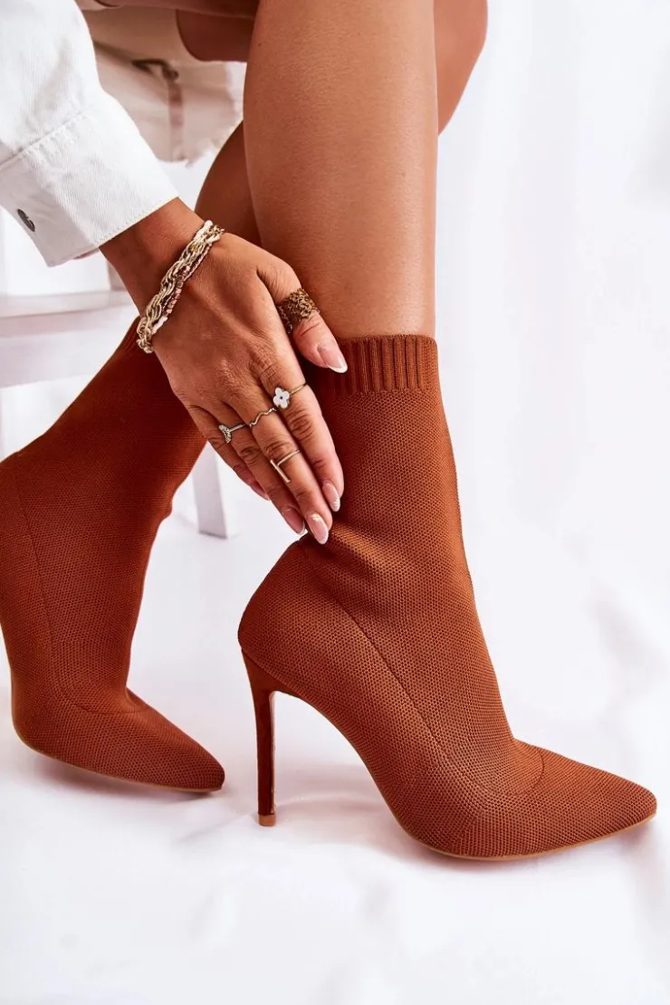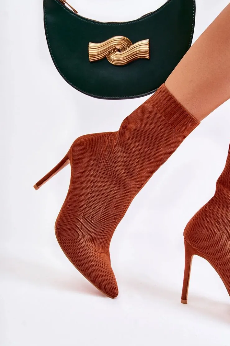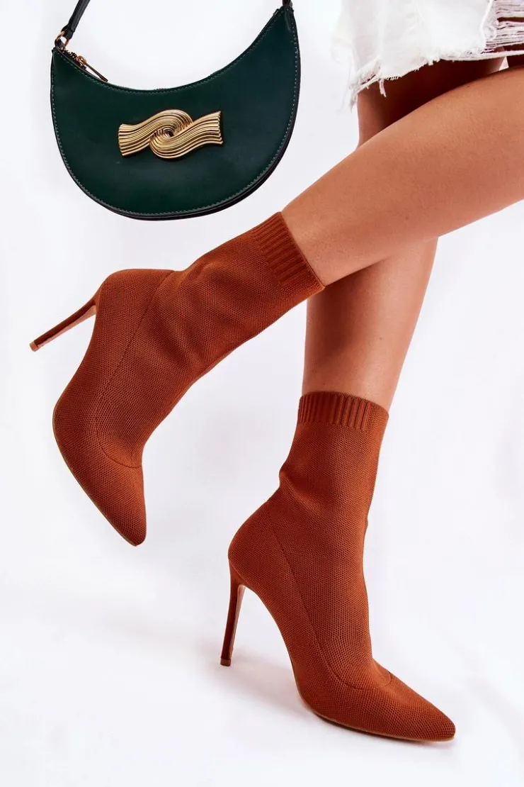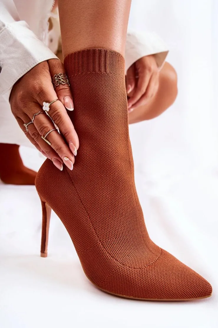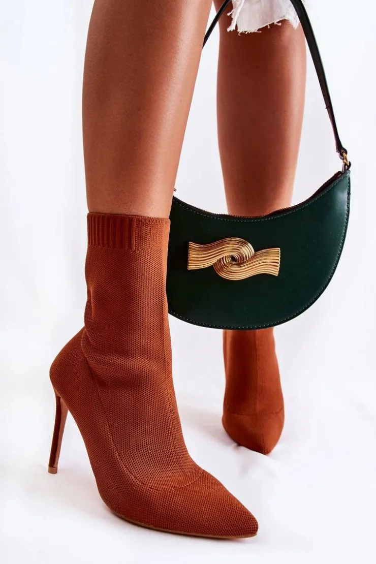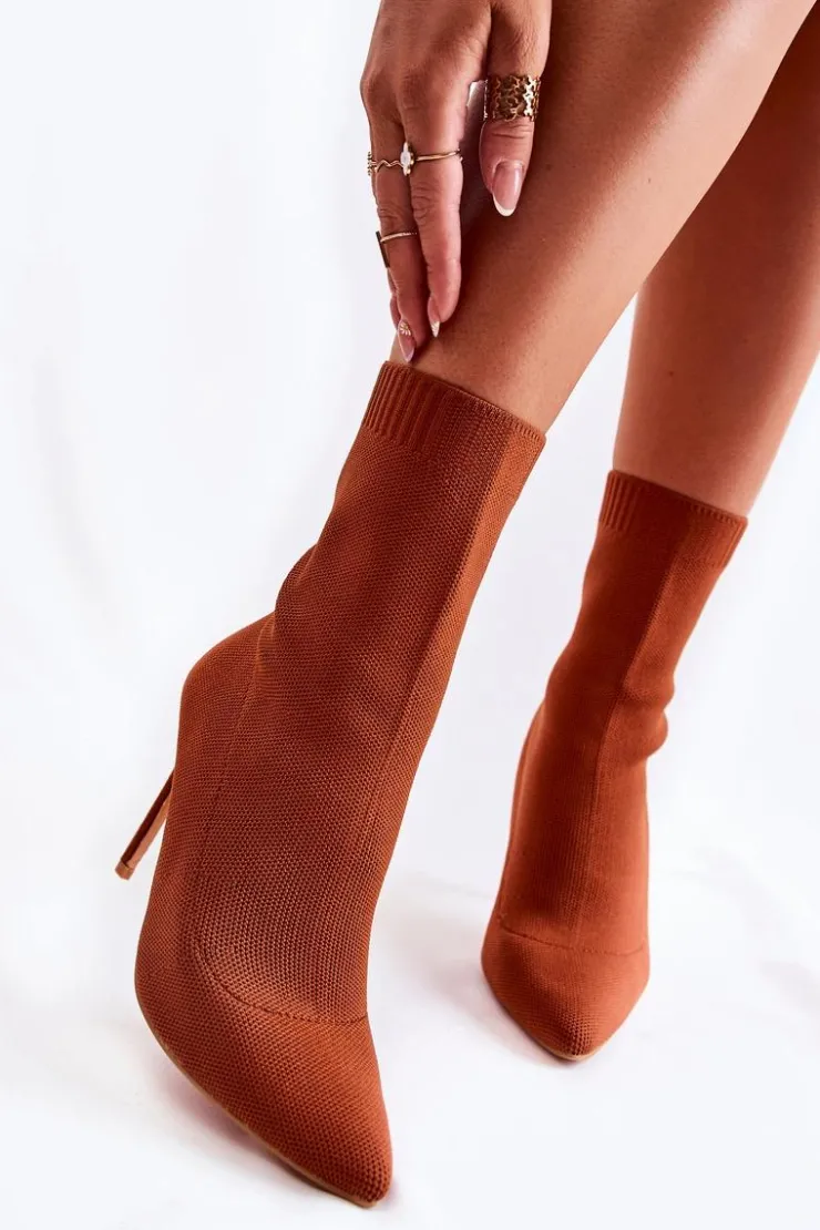 Botki posiadają modną, skarpetkową cholewkę za kostkę. Osadzone na obcasie typu szpilka. Nosek w szpic świetnie wysmukli stopę. Model wsuwany. Wykonane z elastycznego materiału, który idealnie dopasuje się do nogi. Wkładka z eko skóry. Buty posiadają usztywniany zapiętek. Idealne buty do jeansów czy dłuższych, koszulowych sukienek.Przy wyborze rozmiaru prosimy sugerować się tabelą rozmiarów.