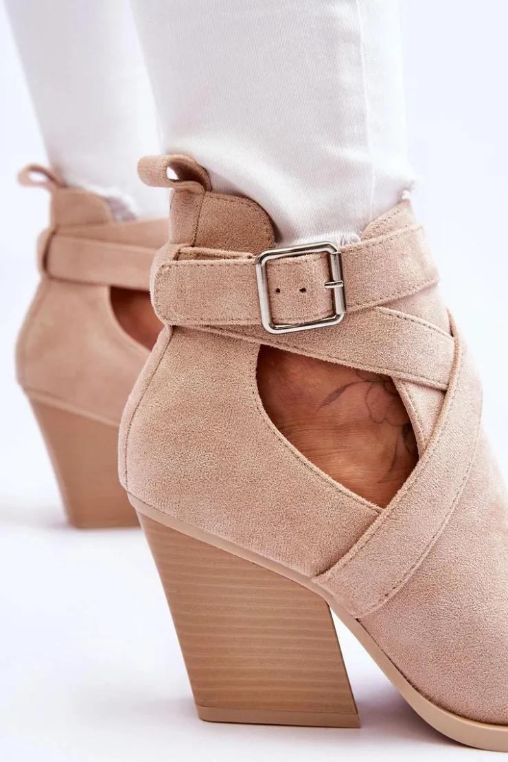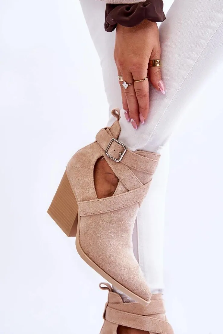Botki o fasonie kowbojek zostały wykonane z miękkiego eko zamszu. Dodatkowo posiadają usztywniany zapiętek. Buty zostały osadzone na obcasie w postaci słupka. Cholewka z wycięciami po bokach jest charakterystyczna dla tego modelu. Te botki będą świetnym uzupełnieniem wielu stylizacji. Przy wyborze rozmiaru prosimy sugerować się tabelą rozmiarów.