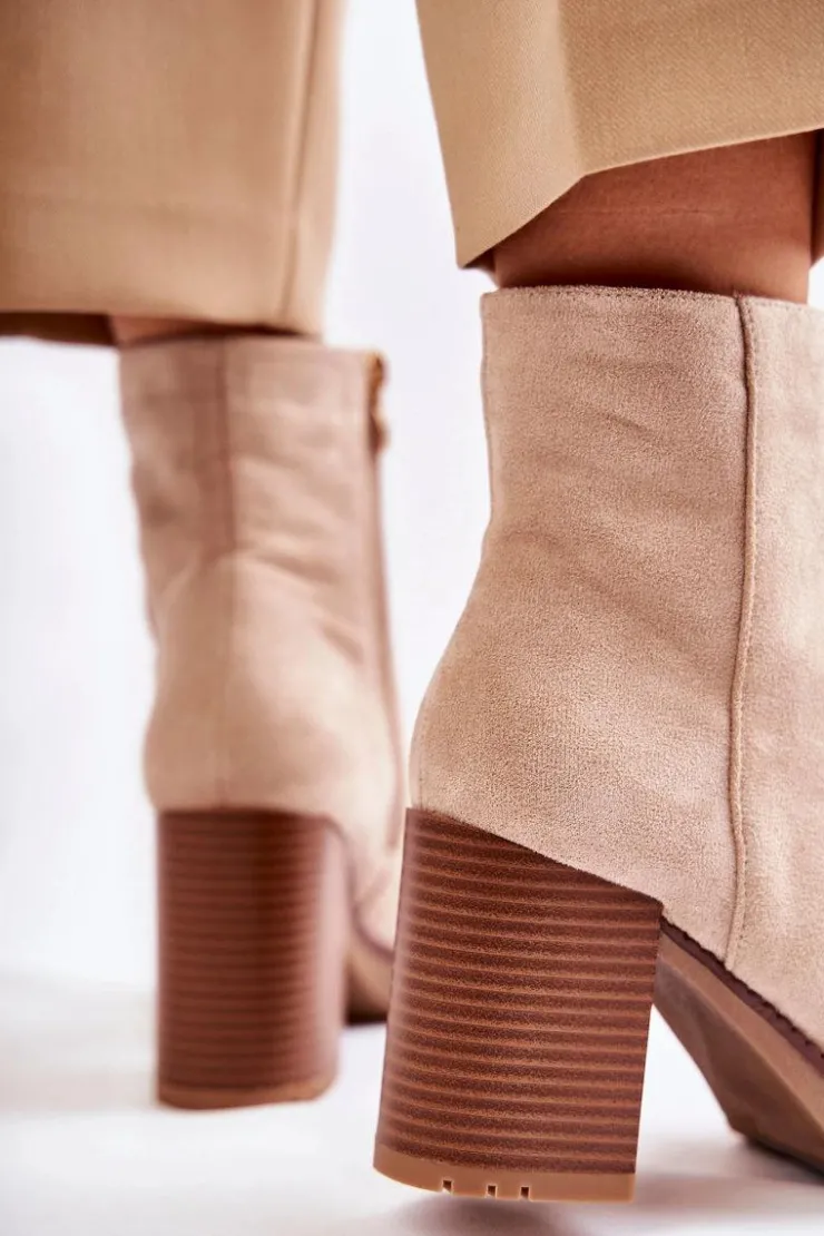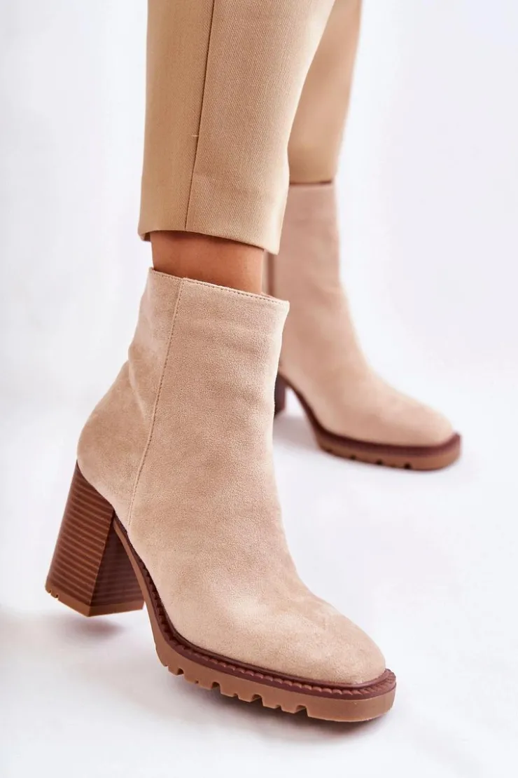 Świetne botki wykonane z miłego w dotyku eko zamszu. Model osadzony na delikatnej platformie i obcasie w postaci słupka. Buty te posiadają lekko kwadratowy nosek oraz usztywniany zapiętek. Cholewka za kostkę posiada suwak ułatwiający zakładanie obuwia. Model wygodny i stabilny. Świetnie będą komponować się plisowanymi spódnicami. Przy wyborze rozmiaru prosimy sugerować się tabelą rozmiarów.