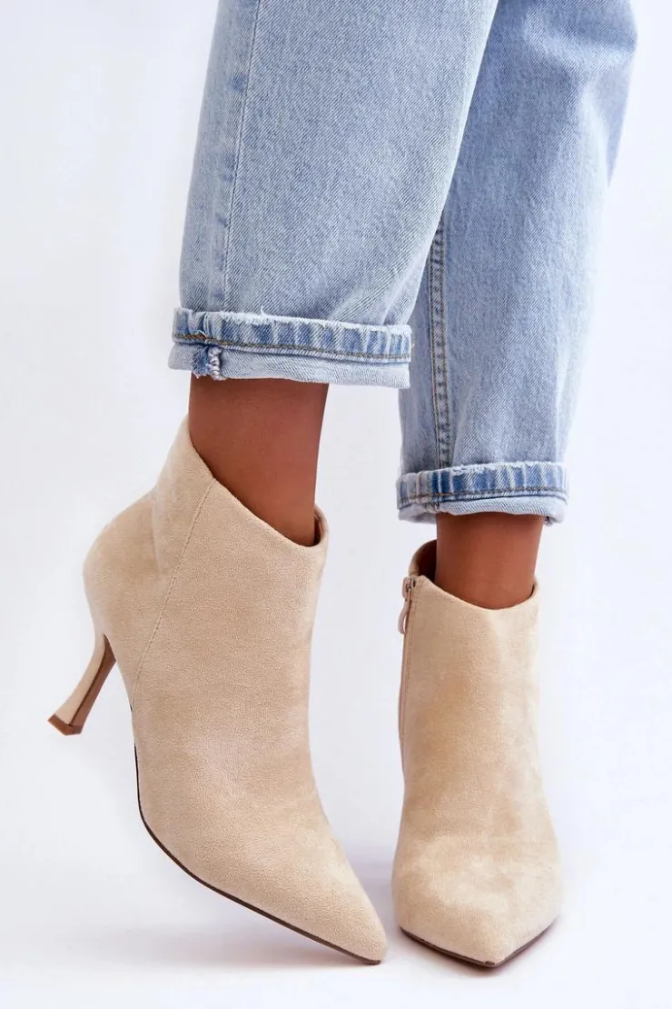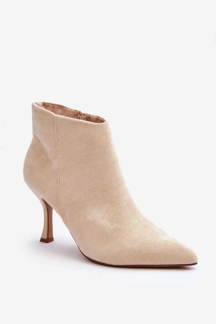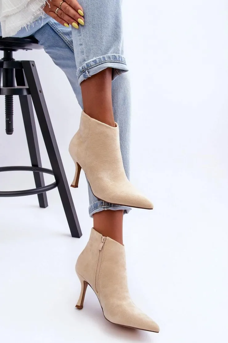 Eleganckie botki damskie zostały wykonane z eko zamszu. Model osadzony na obcasie w postaci szpilki, z noskiem w szpic świetnie wysmukli nogi. Botki są zapinane z boku na suwak. Zapiętek w tych botkach jest usztywniany. Model ten świetnie sprawdzi się w wielu stylizacjach np.: do sukienek, spódnic czy spodni. Te botki koniecznie powinny znaleźć się w Twojej szafie! Przy wyborze rozmiaru prosimy sugerować się tabelą rozmiarów.