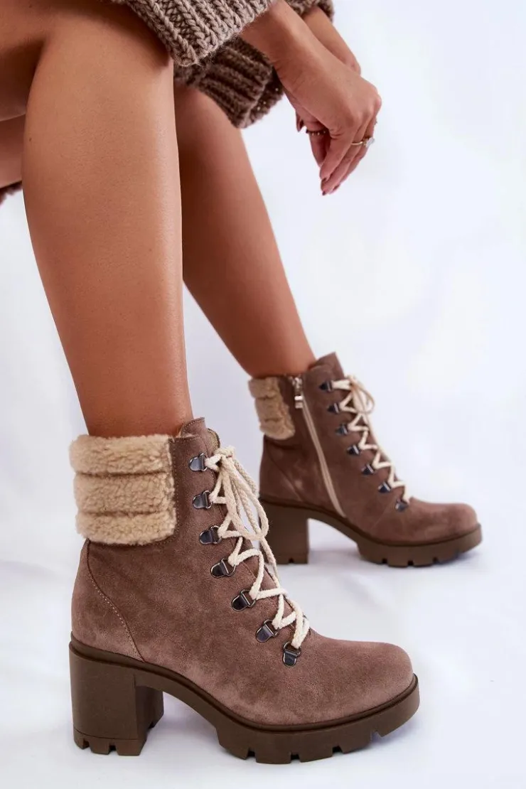 Wyjątkowe, damskie botki zostały wykonane z wysokiej jakości naturalnych skór. Model posiada ocieplenie w postaci naturalnej wełny. Dodatkowo botki zostały przyozdobione kożuszkiem z zewnątrz. Zapiętek jest usztywniany. Model ten posiada sznurowanie oraz suwak z boku cholewki. Osadzone na masywnym obcasie w postaci słupka oraz platformie ze żłobieniami. Przy wyborze rozmiaru prosimy kierować się tabelą rozmiarów