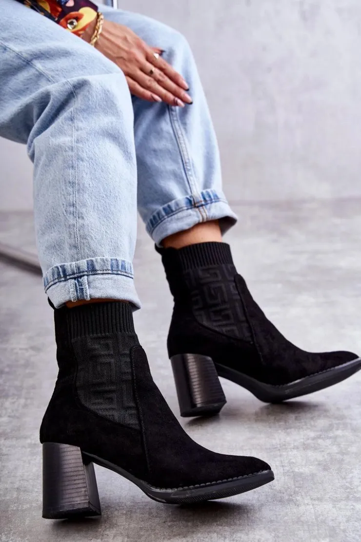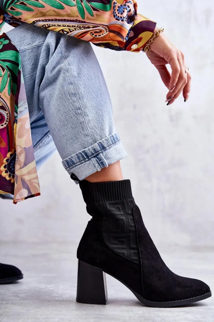 Świetne botki damskie o modnym fasonie. Wykonane z połączenia eko zamszu oraz elastycznej tkaniny. Model ten osadzono na obcasie w postaci masywnego słupka. Nosek jest kwadratowy. Botki posiadają usztywniany zapiętek. W środku są częściowo ocieplone kocem obuwniczym. Wykorzystasz je w wielu sytuacjach: do pracy, na spotkanie ze znajomymi czy na randkę. Przy wyborze rozmiaru prosimy sugerować się tabelą rozmiarów.