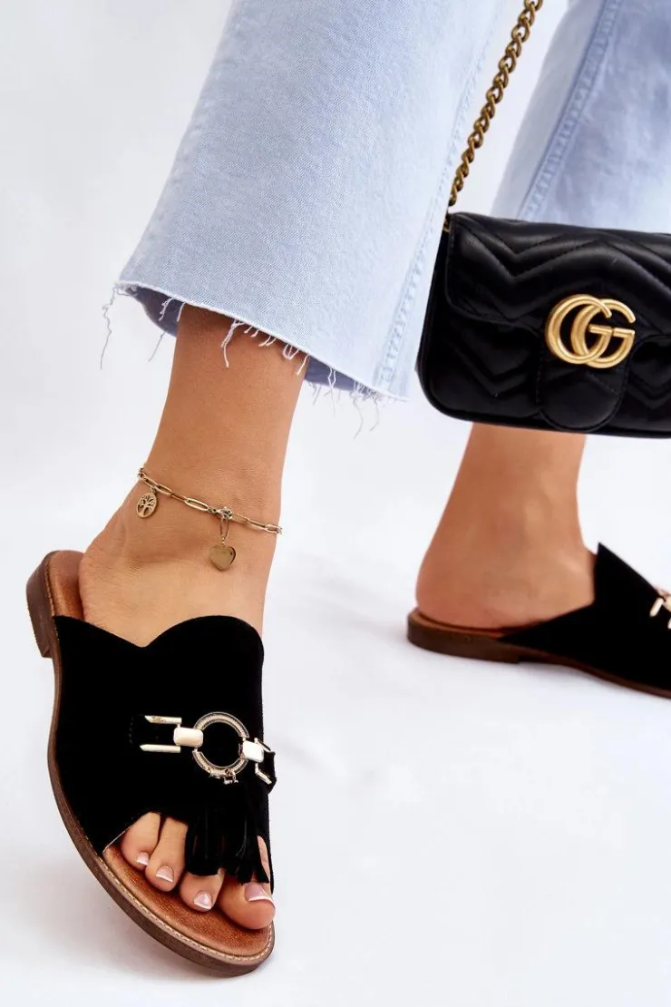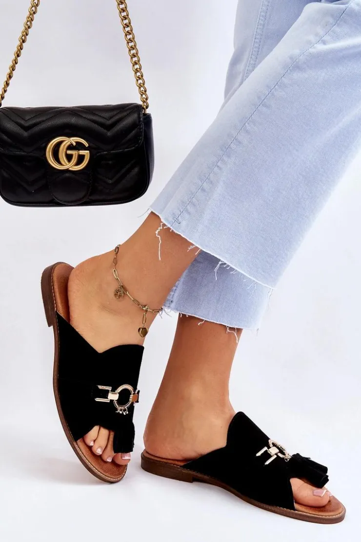 Wyjątkowe, damskie klapki od polskiej firmy Lewski Shoes. Zostały wykonane z wysokiej jakości skór naturalnych. Posiadają na przodzie ozdobę z tworzywa sztucznego oraz frędzelki. Miękka wkładka jest niezwykle komfortowa podczas użytkowania. Klapki osadzono na płaskim obcasie. Ten model powinien być Twój! Przy wyborze rozmiaru prosimy sugerować się tabelą rozmiarów.