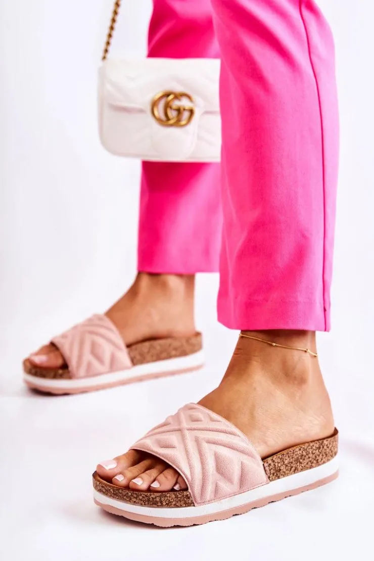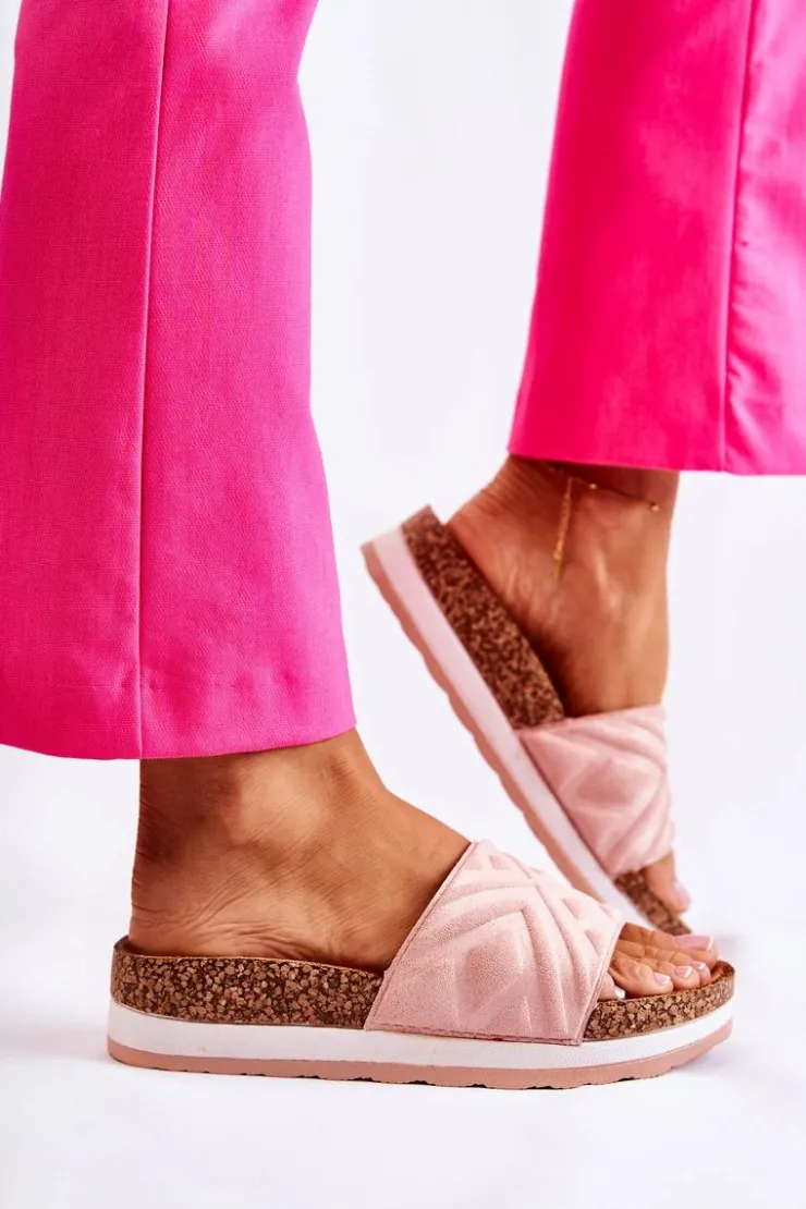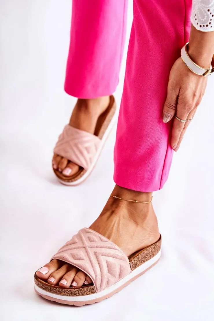 Modne klapki damskie wykonane z miłego w dotyku eko zamszu. Model osadzone na masywnej korkowej platformie z podeszwą z tworzywa sztucznego. Wkładka jest profilowana i także wykonana z eko zamszu, która zapewni komfort podczas użytkowania. Model z odkrytym noskiem. Świetny fason na upalne dni, który powinnaś mieć w swojej szafie! Przy wyborze rozmiaru prosimy sugerować się tabelą rozmiarów.