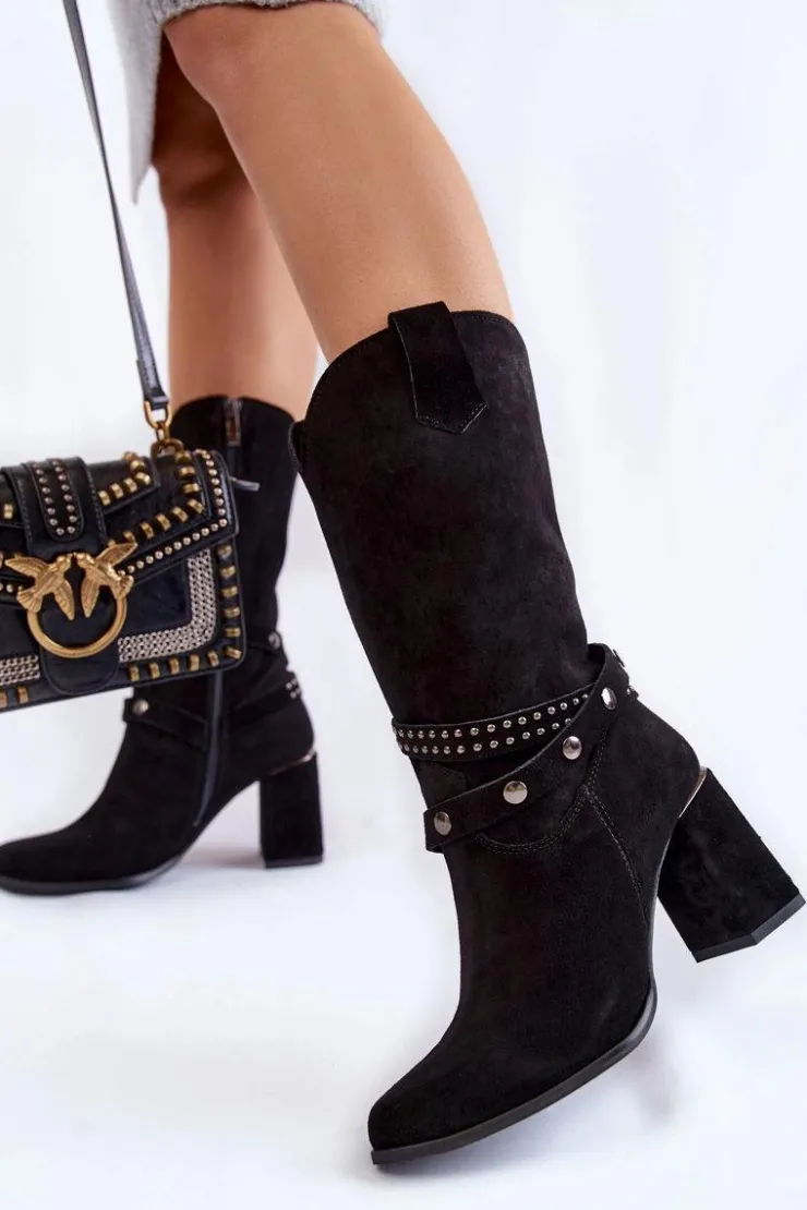 Damskie kozaki zostały wykonane z wysokiej jakości skór naturalnych. Posiadają suwak na całej długości cholewki oraz usztywniany zapiętek. Osadzone na obcasie w postaci klocka. Cholewka do połowy łydki została ozdobiona paskami z ćwiekami. Wkładka ocieplona miękkim kocem obuwniczym. Klasyczny fason sprawdzi się do wielu stylizacji! Przy wyborze rozmiaru prosimy kierować tabelą rozmiarów.