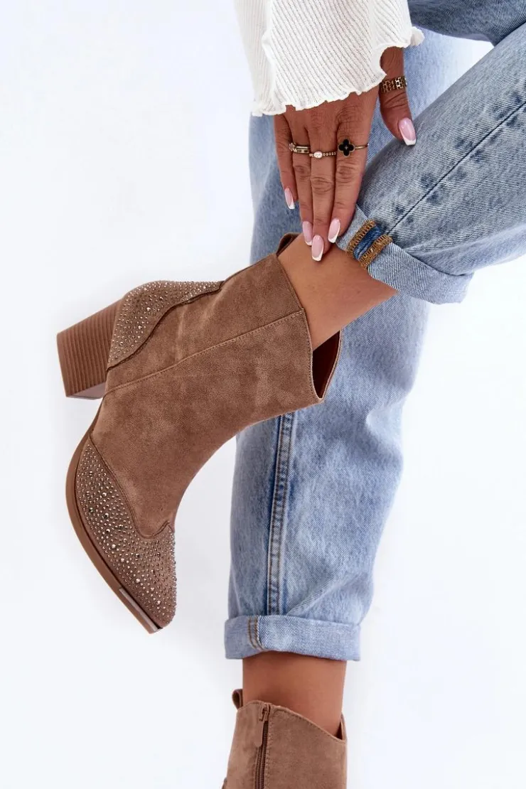 Botki w stylu kowbojek wykonane z eko zamszu. Osadzone na obcasie w postaci słupka. Noski w szpic optycznie wysmuklą nogi. Cholewka ozdobiona małymi dżetami. Środek ocieplony kocem obuwniczym. Model zapinany na suwak. Przy wyborze rozmiaru prosimy sugerować się tabelą rozmiarów.