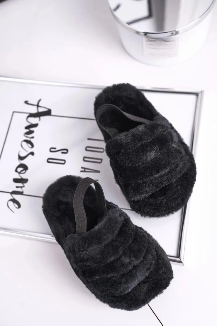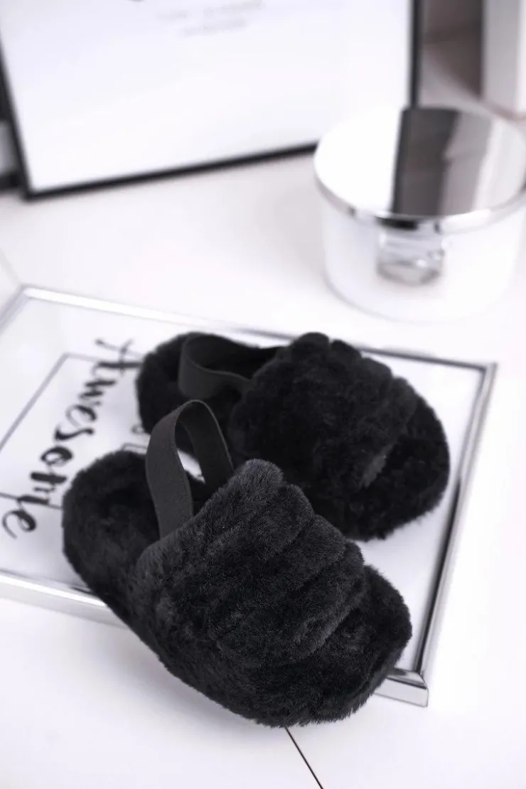 Damskie Boto Dziecięce klapki z futerkiem i gumką czarne Fluffy