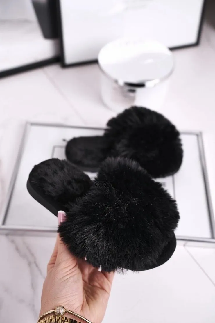Damskie Boto Dziecięce Papcie Klapki z Futerkiem Czarne Snow Ball