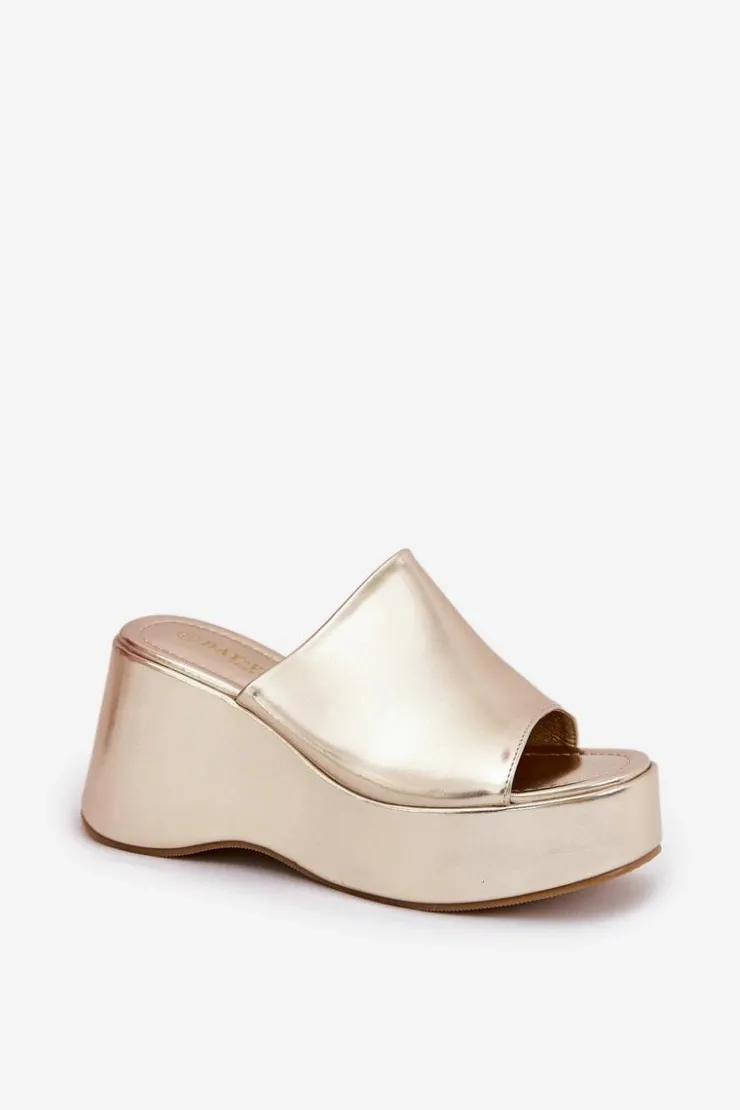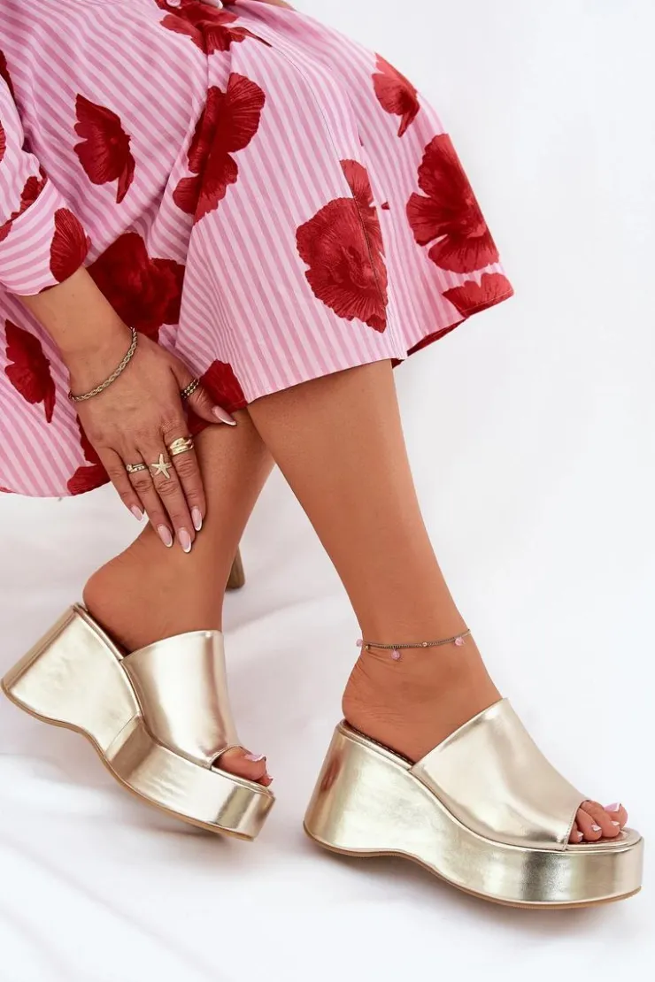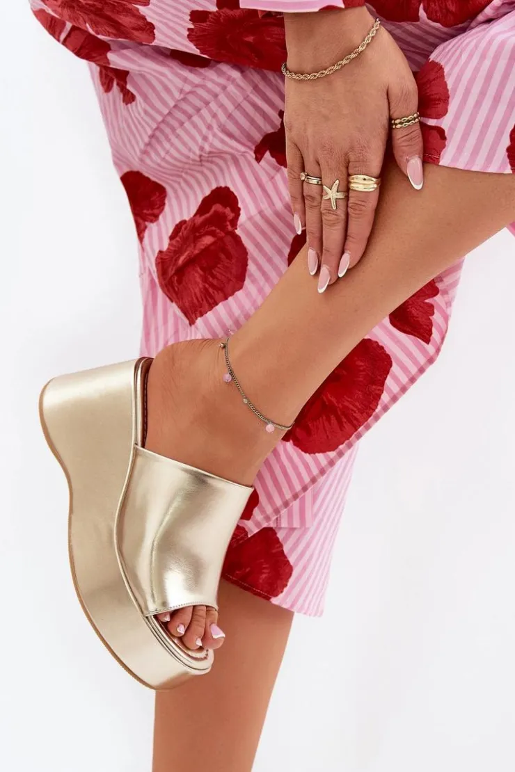 Stylowe klapki wykonane z eko skóry. Osadzone na platformie i koturnie, zapewniają stabilność i komfort przez cały dzień, jednocześnie optycznie wydłużając nogi i podkreślając sylwetkę. Miękka wkładka gwarantuje przyjemność noszenia, zapewniając odpowiednią amortyzację i wygodę podczas chodzenia. Te klapki doskonale sprawdzą się w codziennych stylizacjach, idealne do letnich sukienek, spódnic czy spodni. Przy wyborze rozmiaru prosimy sugerować się tabelą rozmiarów.